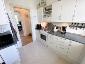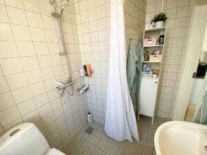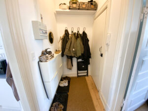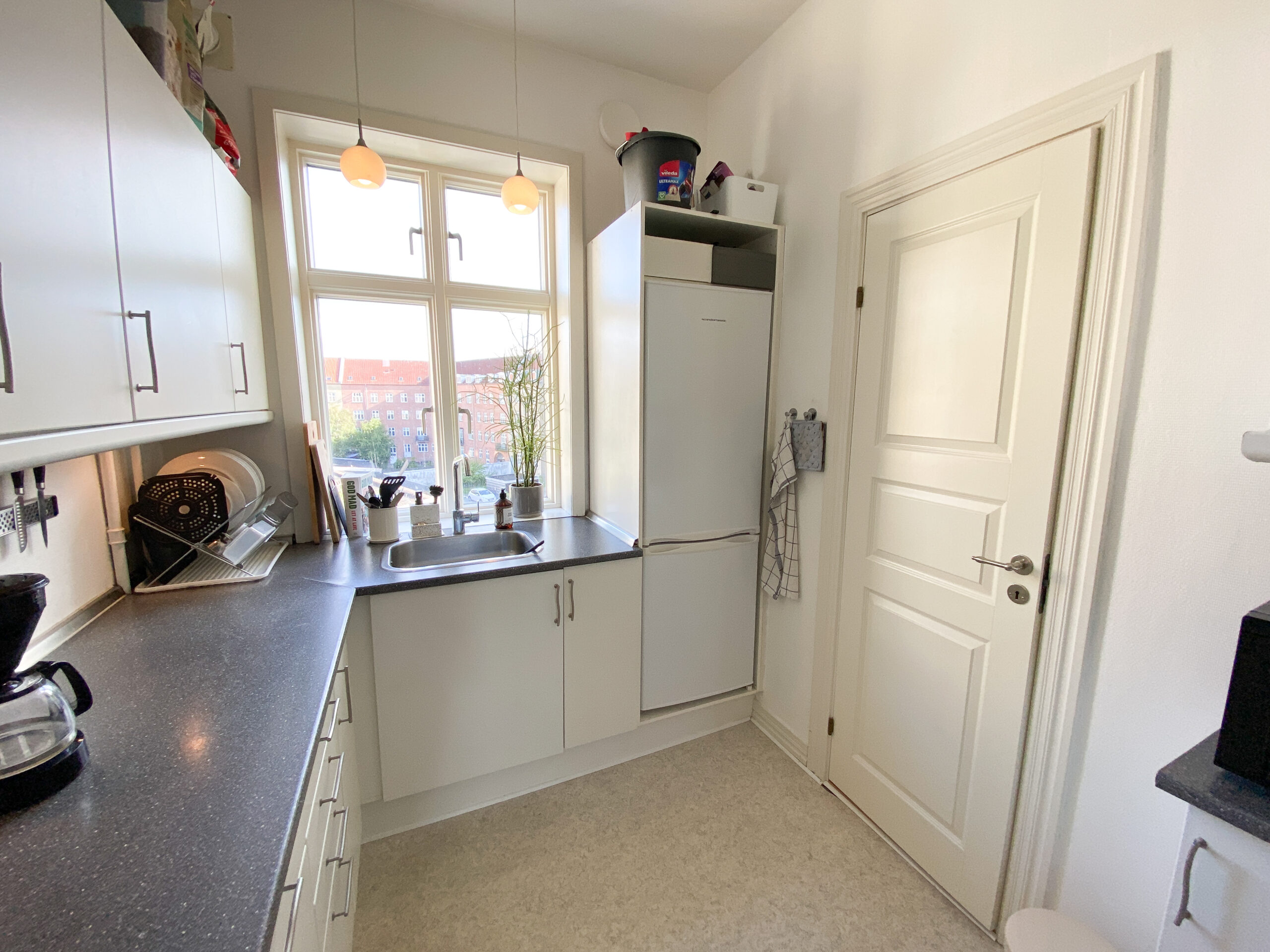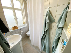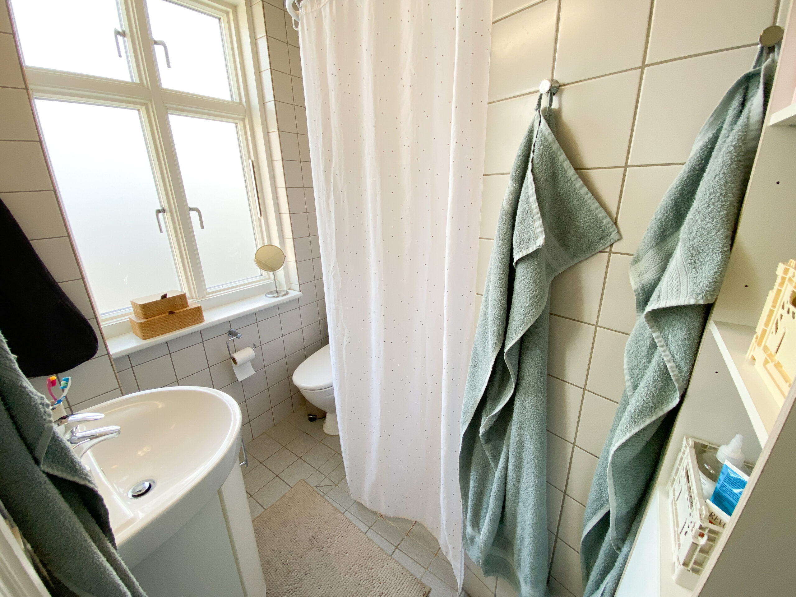 Når du træder ind i lejligheden, kommer du ind i en fordelingsgang, hvor der er en masse hylder med plads til sko og knager til overtøj. Herfra kan du gå til højre ind i køkkenet, som er fint hvidt med masser af skabsplads. Fra køkkenet har du adgang til badeværelset, som er med separat brus og i fine grå fliser.