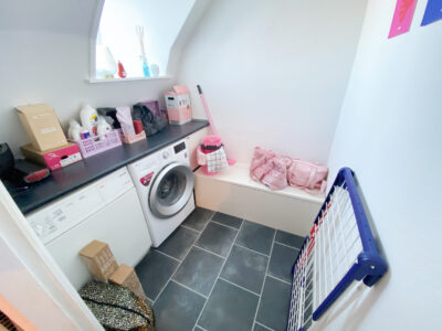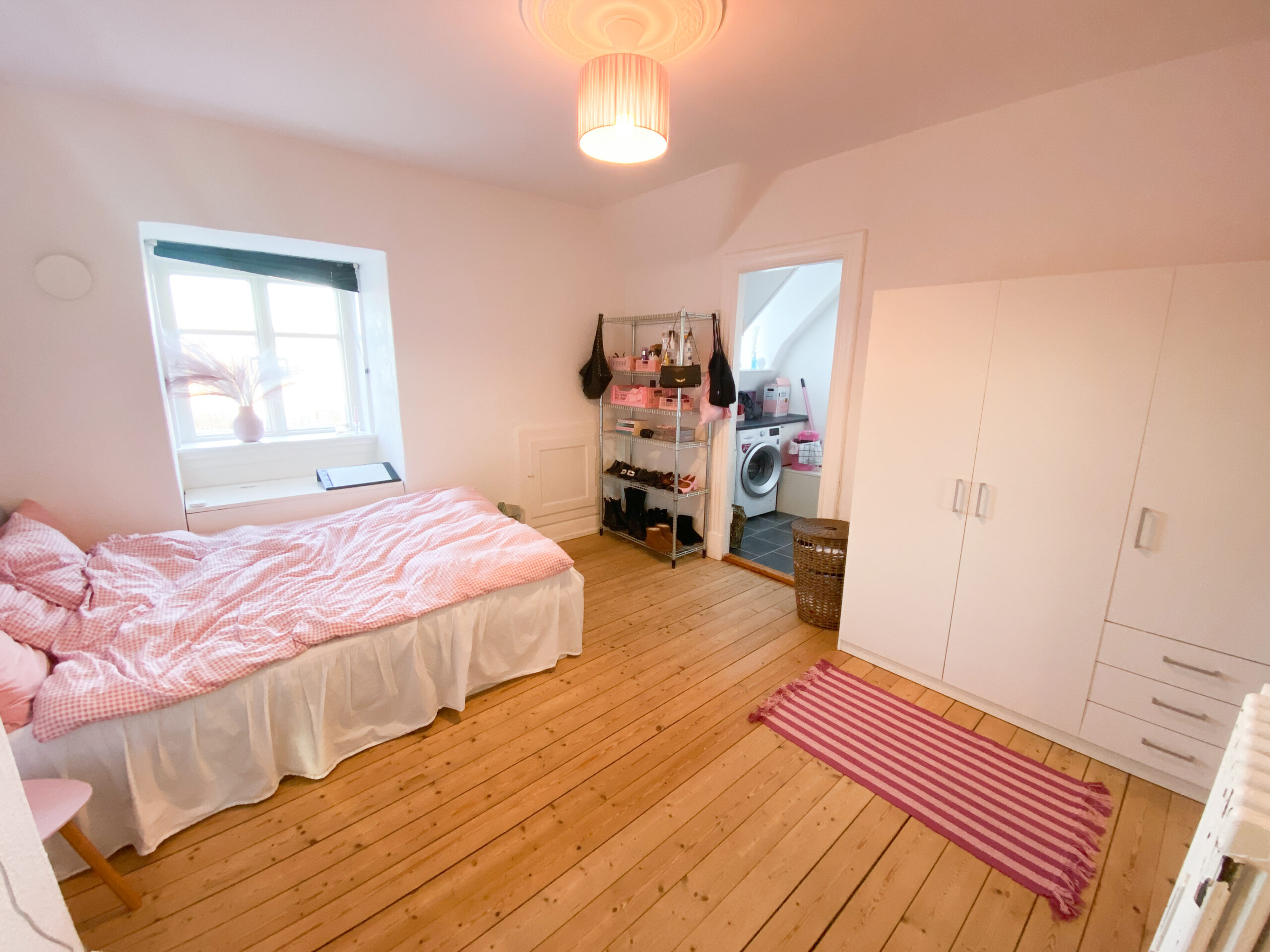 I det store soveværelse finder du masser af plads til afslapning og ro. De rå trægulve tilføjer en unik karakter og varme til rummet, og de store vinduer giver masser af naturligt lys, der skaber en behagelig atmosfære. Herfra er der et rum med vaskemaskine og tørretumbler og ekstra opbevaring.