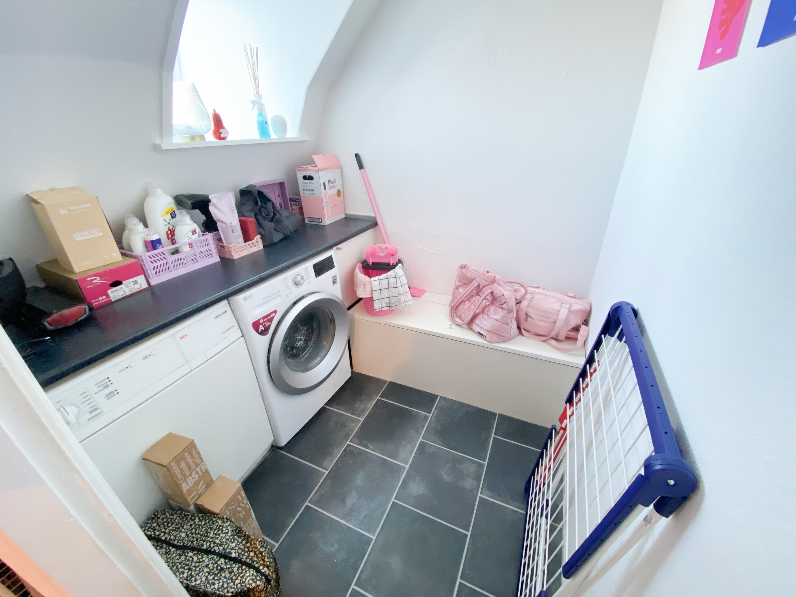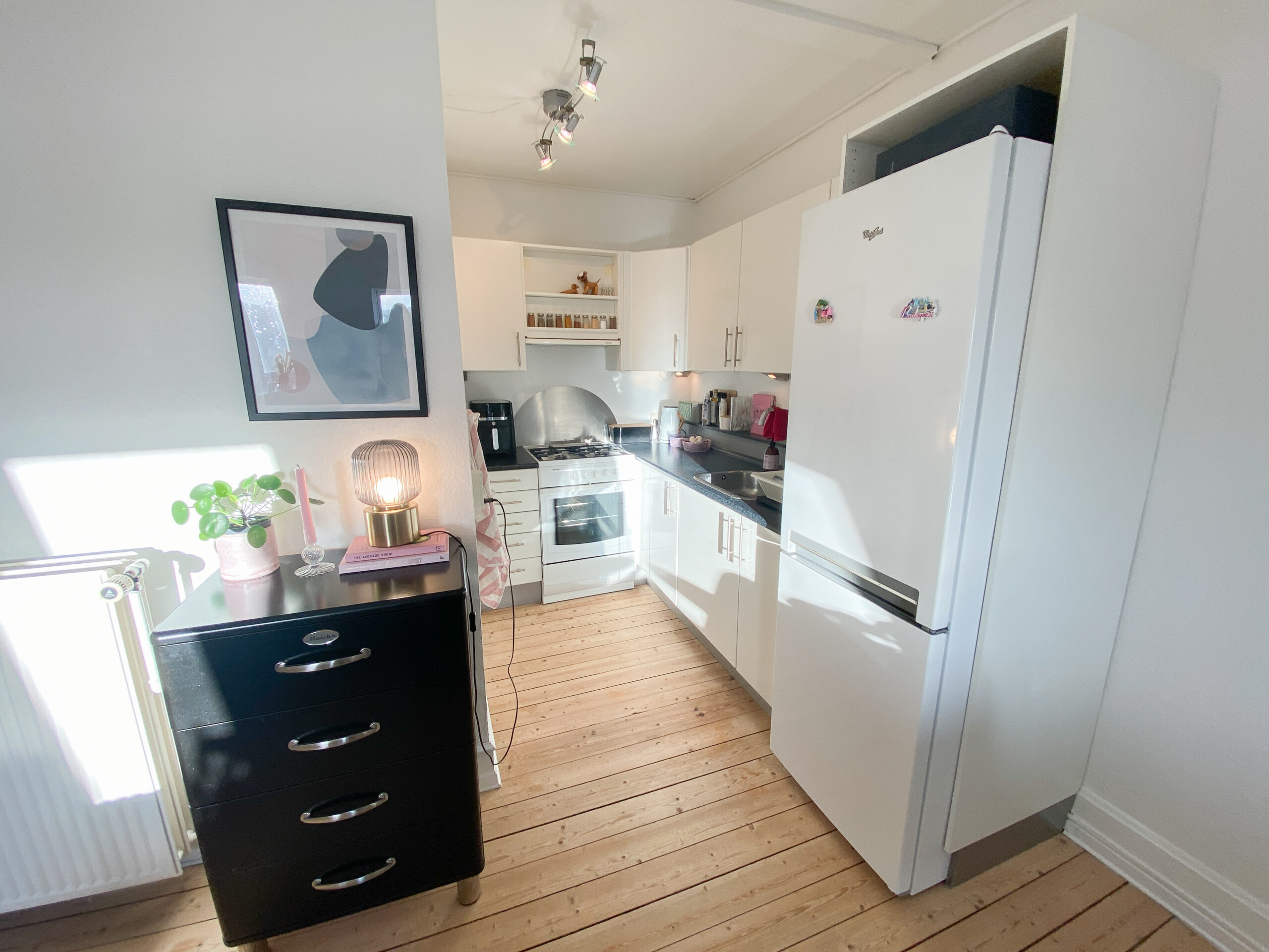 Lejligheden har en nærmest hule-agtig følelse, der tilføjer en særlig charme, samtidig med at den stadig er lys takket være de store vinduer i stuen. Du får det bedste fra begge verdener – en hyggelig og unik bolig, der stadig føles rummelig og indbydende.