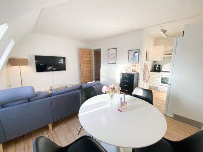 Køkken-alrummet er et hyggeligt sted at tilbringe tid i med sit fine hvide køkken, der tilføjer et moderne touch til lejligheden. Her kan du nyde dine måltider og samtidig have plads til at socialisere og slappe af.