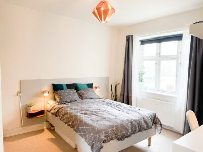 Afslutningsvis fører gangen dig til soveværelset, der indbyder til ro og afslapning. Her finder du en stor dobbeltseng, et rummeligt klædeskab og et skrivebord, der giver dig mulighed for at arbejde eller studere komfortabelt.
