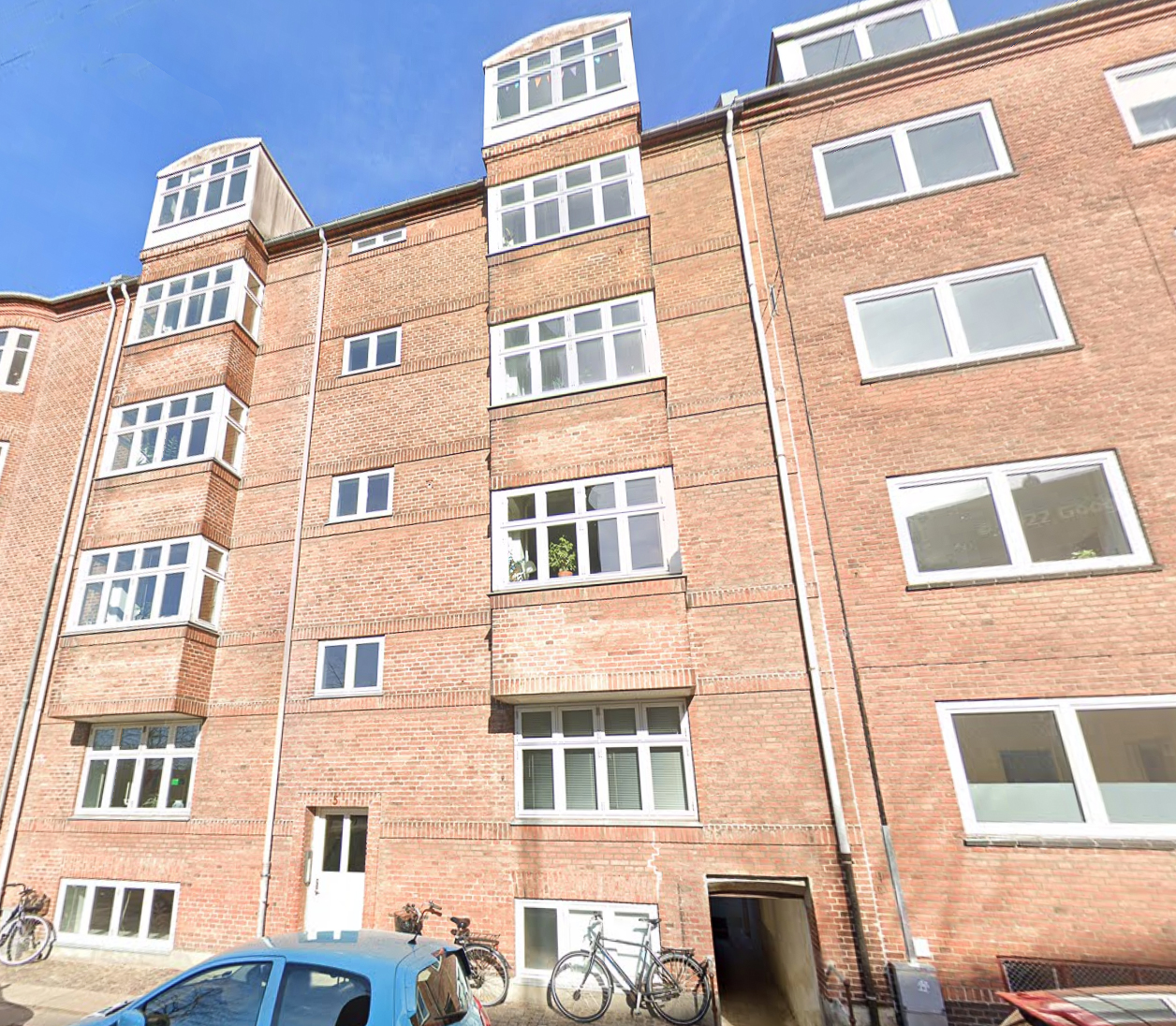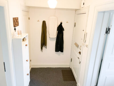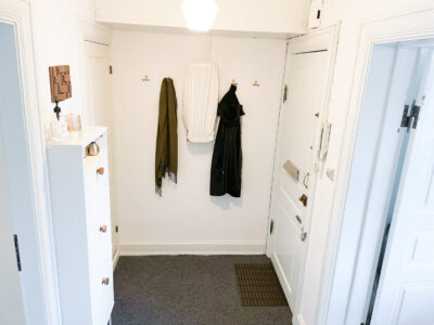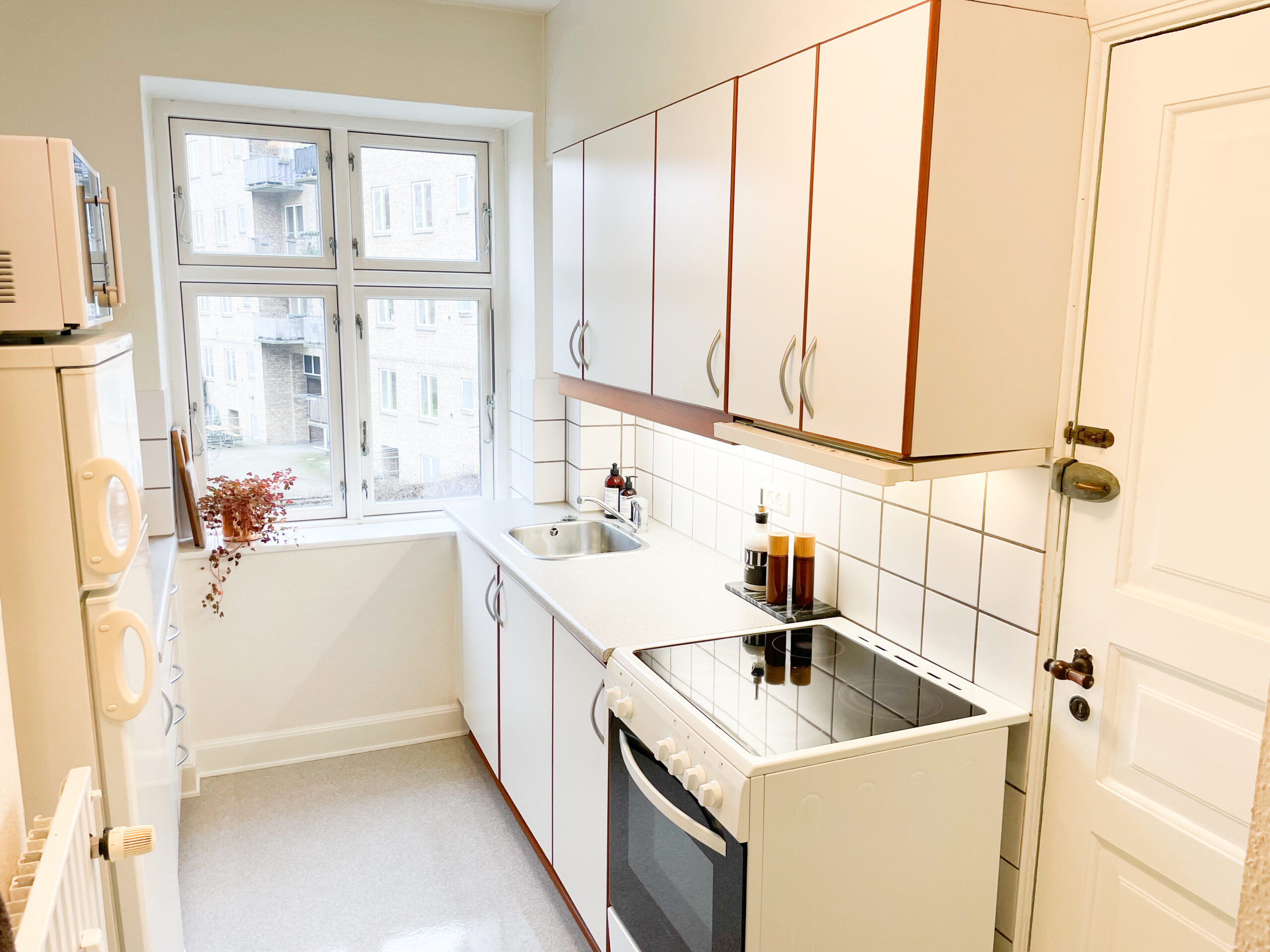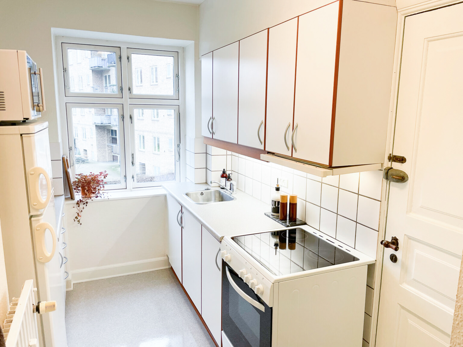 Fra gangen leder vejen dig til det pænt hvide køkken, hvor bordplads og skabsplads er rigeligt til rådighed. Bemærk venligst, at køleskabet ikke er inkluderet i lejligheden. En dør fører dig ud til bagtrappen, som giver adgang til det fælles vaskeri og depotrum, hvor praktiske faciliteter er tilgængelige.