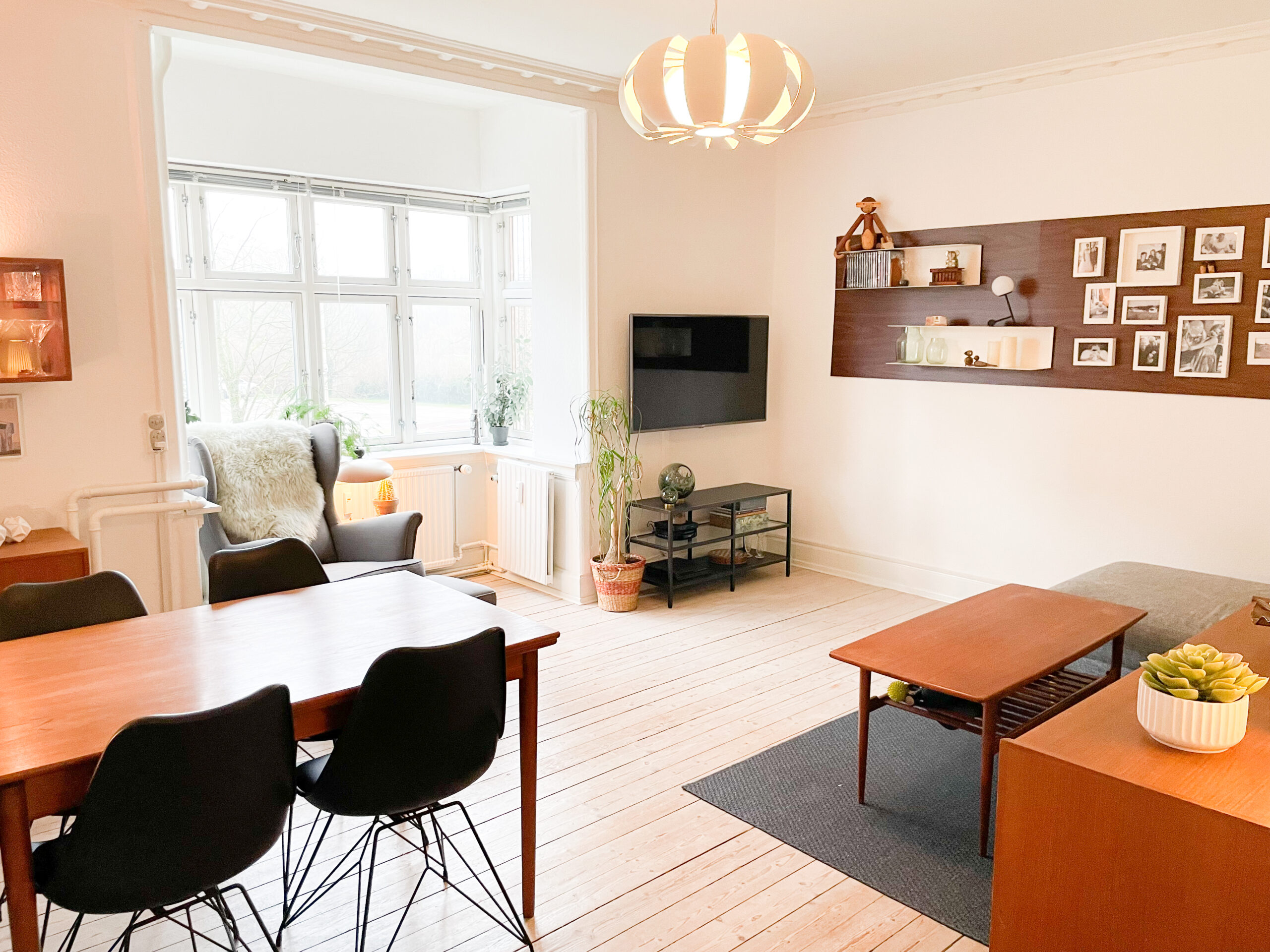 Videre ind i lejligheden møder du stuen, der stråler i et behageligt lys, takket være karnappen med et flot vinduesparti, der giver en betagende udsigt til Østre Anlæg. Denne karnap tilføjer også ekstra plads til rummet, hvilket gør det til det perfekte sted at slappe af eller underholde gæster.