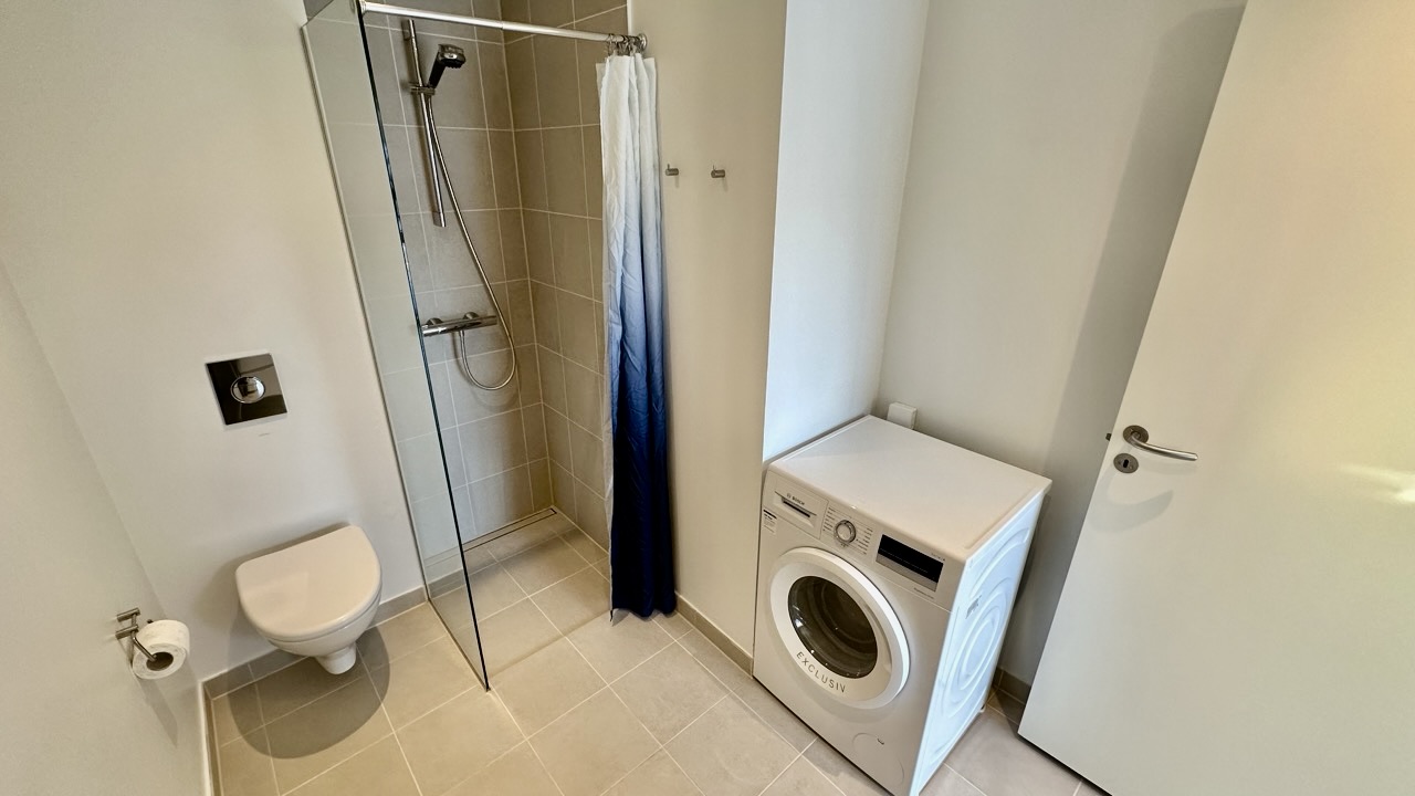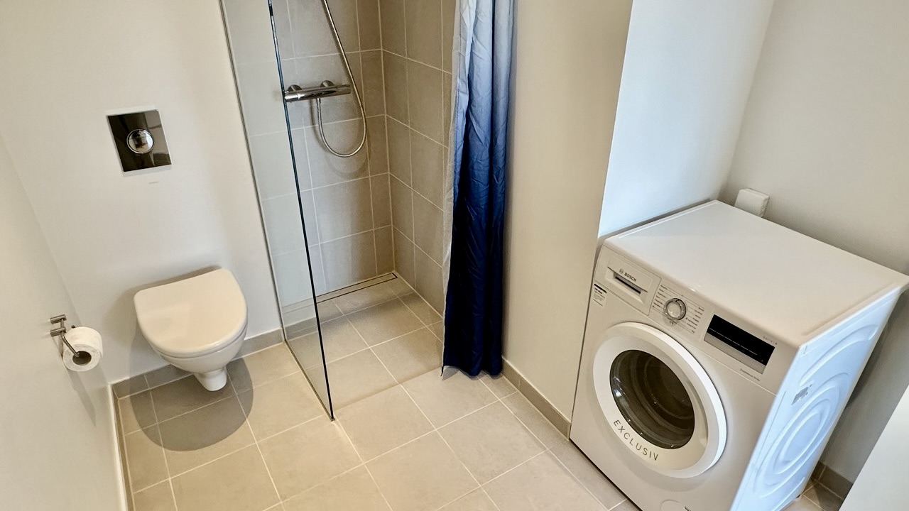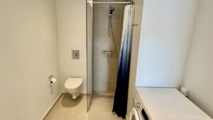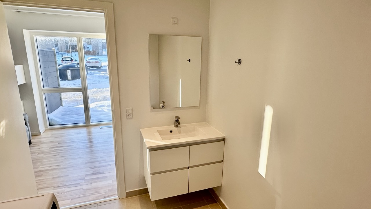 Lejligheden indeholder en entré med mulighed for at opsætte en knagerække til overtøj. I entréen finder du et rummeligt badeværelse, holdt i gråt og hvidt, med en separat bruseniche og forberedelse til installation af vaskemaskine.