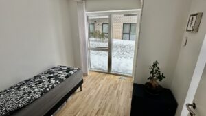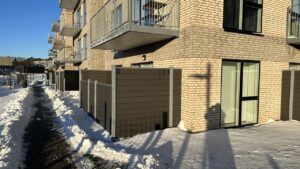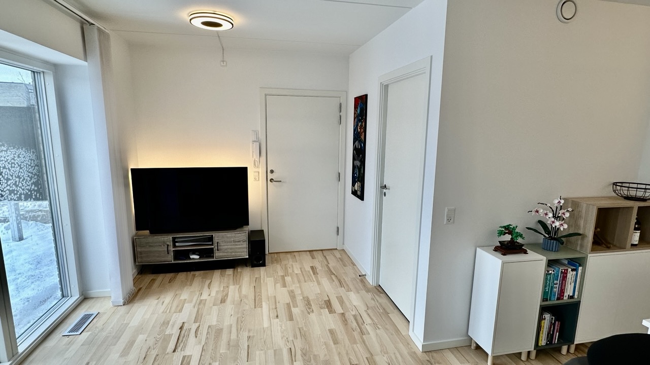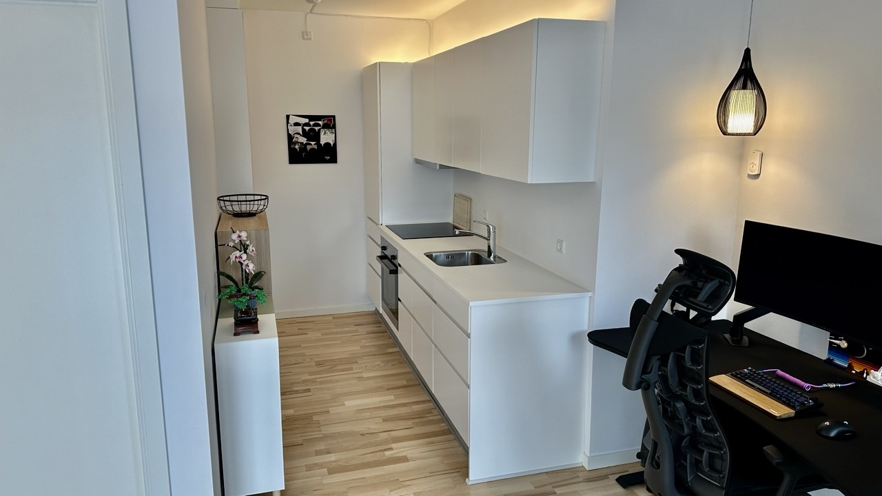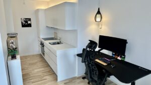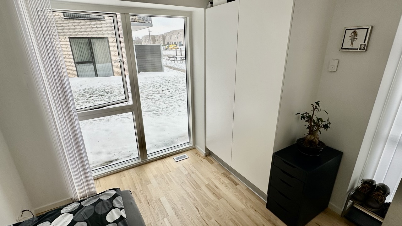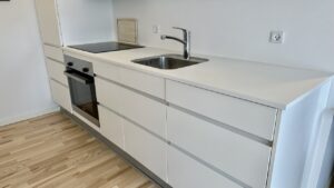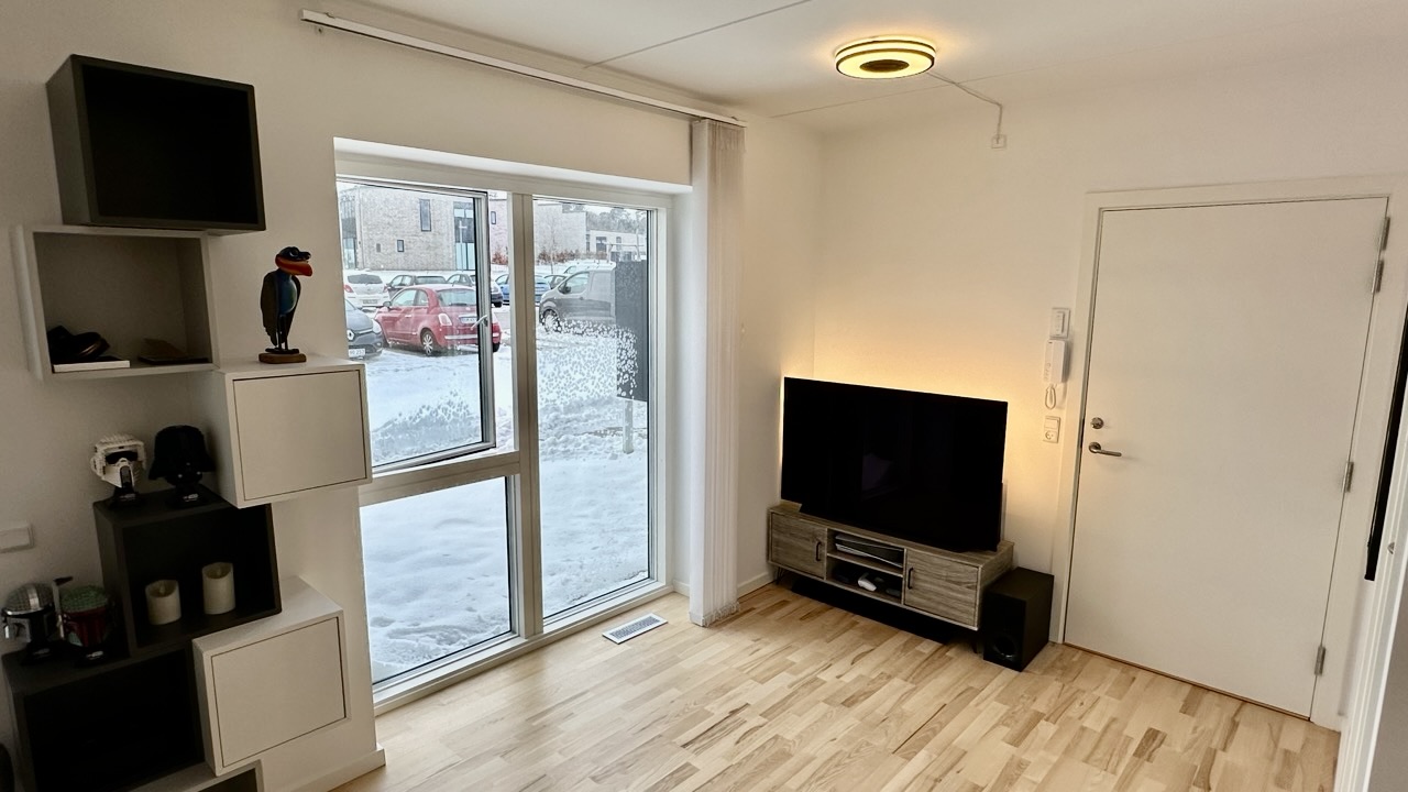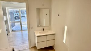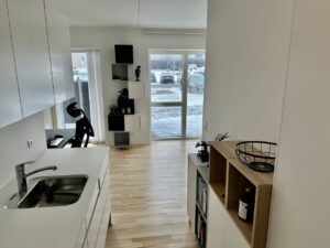 Fra entréen bevæger du dig ind i resten af lejligheden, der består af et mindre køkken-alrum med en elegant hvid køkkenblok og store vinduer, der lyser rummet op. Køkken-alrummet har adgang til en rummelig altan. Endelig er der soveværelset, der også har store vinduer og et dobbelt klædeskab.