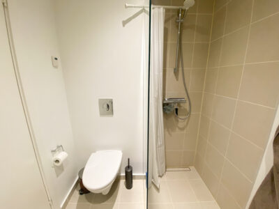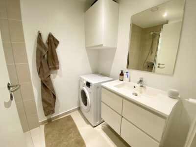 Når du træder ind i lejligheden kommer du ind i et entré hjørne, hvor man kan stille sko og hænge overtøj. Der er som man kan se på billederne plads til et konsolbord eksempelvis. Herfra kan du gå ind i badeværelset, som har en god håndvask med udtag til vaskemaskine og tørretumbler. Der er også separat brus.