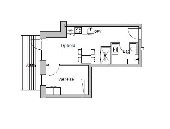 Fra entré hjørnet går man ind i et køkken alrum med et nyt køkken, og hvor man kan have et mindre spisebord samt et mindre stueområde. Fra køkkenalrummet kan man gå ud på altanen, som er rigtig god i størrelsen og med plads til et lille spisebord samt loungesofa m.m.