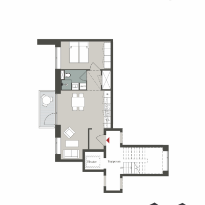 I den ene side har vi stuen, hvor der er et dejligt moderne køkken med opvaskemaskine, plads til et spisebord og et sofaarrangement. Fra stuen er der ligeledes udgang til en 5 kvm altan.