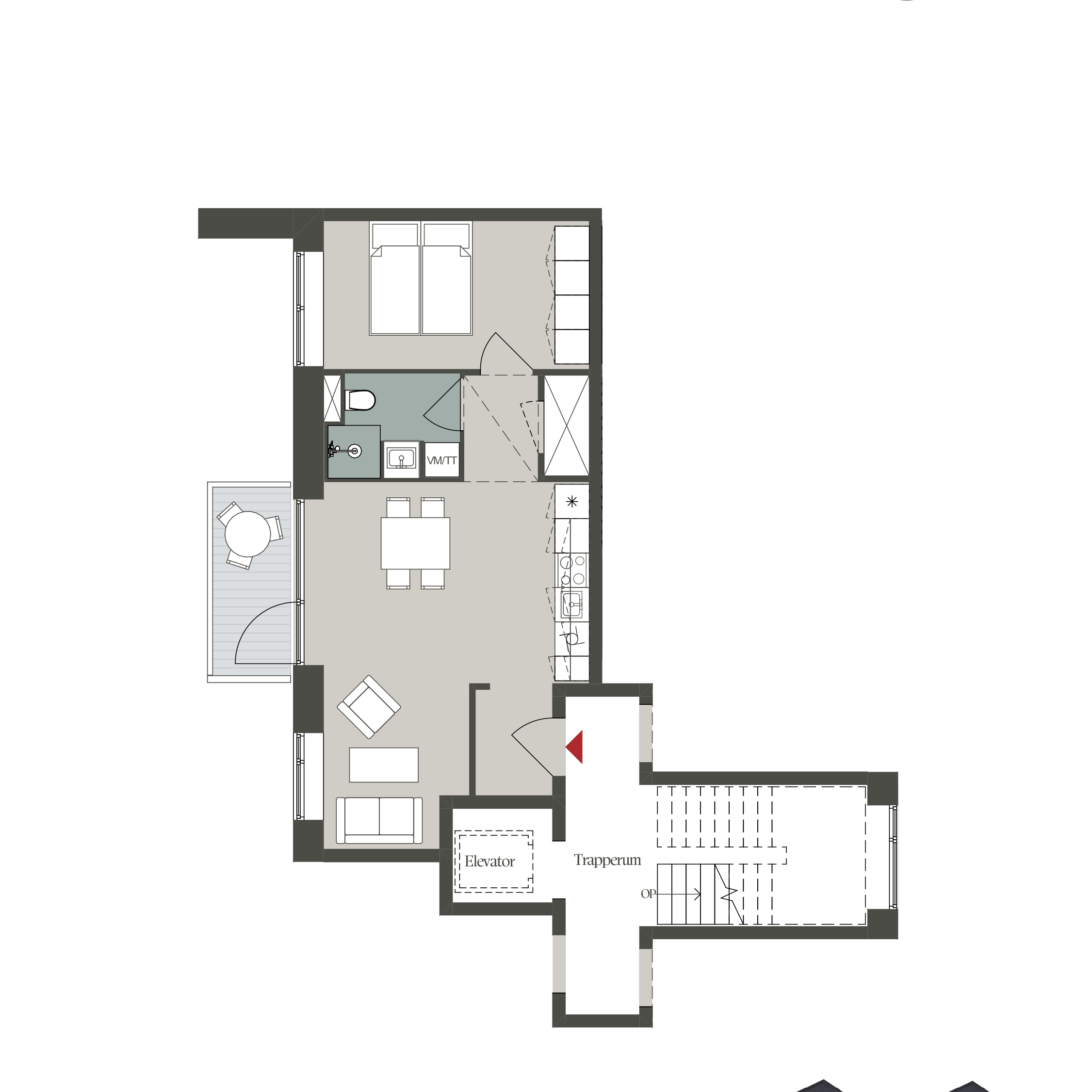 Lejligheden er bestående af en lille entré. Ligeud har vi badeværelset som er i lækre og moderne elementer og med en vaskesøjle.