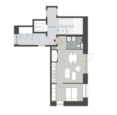 Lejligheden er bestående af en lille entré. Ligeud har vi badeværelset som er i lækre og moderne elementer og med en vaskesøjle.