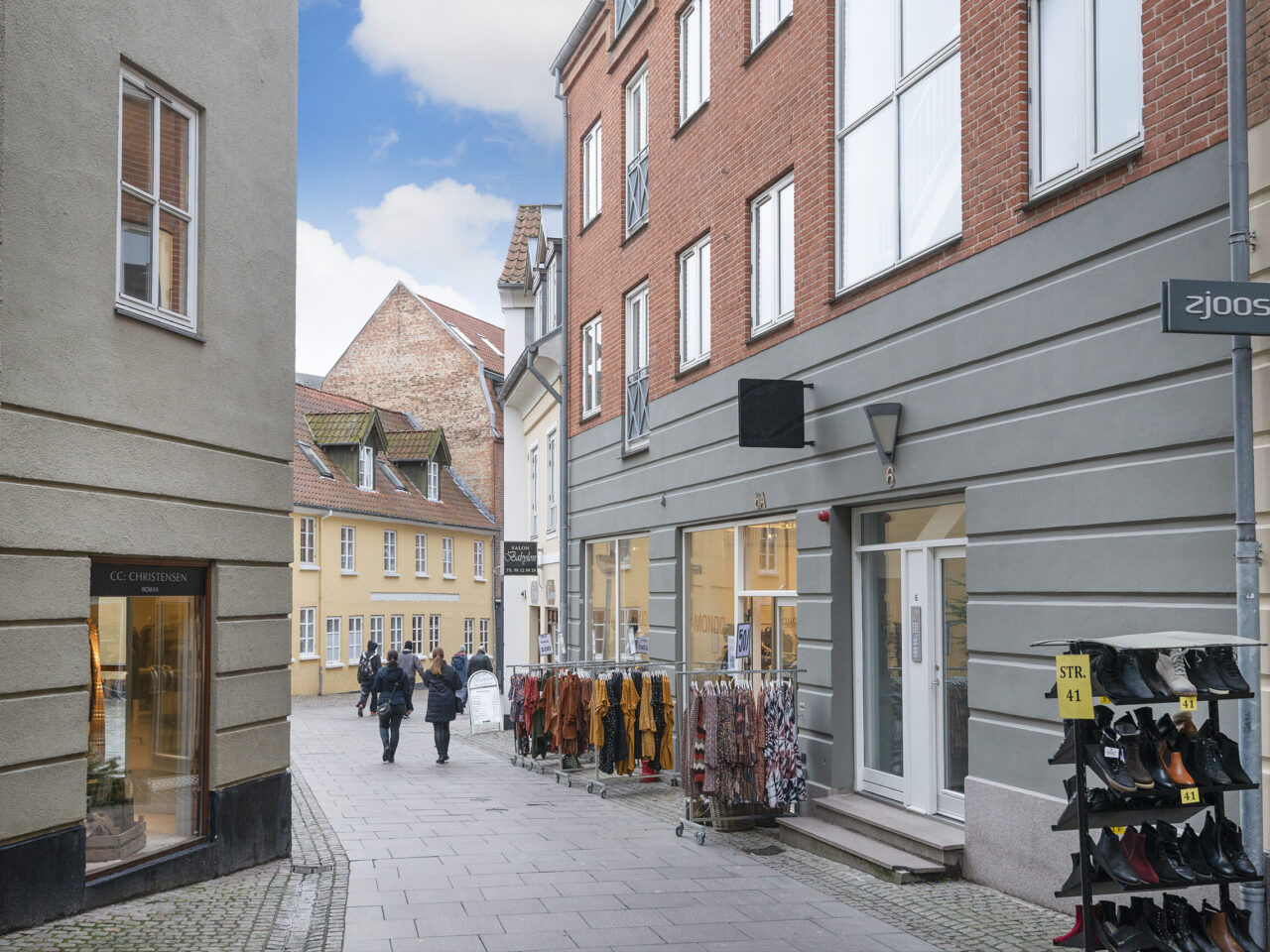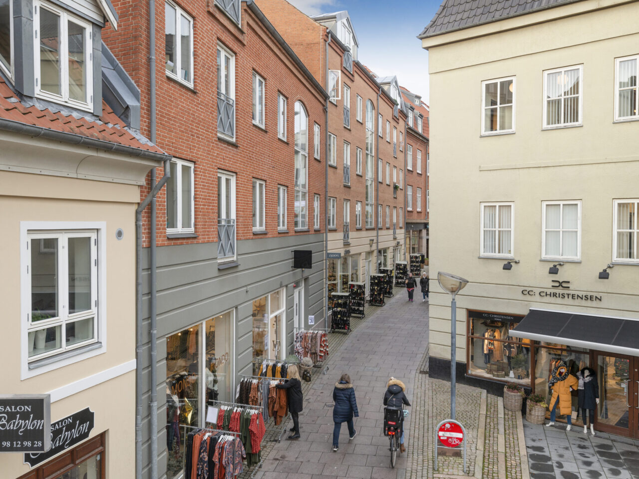 Ejendommen er beliggende i gågaden, hvilket betyder der er et lavt støjniveau, da der ikke er biltrafik ved ejendommen.