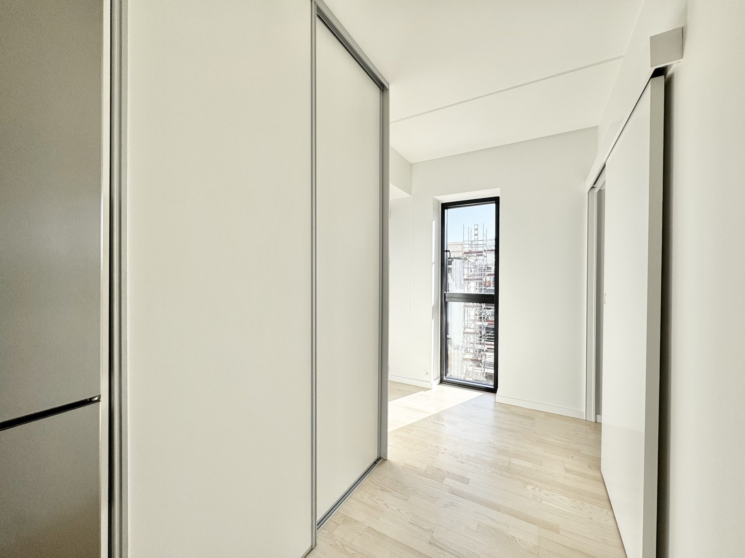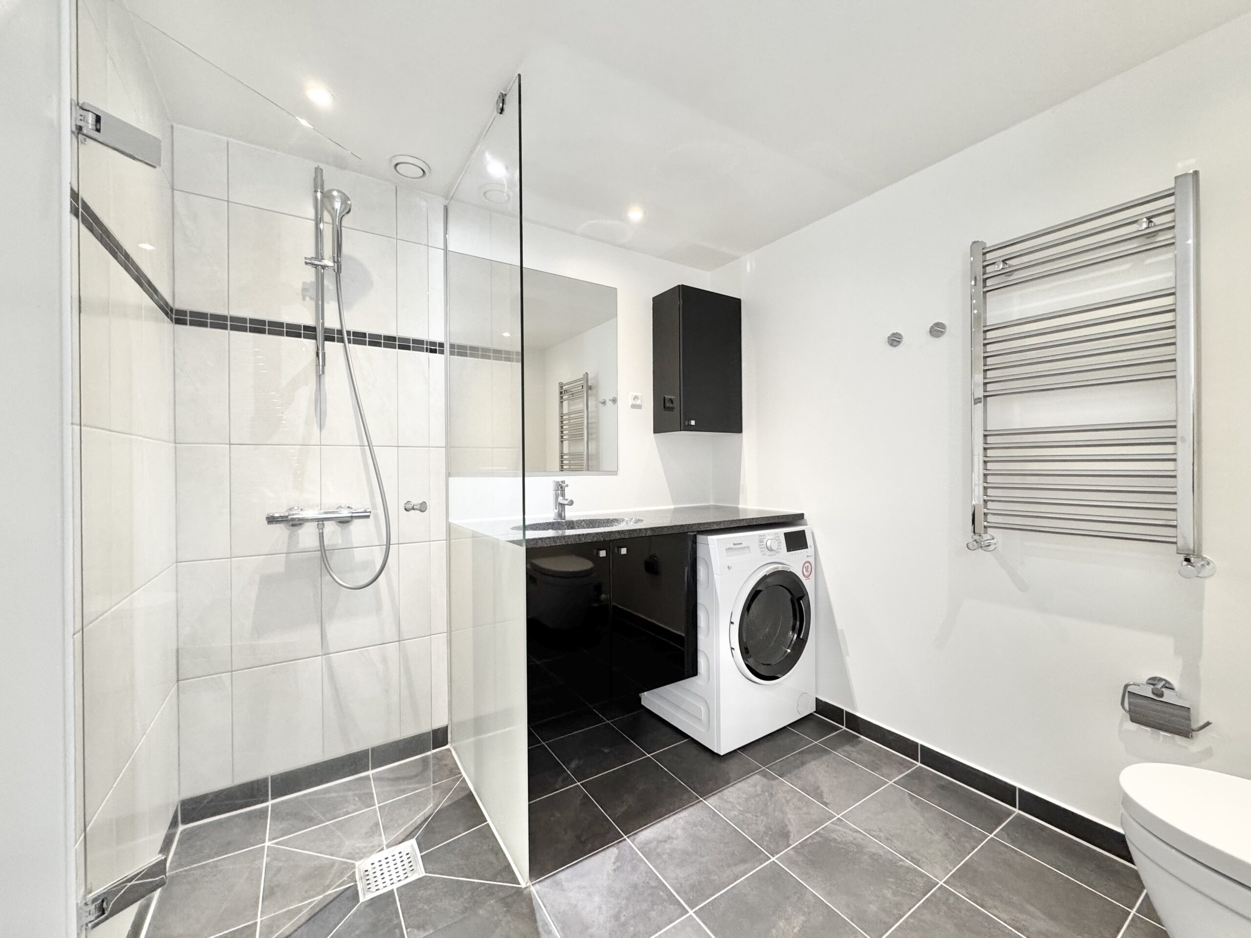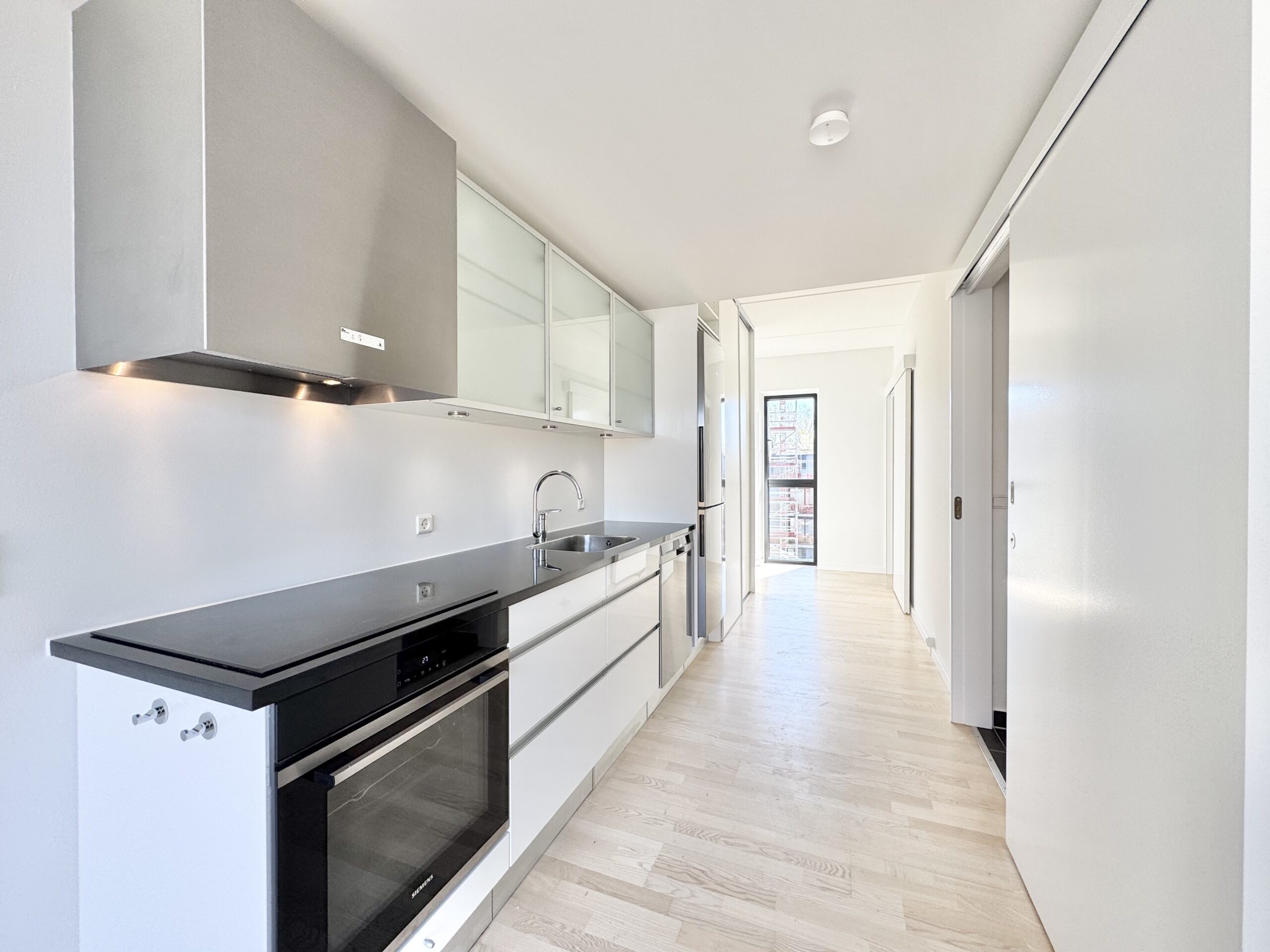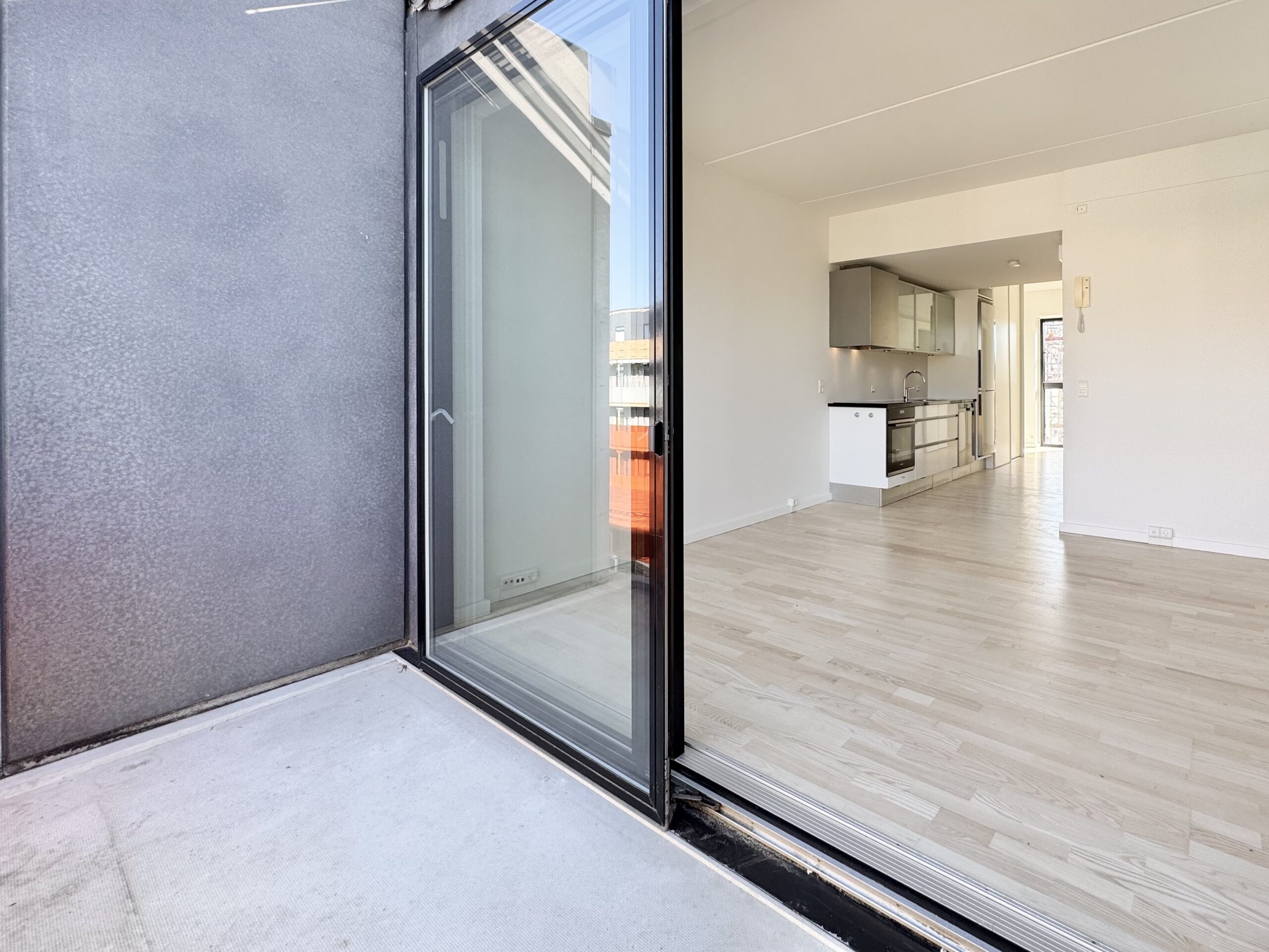 Lejligheden byder på en god entre med indbyggede skabe, der leder direkte ind til et åbent køkken. Køkkenet er indrettet med højglans elementer og granitbordplade samt alle nødvendige hårde hvidevarer, herunder en praktisk opvaskemaskine. Det store soveværelse har rummelige skabe med skydelåger, som giver god opbevaringsplads. Det flotte badeværelse er udstyret med bruseniche, væghængt toilet, skabsplads, en kombineret vaske-/tørremaskine og behagelig gulvvarme. Den lyse stue indbyder til hygge og har plads til både spisebord og tv-stue, med direkte adgang til en egen terrasse, hvor man kan nyde de skønne dage.
