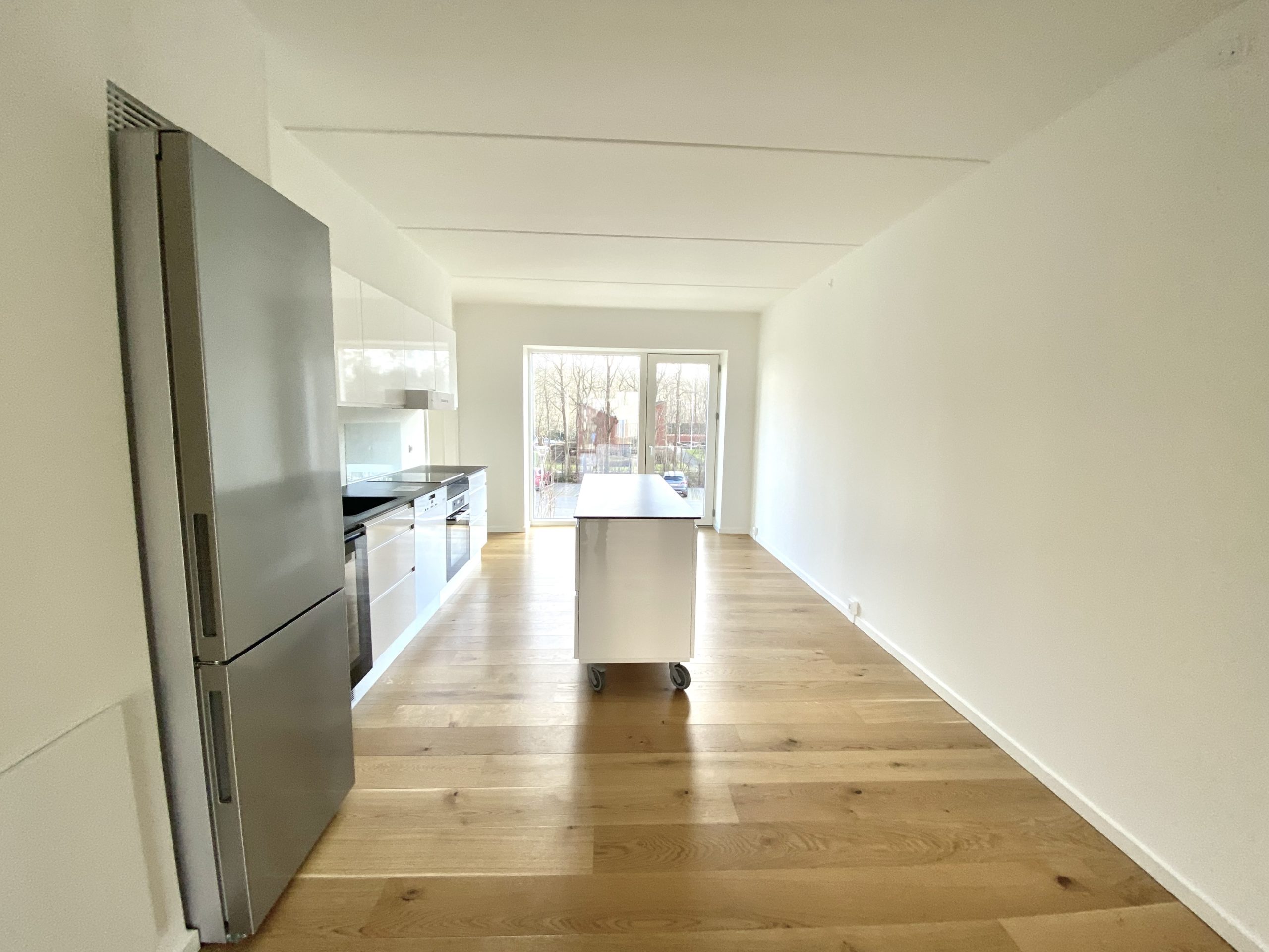 Lejligheden byder på en lys stue, der er i åben forbindelse med et stilrent højglans køkken. Her finder du en flytbar køkkenø og komplette Miele-hvidevarer, inklusive en integreret vinkøleskab med zoner til både rød- og hvidvin. Stuen har god plads til både spisebord og sofagruppe, og fra her er der udgang til en privat altan, hvor du kan nyde morgenkaffen i fred og ro. De to værelser giver dig mulighed for at indrette både et stort soveværelse med indbyggede skabe samt et rummeligt værelse, der egner sig perfekt som børneværelse, hjemmekontor eller gæsteværelse. Badeværelset er eksklusivt indrettet med væghængt Grohe-toilet, elegant skabs- og spejlløsning fra Duravit samt en stor bruseniche med Grohe rainshower og B&O Bluetooth-højtaler integreret i loftet, så du kan skabe den rette stemning hver dag.