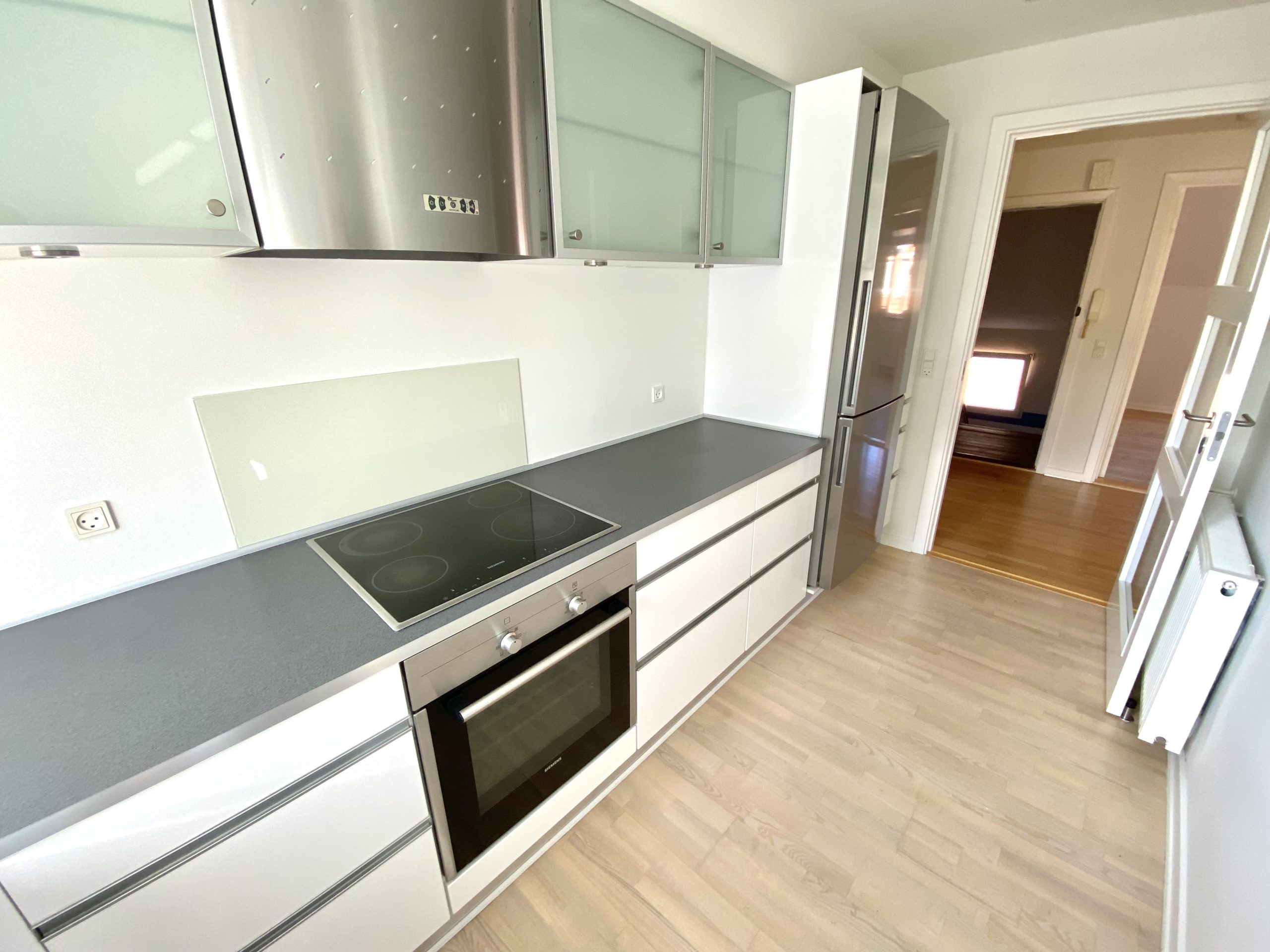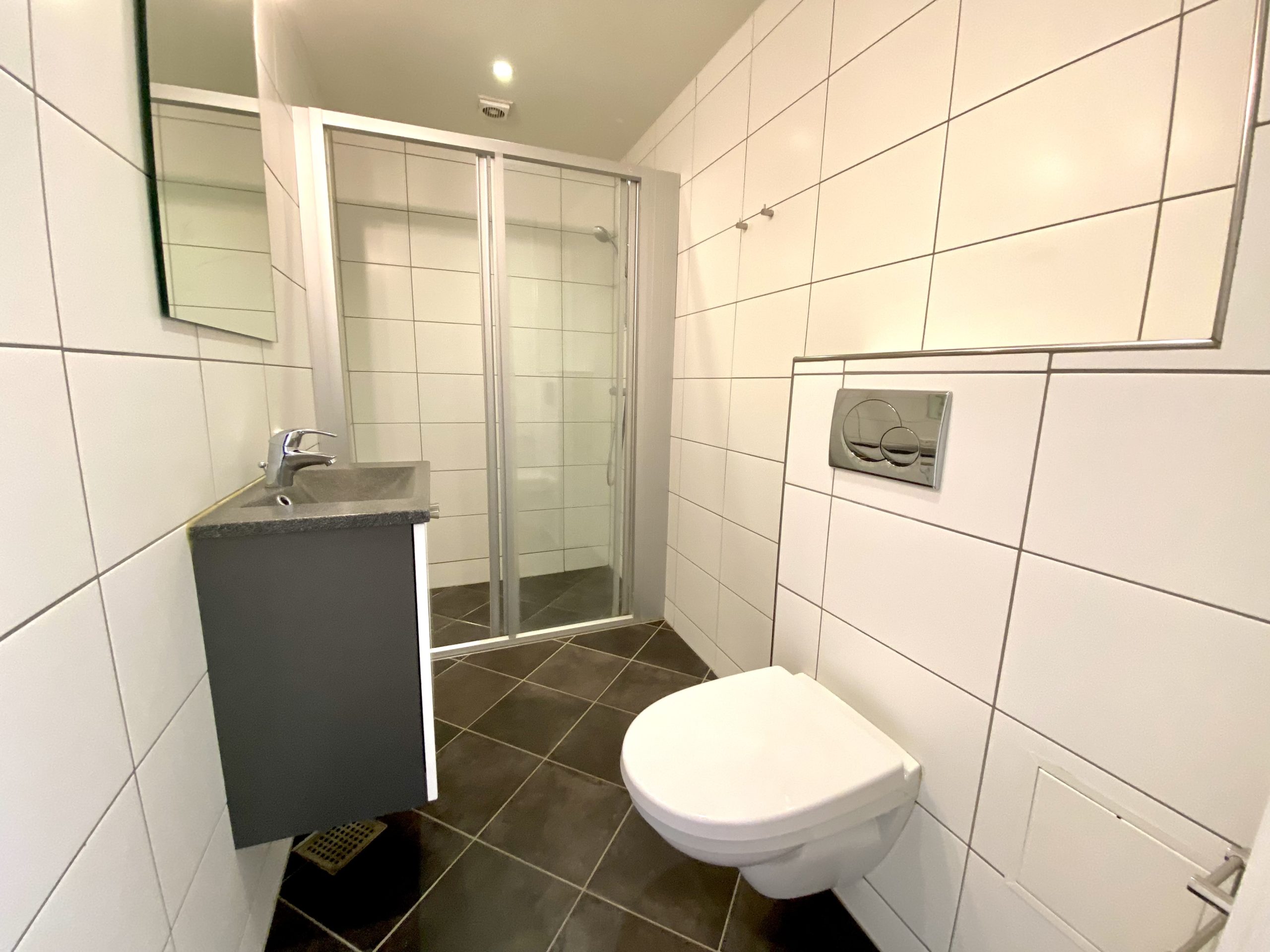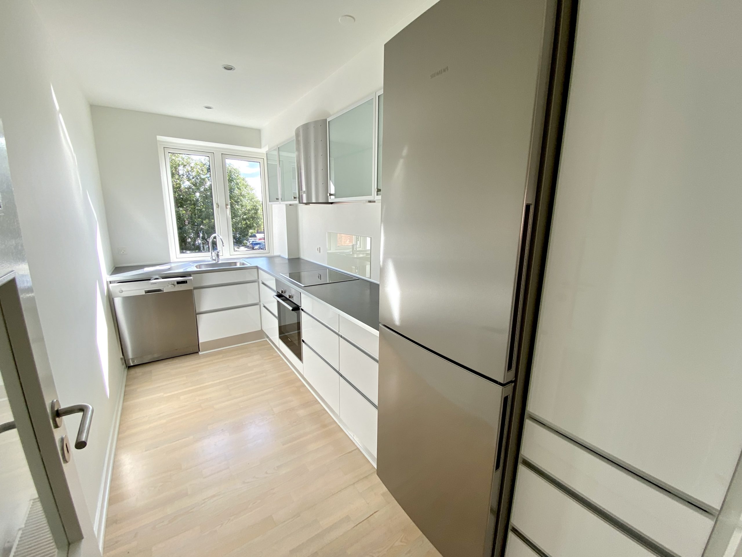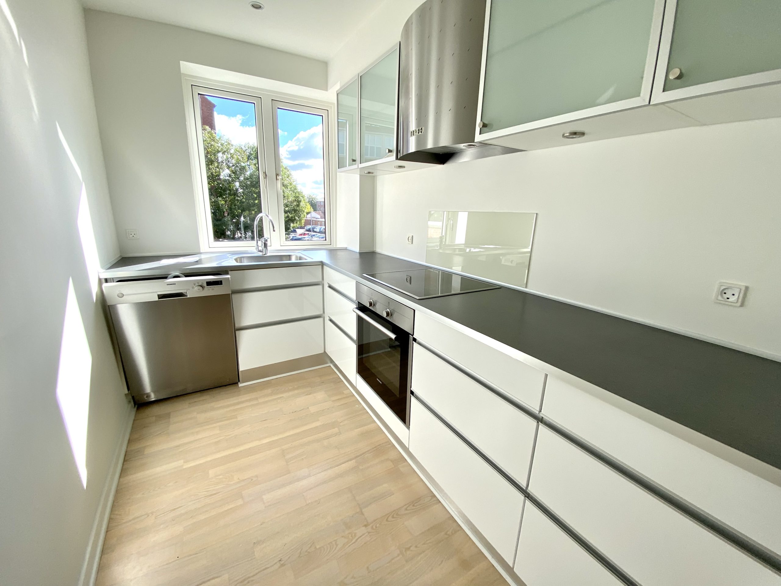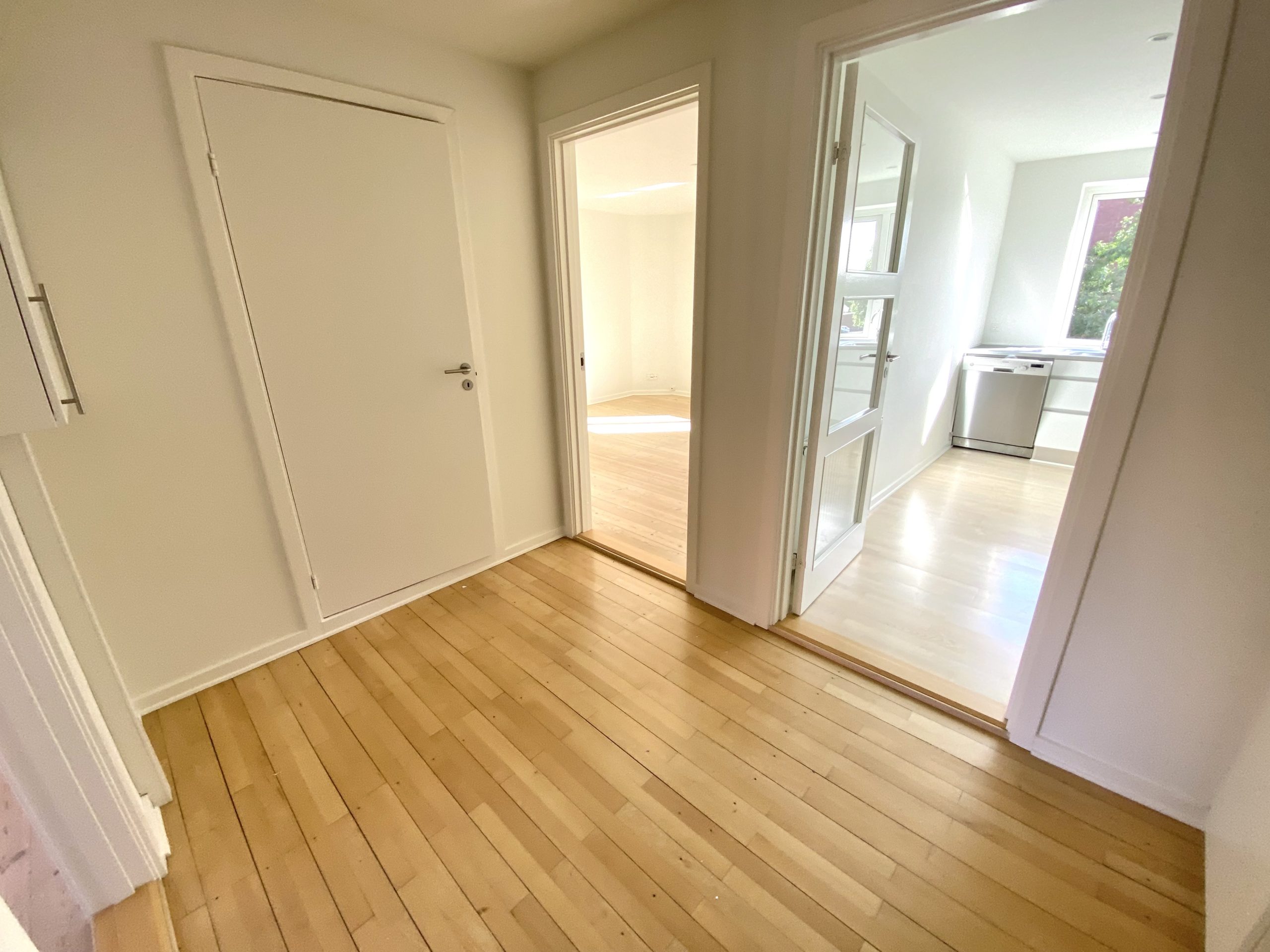 Lejligheden byder på en stor entré, der giver adgang til alle rum. Her finder du et praktisk indbygget skab, der bidrager til den gode opbevaringsplads. Det lækre højglanskøkken er udstyret med alle nødvendige hårde hvidevarer, herunder en opvaskemaskine, som gør madlavningen til en fornøjelse. Den dejlige, lyse stue inviterer til afslapning, mens det store soveværelse har god plads til både skabe og en mindre arbejdsplads. Badeværelset er flot flisebelagt med gulvvarme, væghængt toilet og brusekabine, hvilket tilføjer en luksuriøs følelse til boligen. De afhøvlede gulve giver et elegant præg til hele lejligheden.