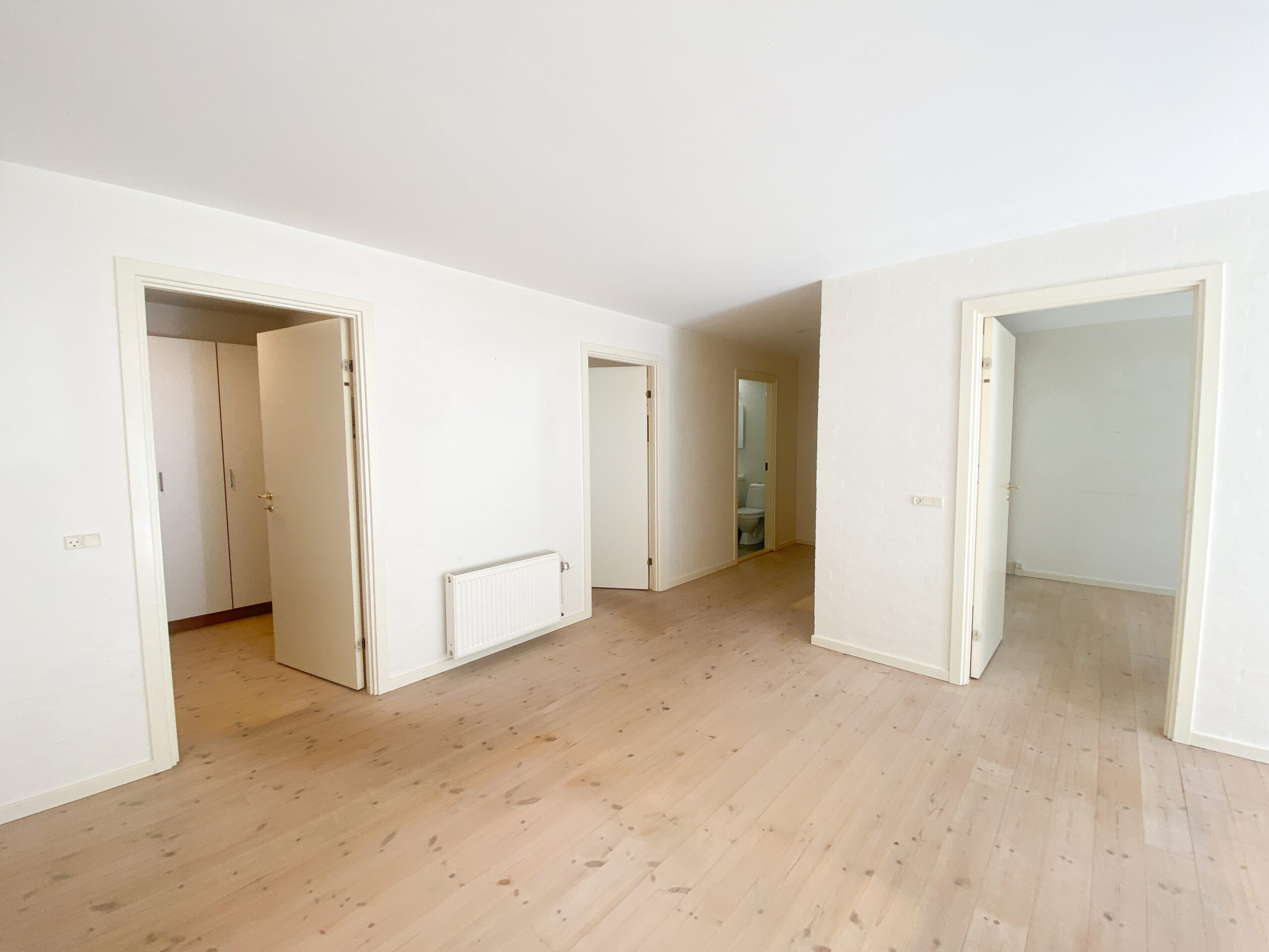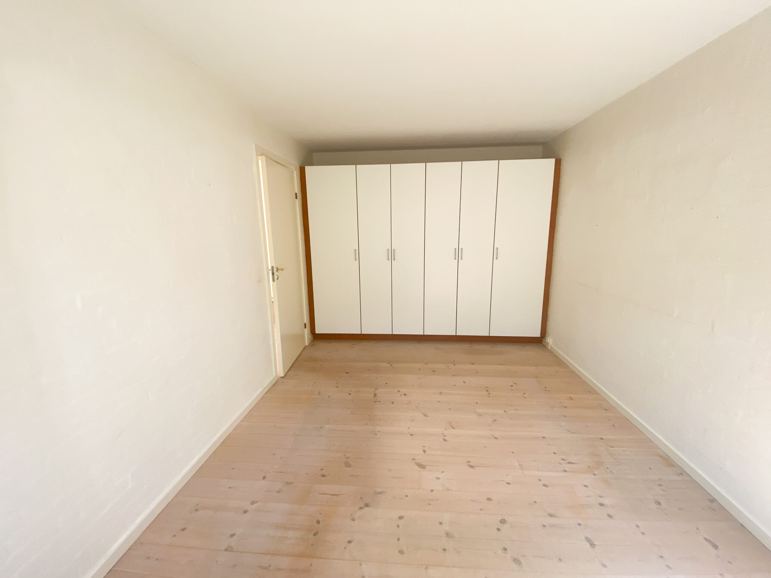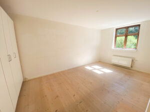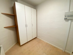 Fra stuen er der indgang til soveværelset, som rummer en stor seng og er udstyret med indbyggede klædeskabe, der giver en elegant og pladsbesparende opbevaringsløsning.