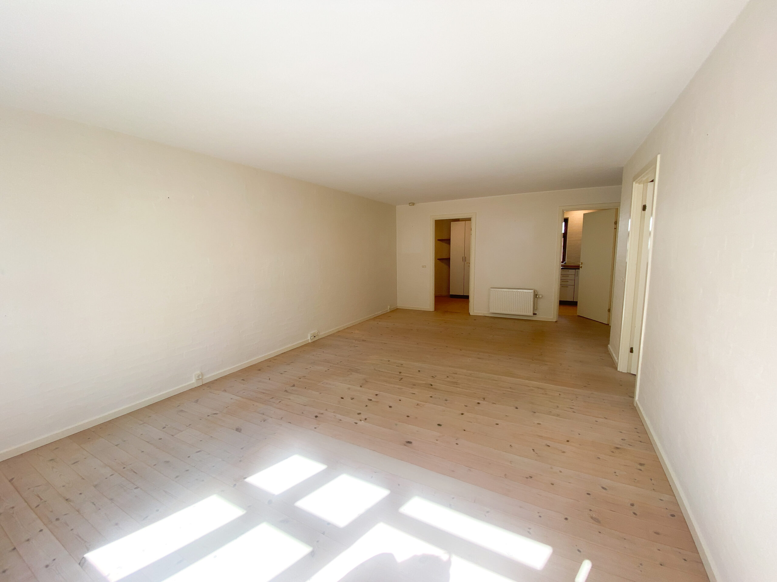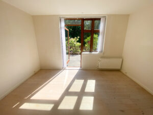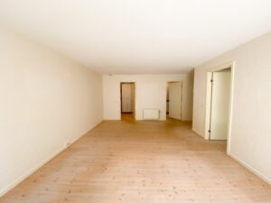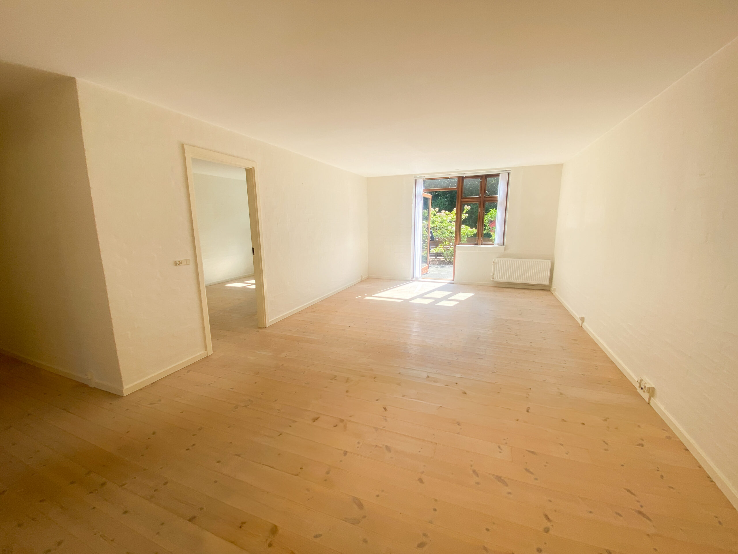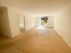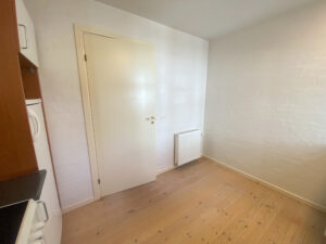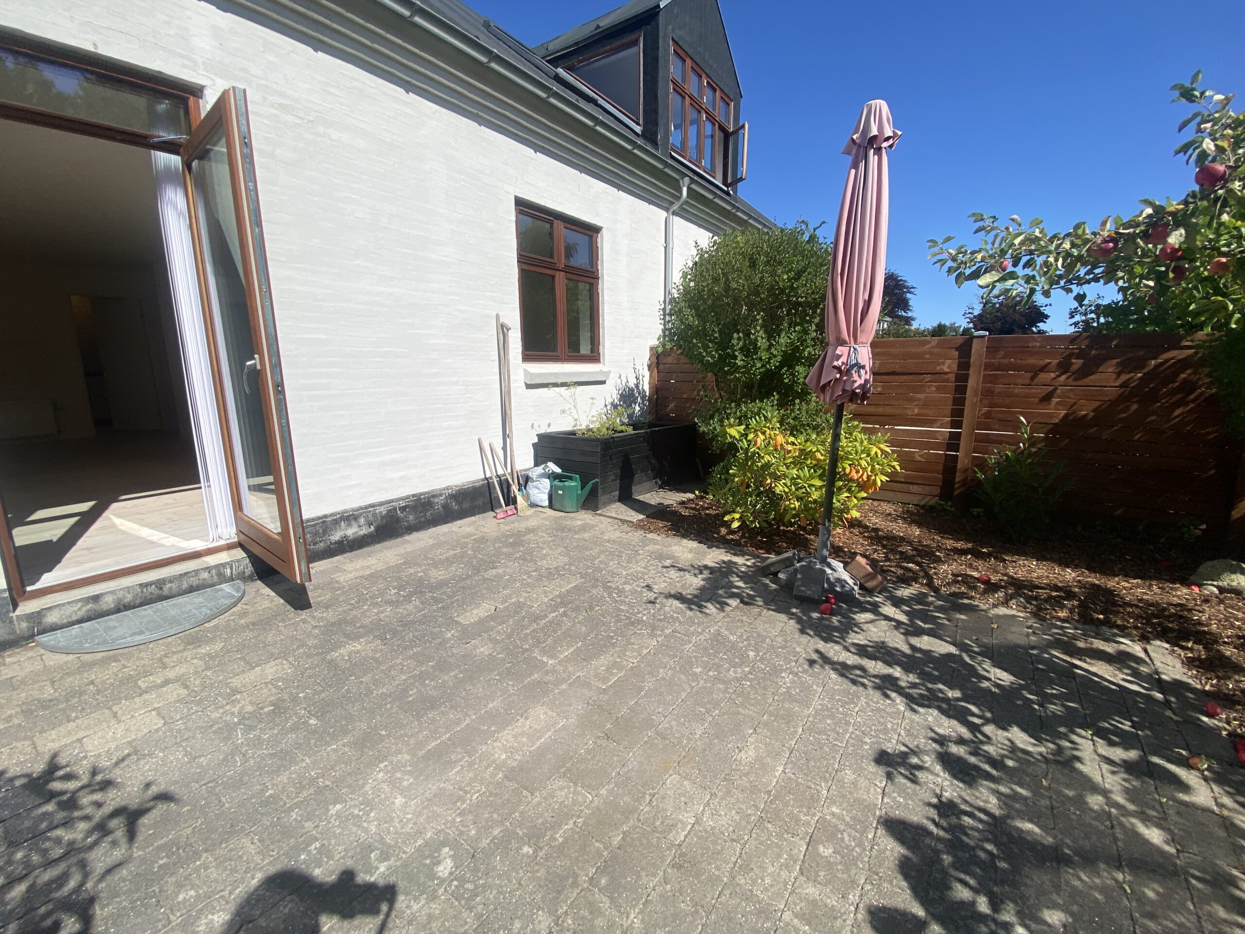 Boligen byder på en entré med praktisk klædeskab, som giver god opbevaringsplads fra start. Herfra træder man ind i den store og lyse stue, der er lejlighedens naturlige samlingspunkt. Stuen har direkte adgang til en solrig, sydvendt terrasse med tilhørende bede – perfekt til både afslapning og hyggelige stunder under åben himmel.