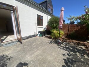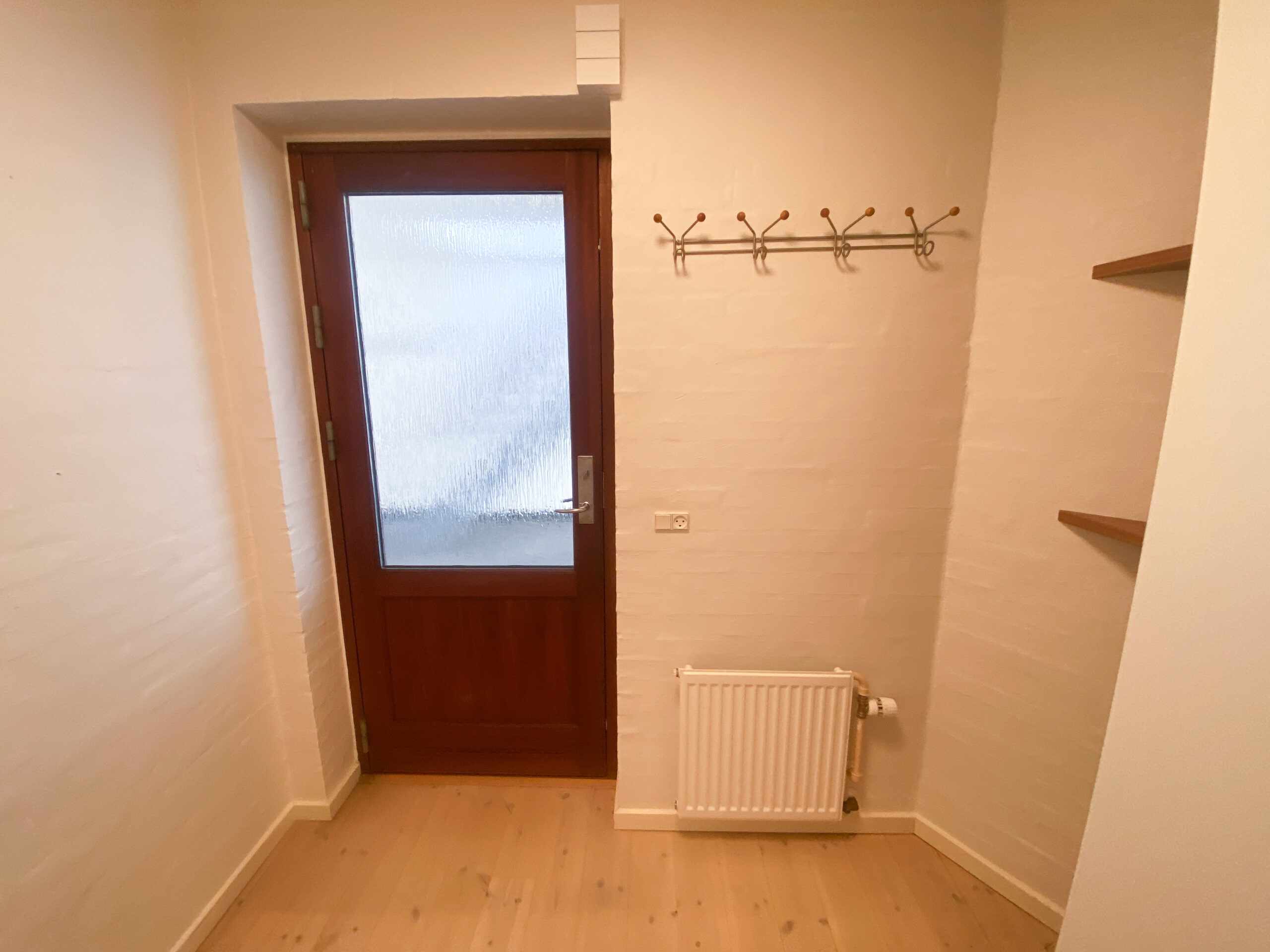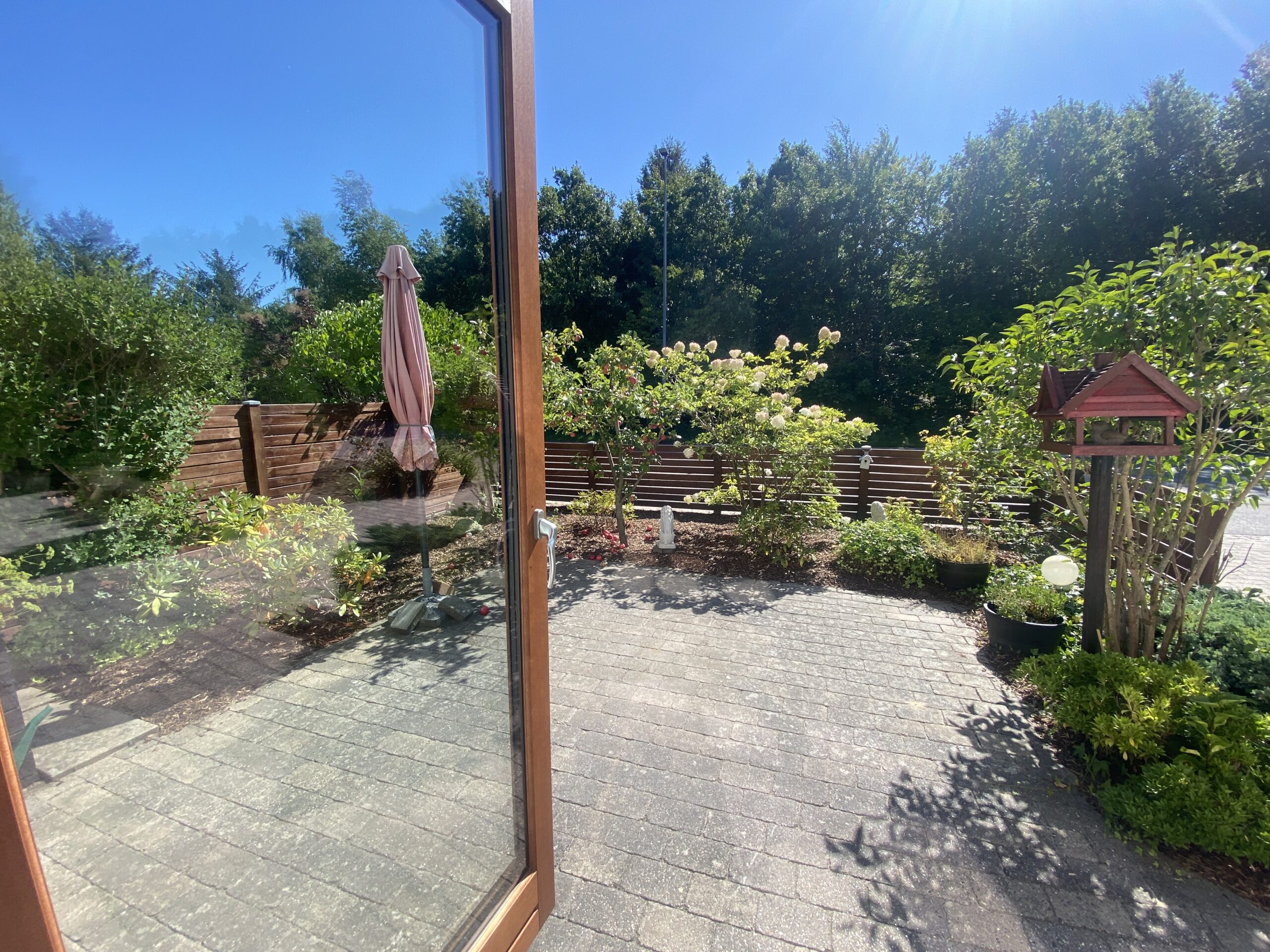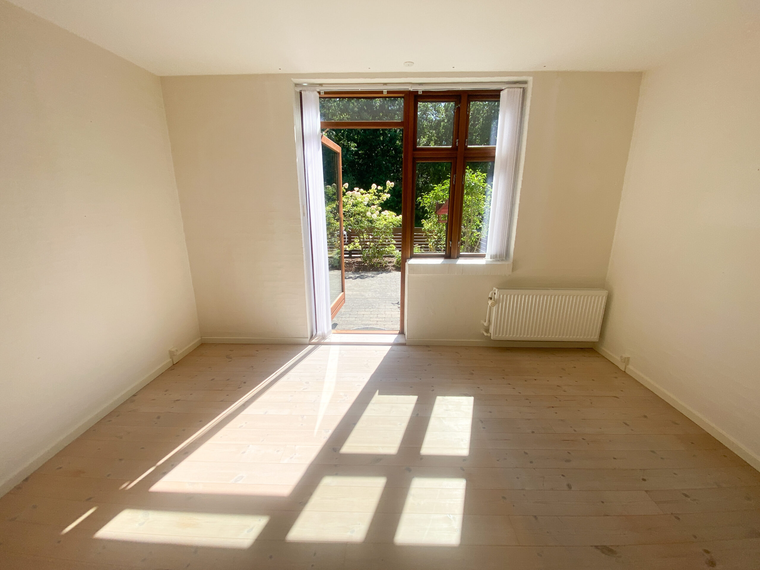 Boligen byder på en entré med praktisk klædeskab, som giver god opbevaringsplads fra start. Herfra træder man ind i den store og lyse stue, der er lejlighedens naturlige samlingspunkt. Stuen har direkte adgang til en solrig, sydvendt terrasse med tilhørende bede – perfekt til både afslapning og hyggelige stunder under åben himmel.