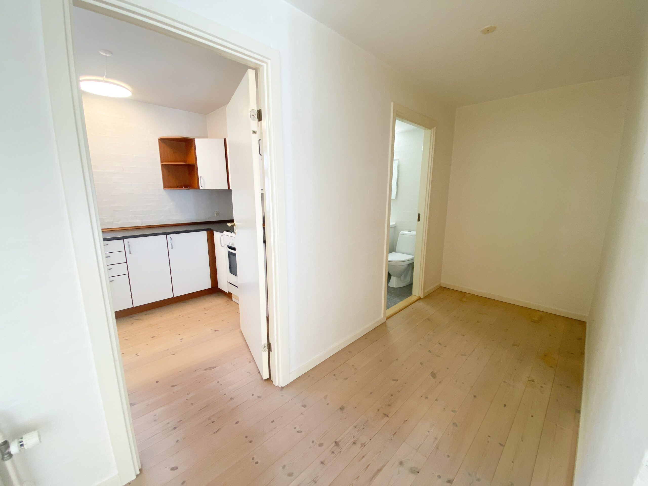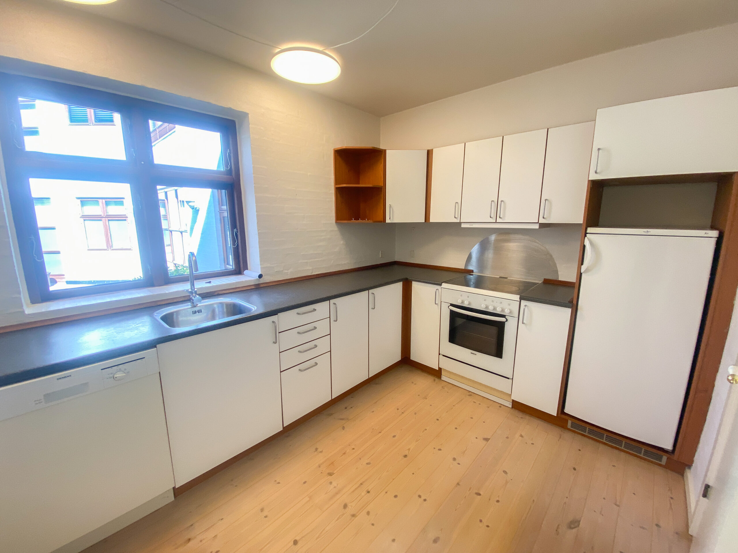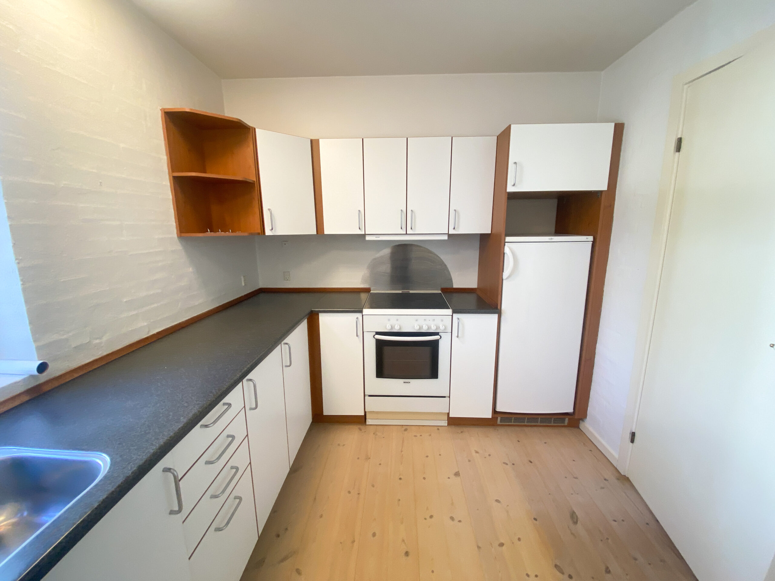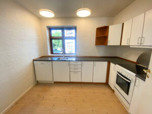 Køkkenet er dejligt rummeligt med masser af skabsplads og en opvaskemaskine, og der er desuden plads til et lille spisehjørne.