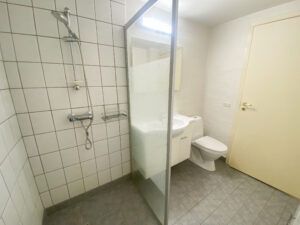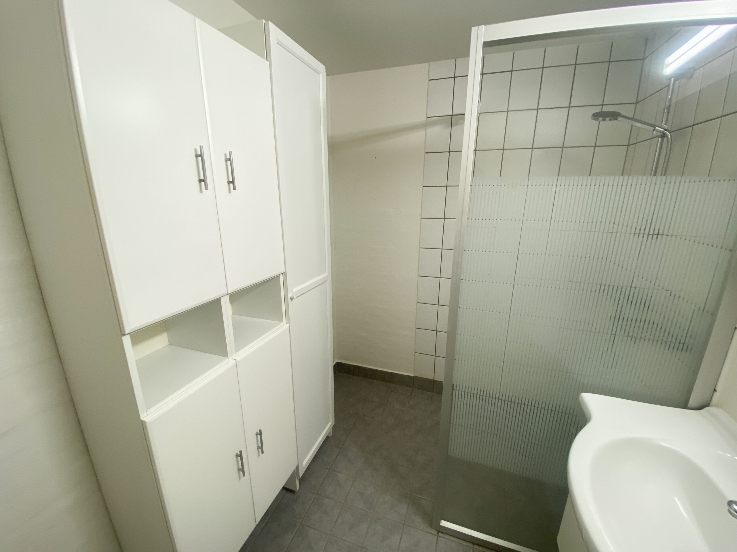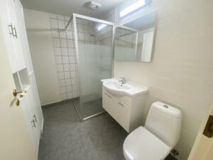 Et ekstra hjørne i boligen egner sig perfekt til en kontorplads eller hobbyområde. Herfra er der adgang til badeværelset, som fremstår moderne med hvide og grå klinker, skabe og hylder, en god vask med bordplads samt en stor og indbydende bruseniche.