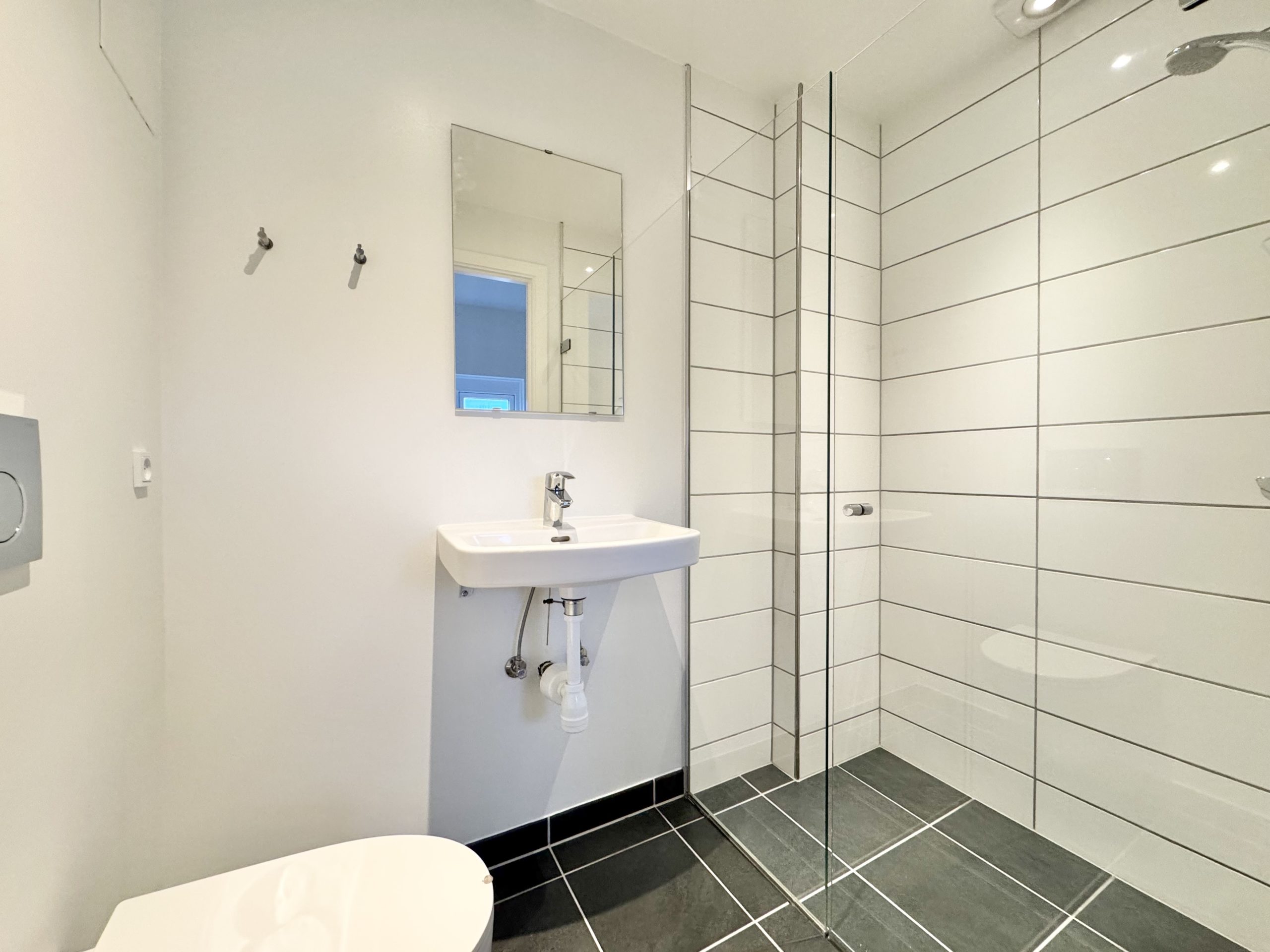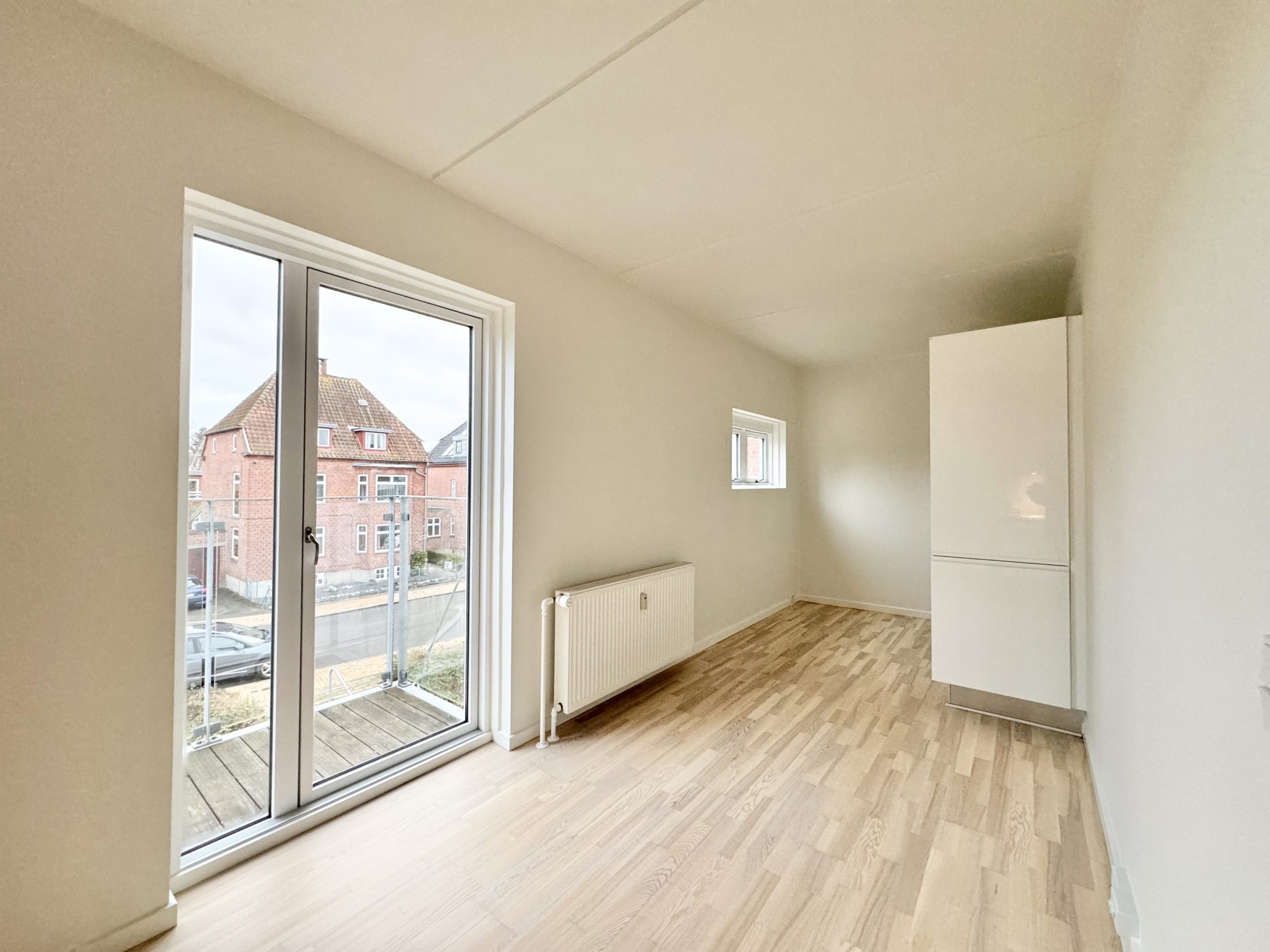 Lejligheden byder på en praktisk indretning med et lyst stue/værelse, der er udstyret med flotte, lakerede gulve og faste skabe til opbevaring. Den åbne planløsning skaber en rummelig følelse, og fra stuen er der direkte adgang til en privat altan, hvor du kan nyde den friske luft. Det veludstyrede køkken inkluderer emhætte, køleskab, indbygningsovn og kogeplader, hvilket gør madlavning til en fornøjelse. Badeværelset er både stilfuldt og funktionelt med væghængt toilet, gulvvarme og bruseniche – et lækkert og indbydende rum til afslapning.