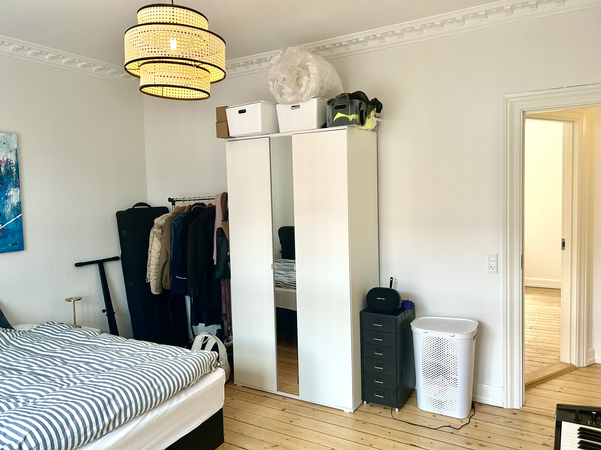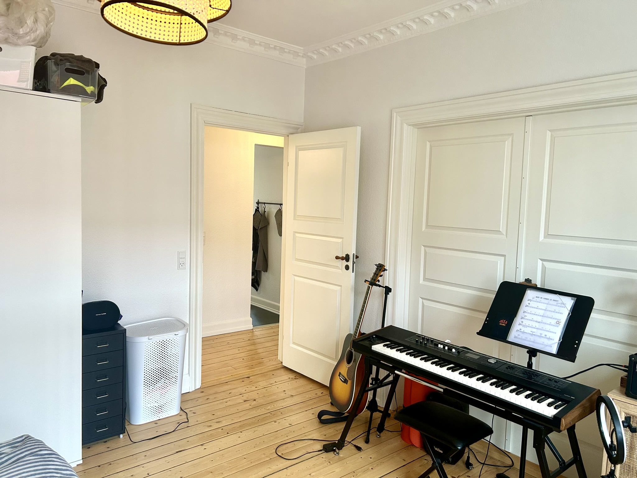 Lejligheden byder på en rummelig entre, der giver adgang til alle rum. Her finder du et nyere badeværelse, et stort, lækkert soveværelse og en lys stue, der sammen med spisestuen fungerer som et ekstra værelse. De originale detaljer som stuk, fyldningsdøre og flotte trægulve bidrager til en varm og indbydende stemning.