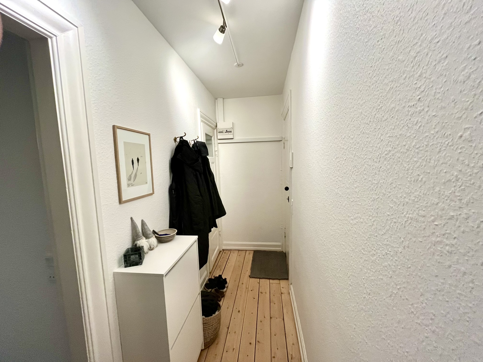 Lejligheden byder på en rummelig fordelingsentré, der giver adgang til alle rum. Det flotte nyere badeværelse er udstyret med gulvvarme og lyse klinker, hvilket skaber en indbydende stemning. Det moderne køkken fra Invita har alt i hårde hvidevarer og står klar til at inspirere til madlavning. Stuen er stor og lys, perfekt til afslapning, mens det store soveværelse giver plads til både skabe og et skrivebord. Stue, gang og soveværelse prydes af smukke afhøvlede gulve, der tilføjer karakter til boligen.
