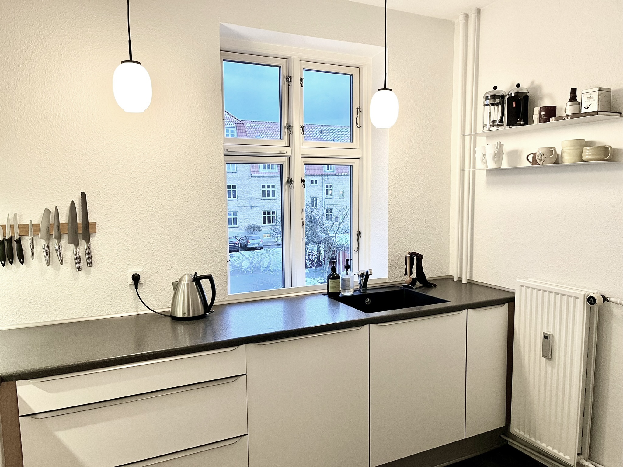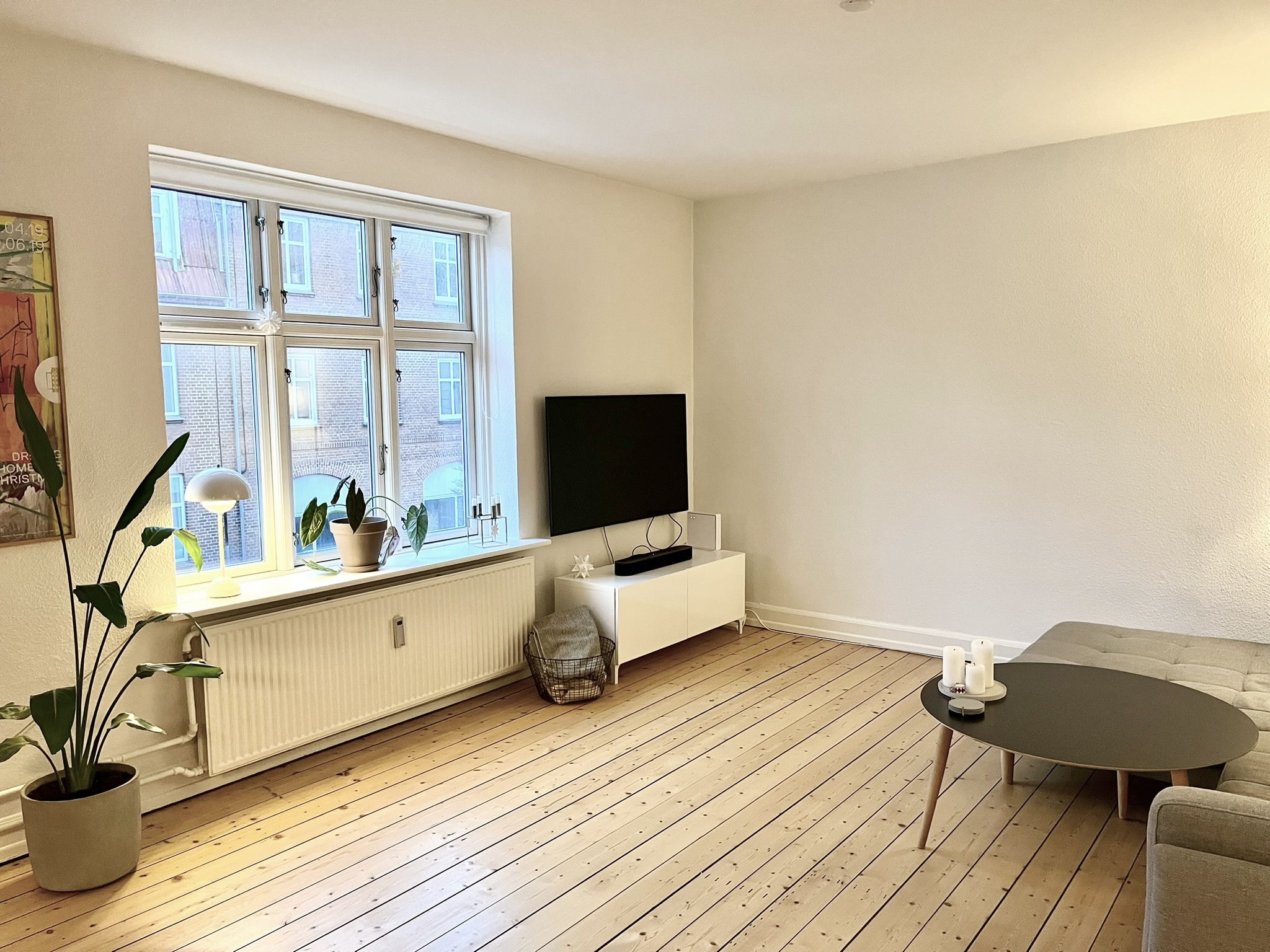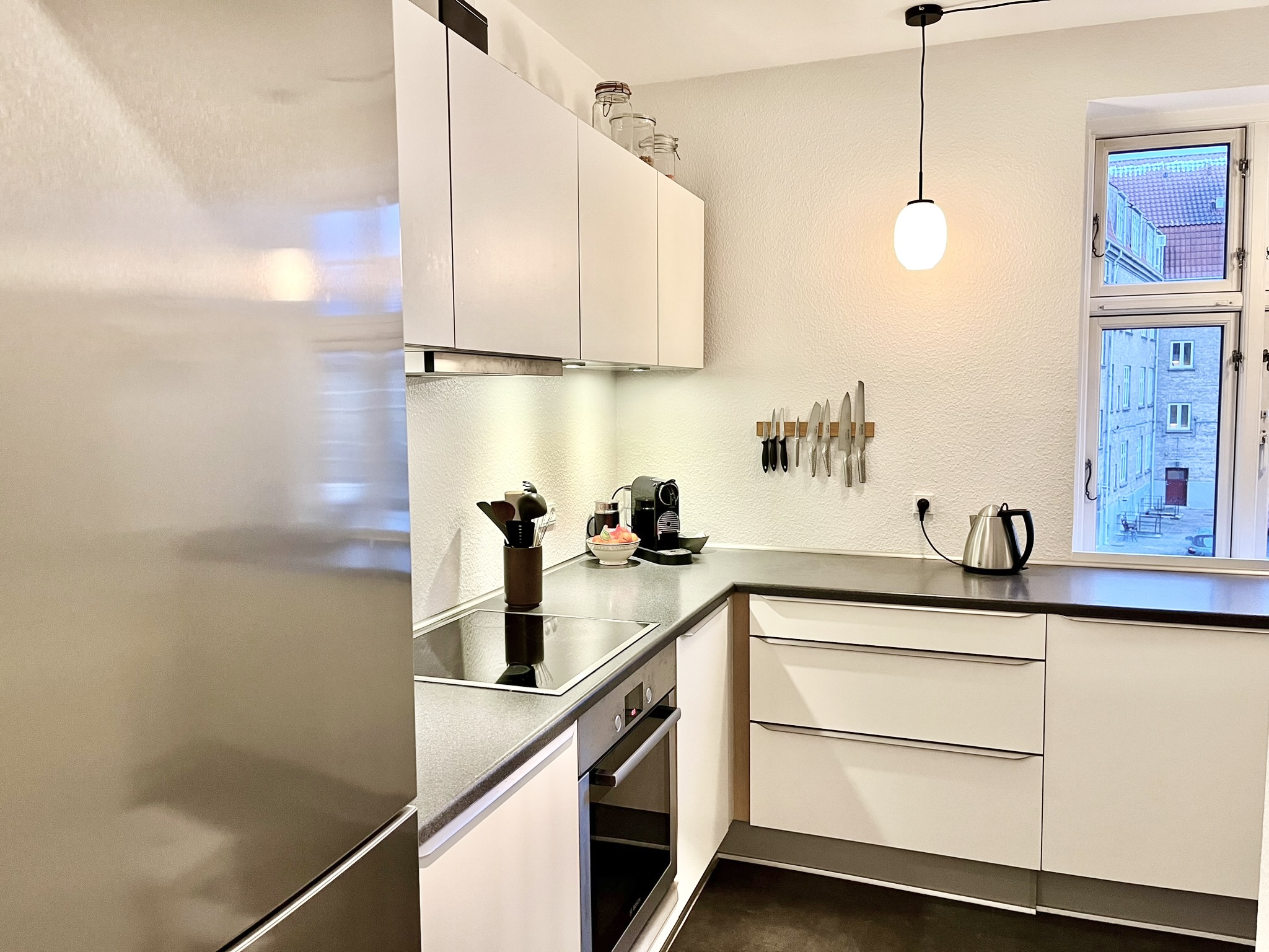 Området omkring lejligheden byder på en skøn atmosfære med nem adgang til byens liv, indkøbsmuligheder og natur.