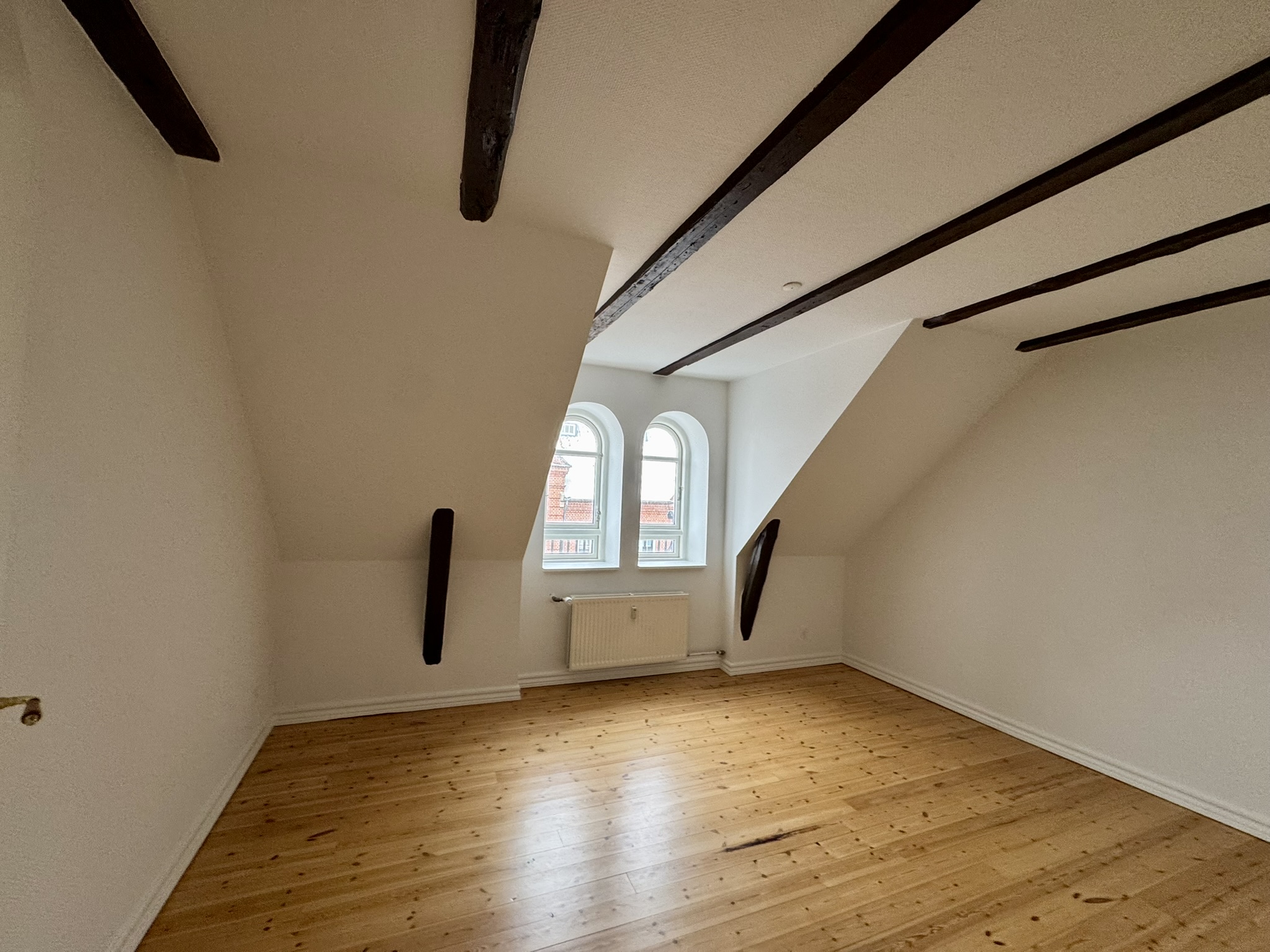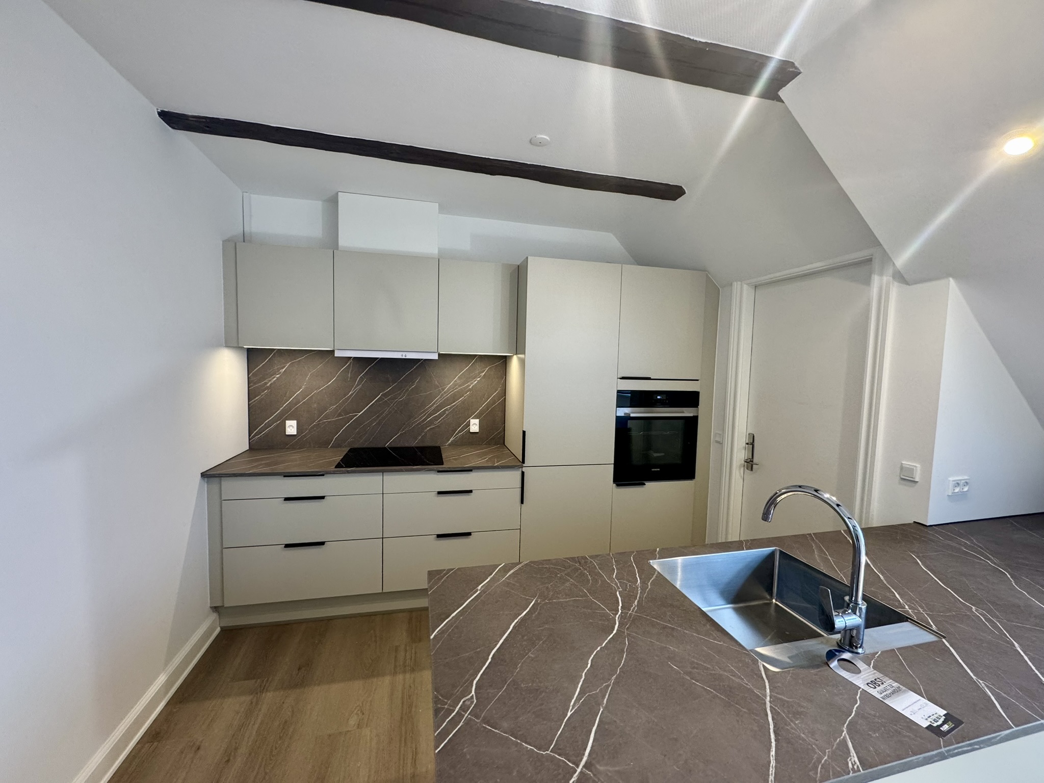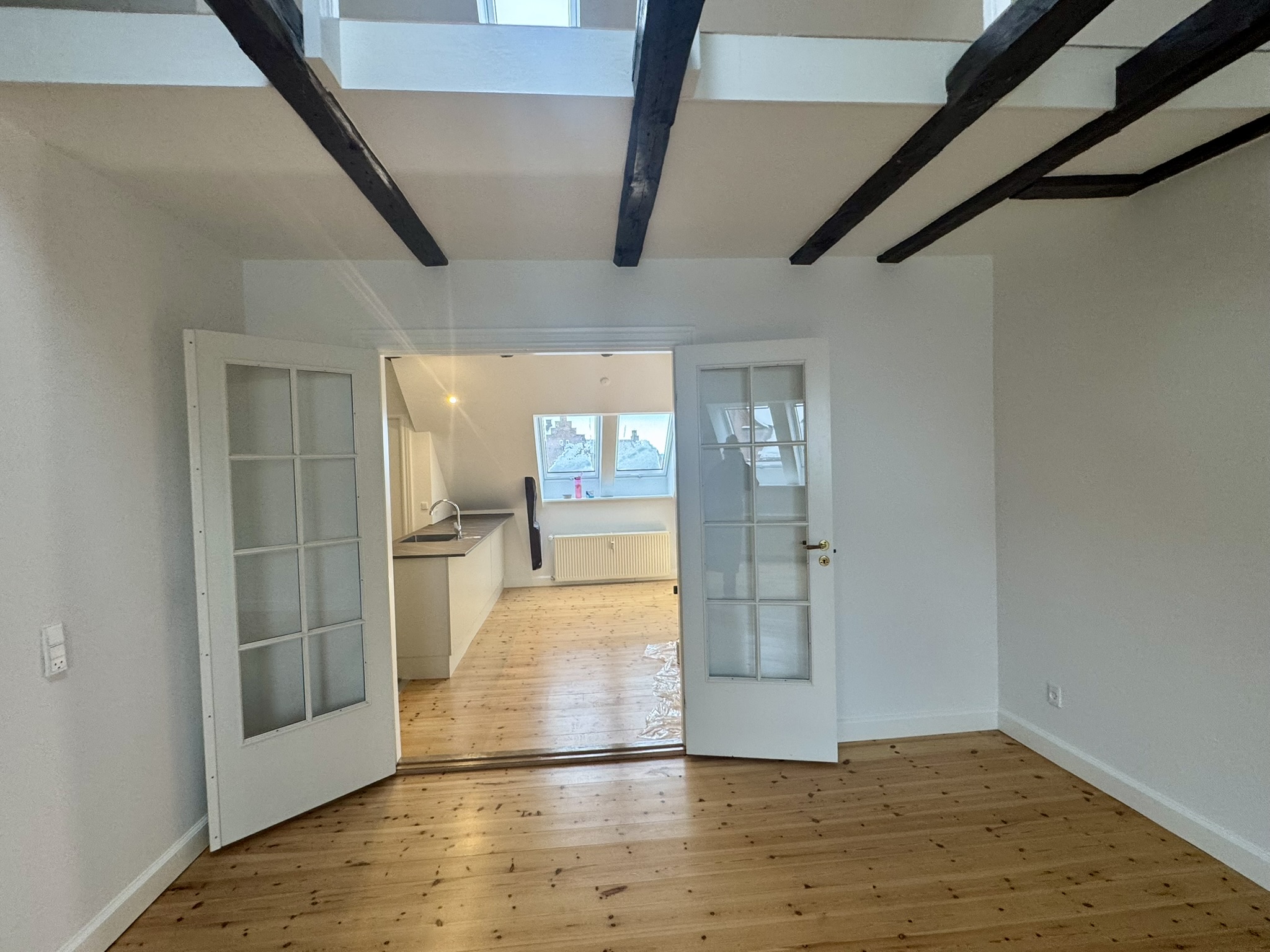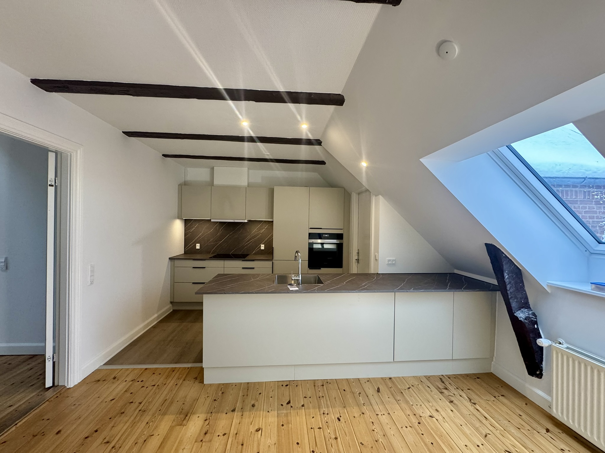 Lejligheden, der netop nu gennemgår en renovering, byder på et rummeligt soveværelse med faste skabe, et ekstra værelse, et stort, nyrenoveret badeværelse og en hyggelig opholdsstue med fritlagte bjælker. Fra stuen åbner franske døre sig til et skønt køkkenalrum, der prydes af et helt nyt, moderne køkken med alt i hårde hvidevarer og masser af skabs- og bordplads. En trappe fører op til en stor hems, perfekt til kontor eller som ekstra værelse, og herfra er der adgang til et disponibelt rum til opbevaring.