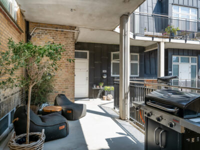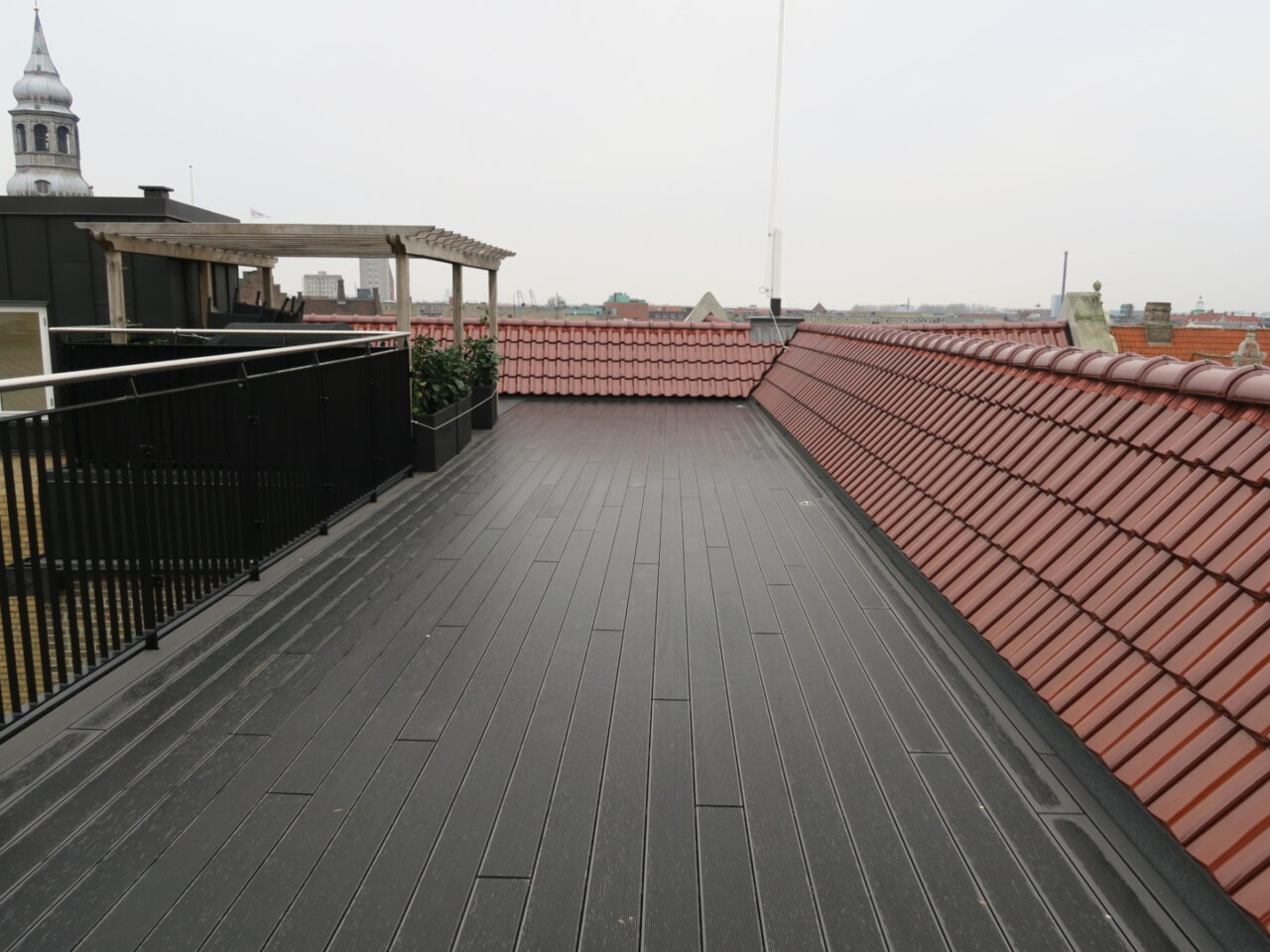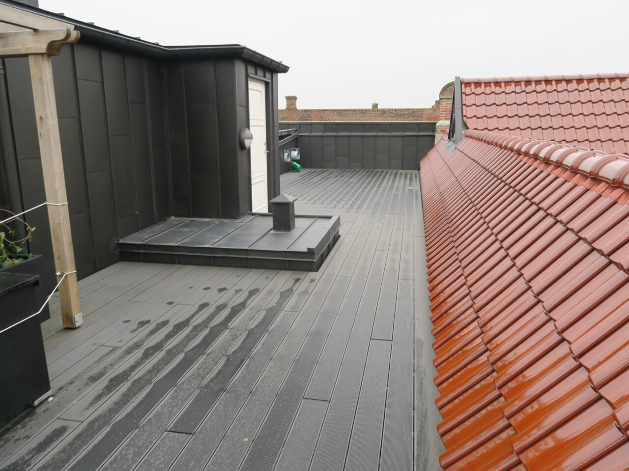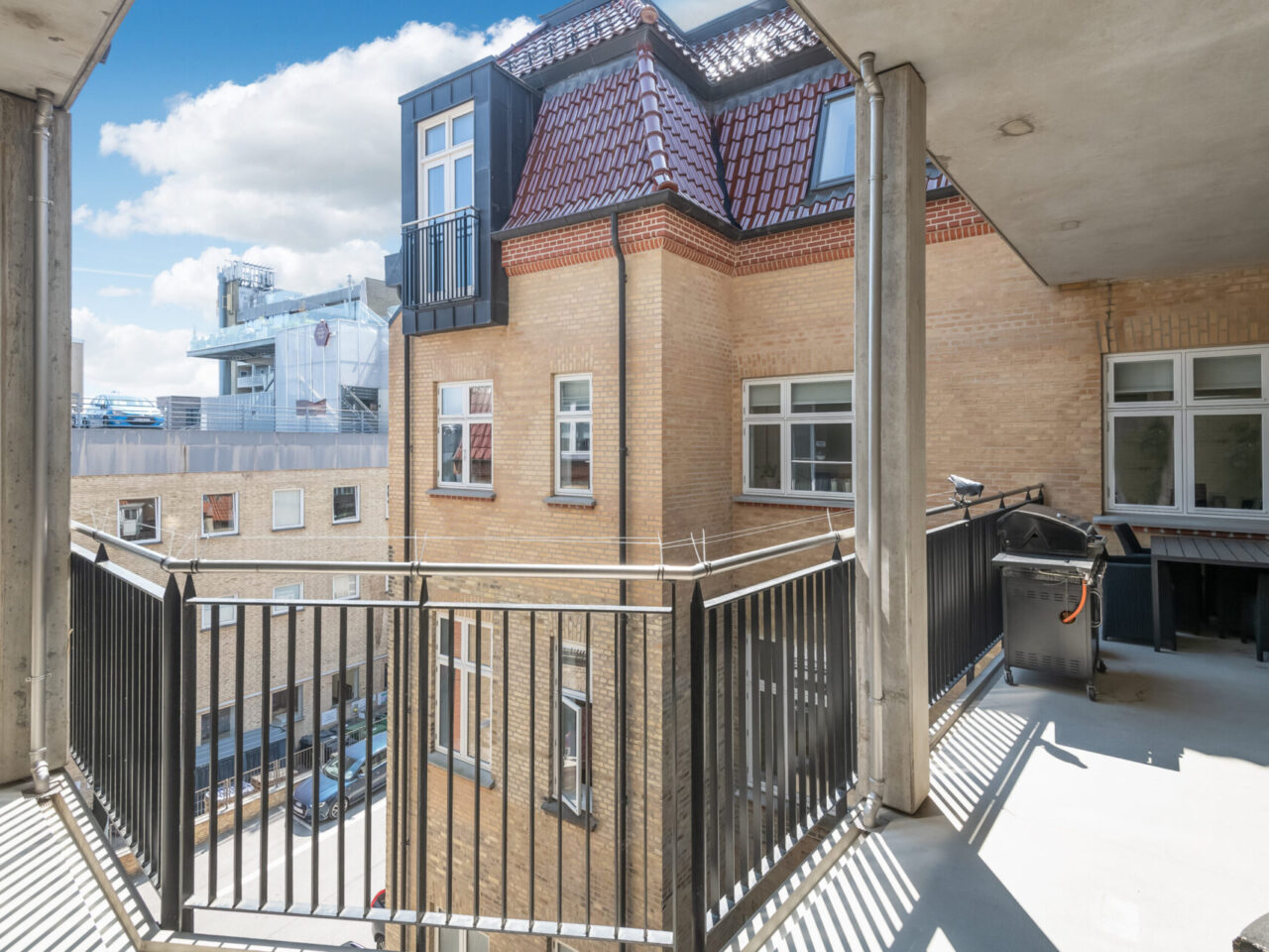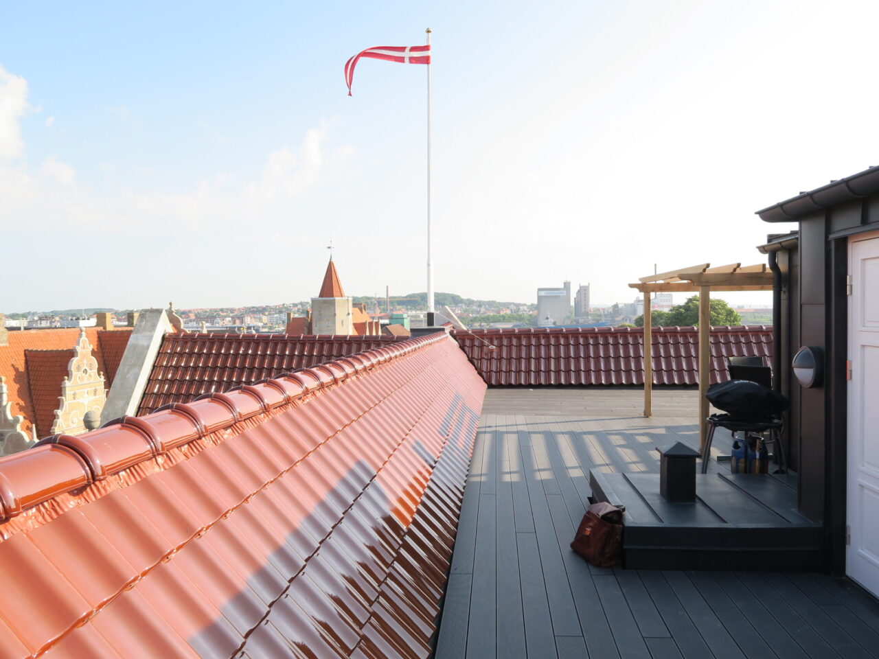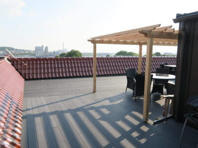 Der er adgang til en stor flot fælles tagterrasse på 5. sal på ca. 140 kvm. Her er der panoramaudsigt over Aalborg og Limfjorden. Der er adgang til lejligheden via elevator og svalegang. Her har man også mulighed for at sætte eget mindre bord og stole.