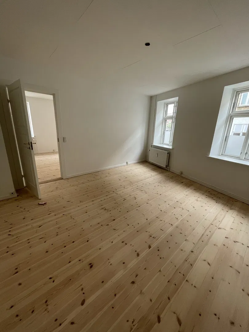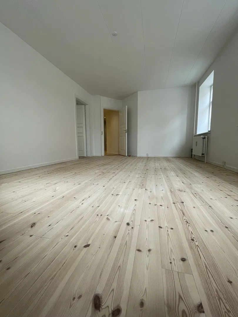 Lejligheden rummer fire indretningsvenlige værelser, der prydes af naturligt lys og trægulve. Det rummelige badeværelse er velholdt med flisevægge og en separat brusezone, hvilket skaber en indbydende atmosfære. Et praktisk bryggers med egen yderdør til den rolige gård tilføjer ekstra værdi.