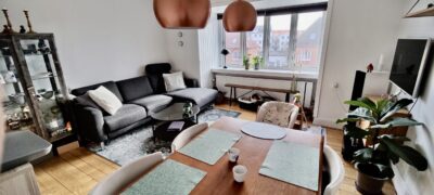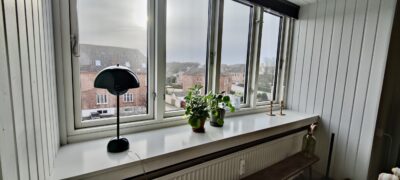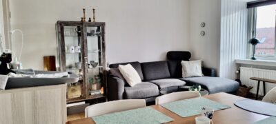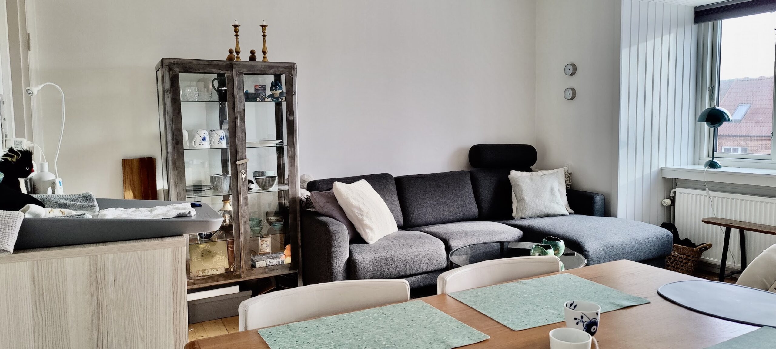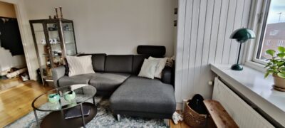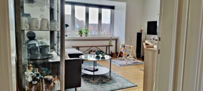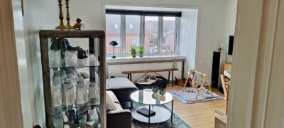 Så har vi stuen, hvor der er et skønt vinduesparti med en hyggelig udsigt og med lys der strømmer ind.