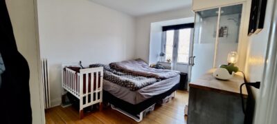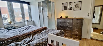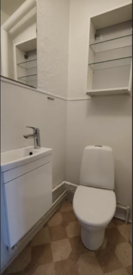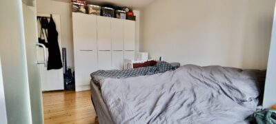 Lejligheden er bestående af en fordelingsgang, hvor der er et rum med toilet og håndvask samt nogle hylder til opbevaring. Så har vi soveværelset, hvor der er et stort klædeskab og der er plads til stor seng også. Der er en brusekabine i soveværelset, da toilettet er for småt til en bruseløsning. Det vil nok være at foretrække med en ordentlig bruseniche fremfor bad oveni toilettet.