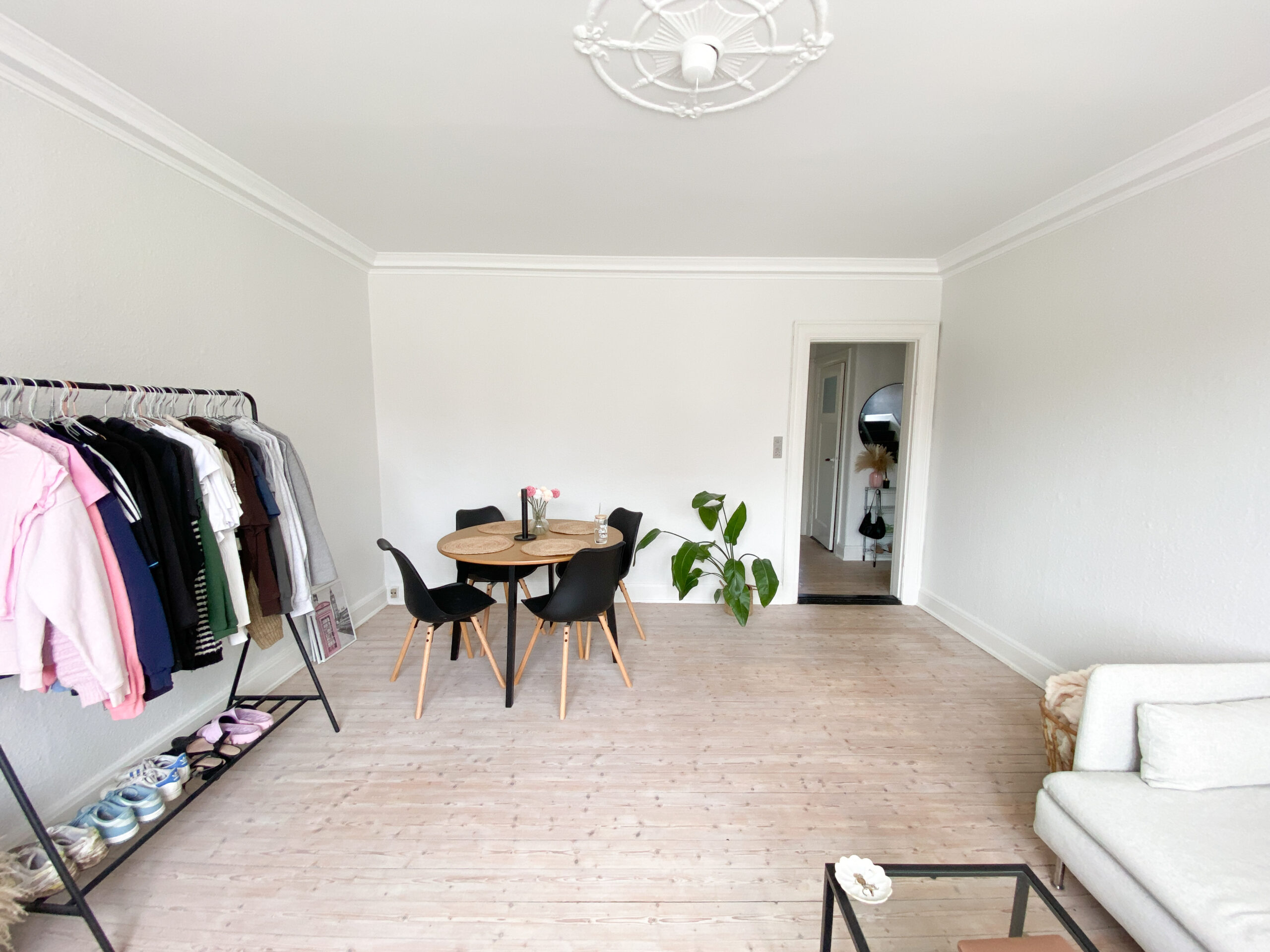 Hele lejligheden prydes af flotte trægulve, der binder rummene elegant sammen.