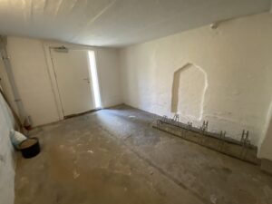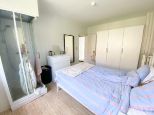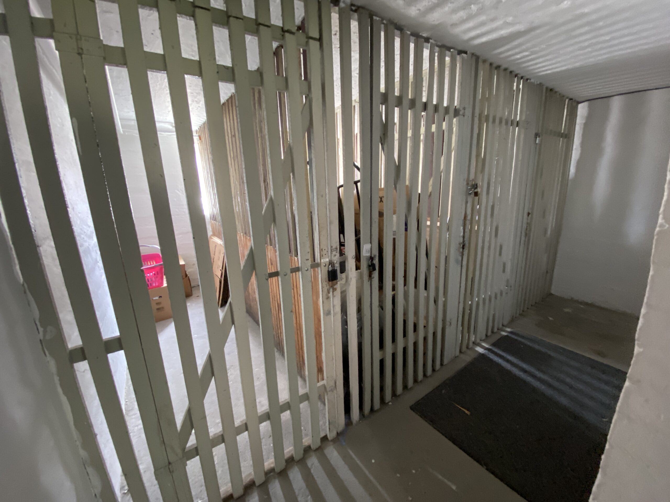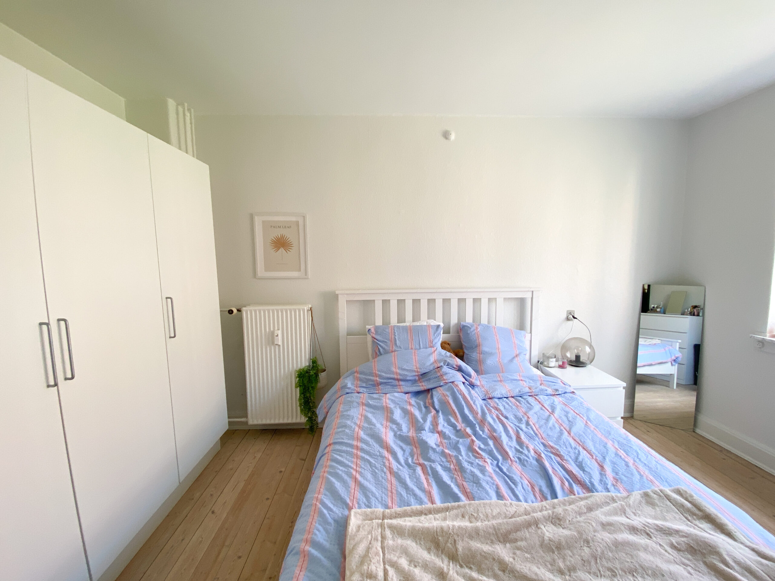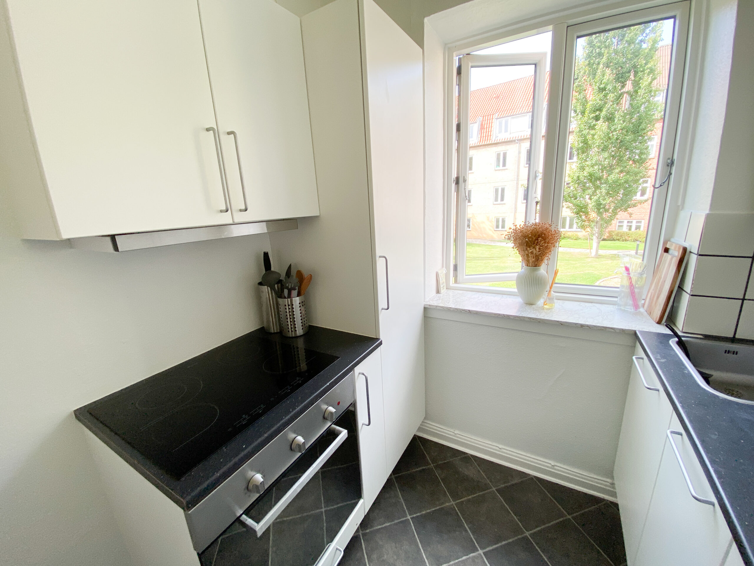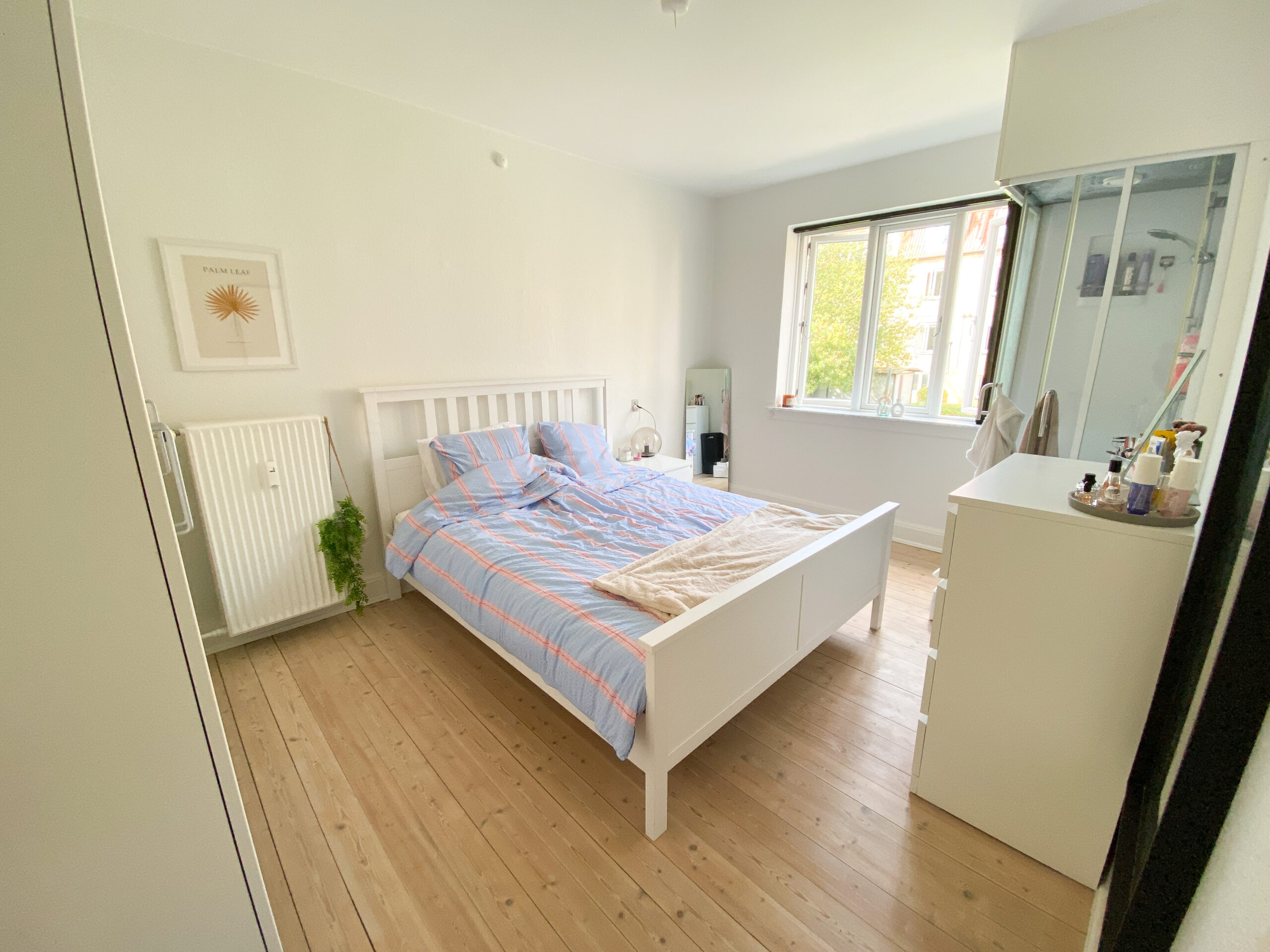 Soveværelset er rummeligt og indrettet med et stort klædeskab samt plads til en dobbeltseng. Her er desuden installeret en praktisk brusekabine. Fra soveværelset er der kig til den grønne fælles gårdhave, som også kan nydes fra køkkenet.