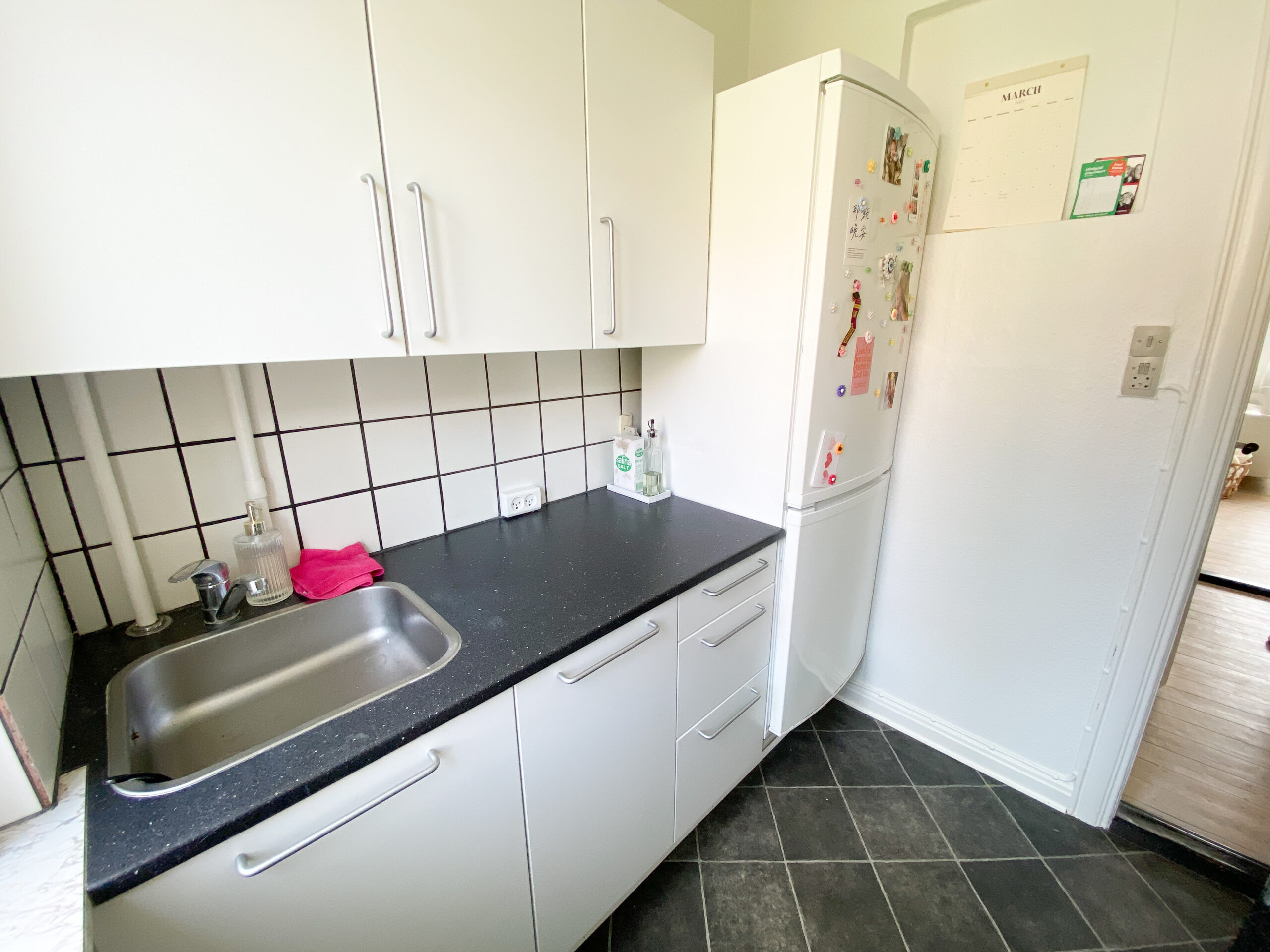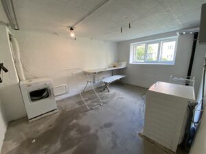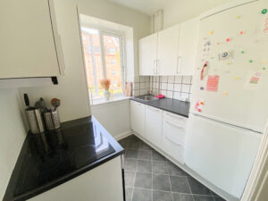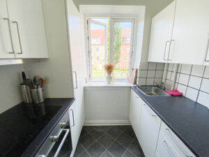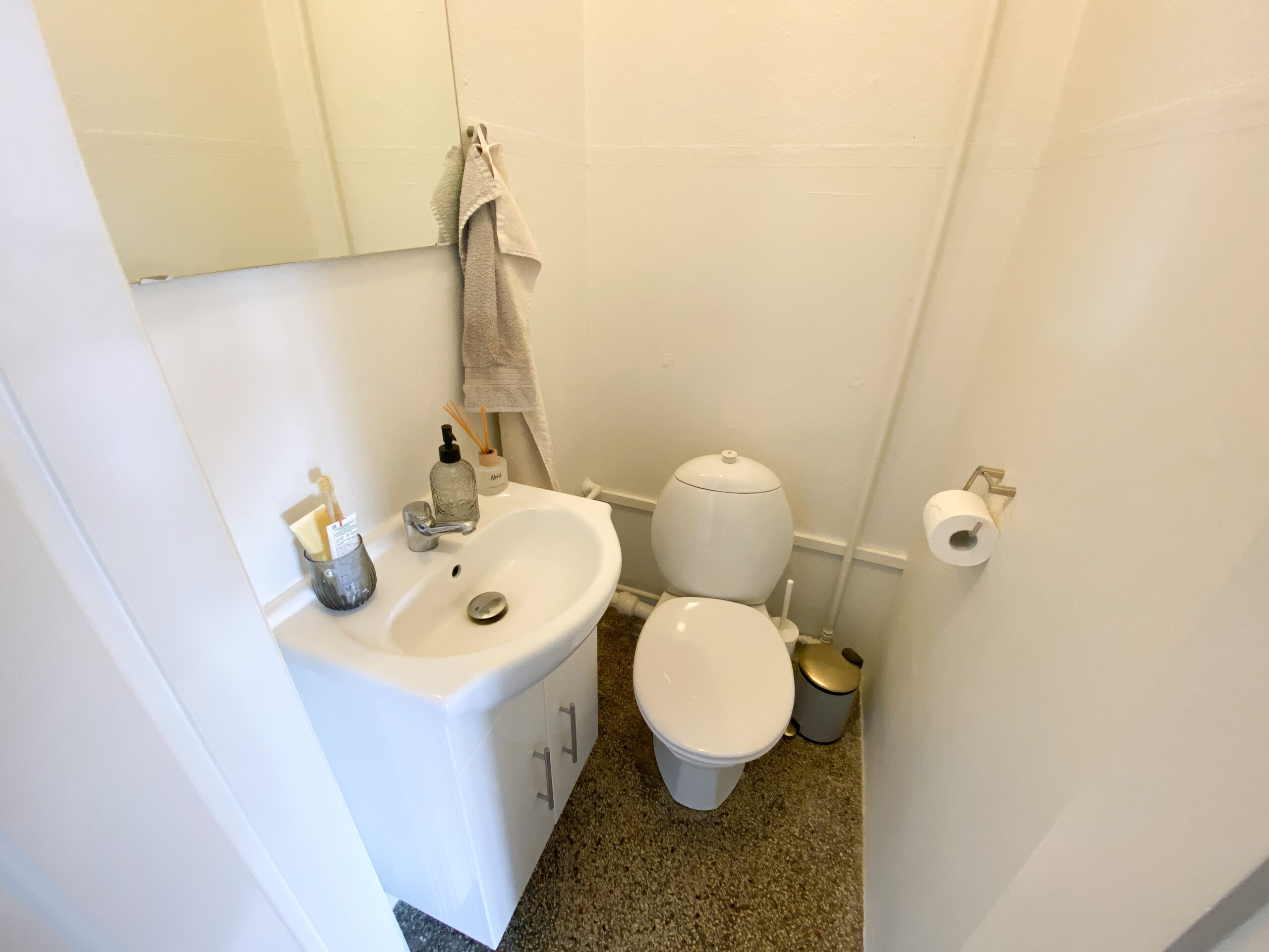 Køkkenet fremstår moderne med hvide elementer og sort bordplade – et stilrent udtryk, der passer til både hverdagsmad og gæstemiddag. I fordelingsgangen finder du et separat toilet med håndvask samt mulighed for opbevaringsløsninger på væggene.