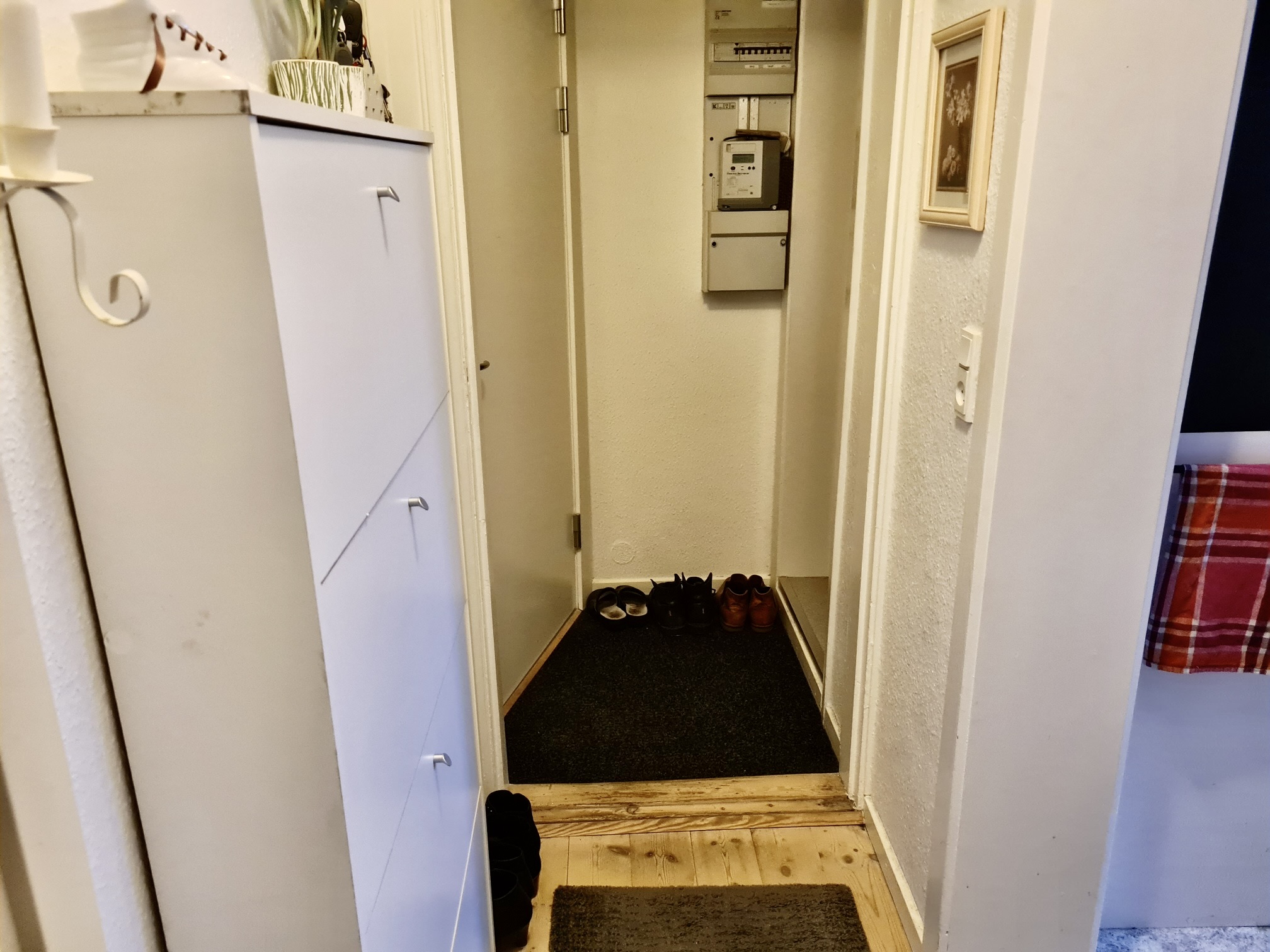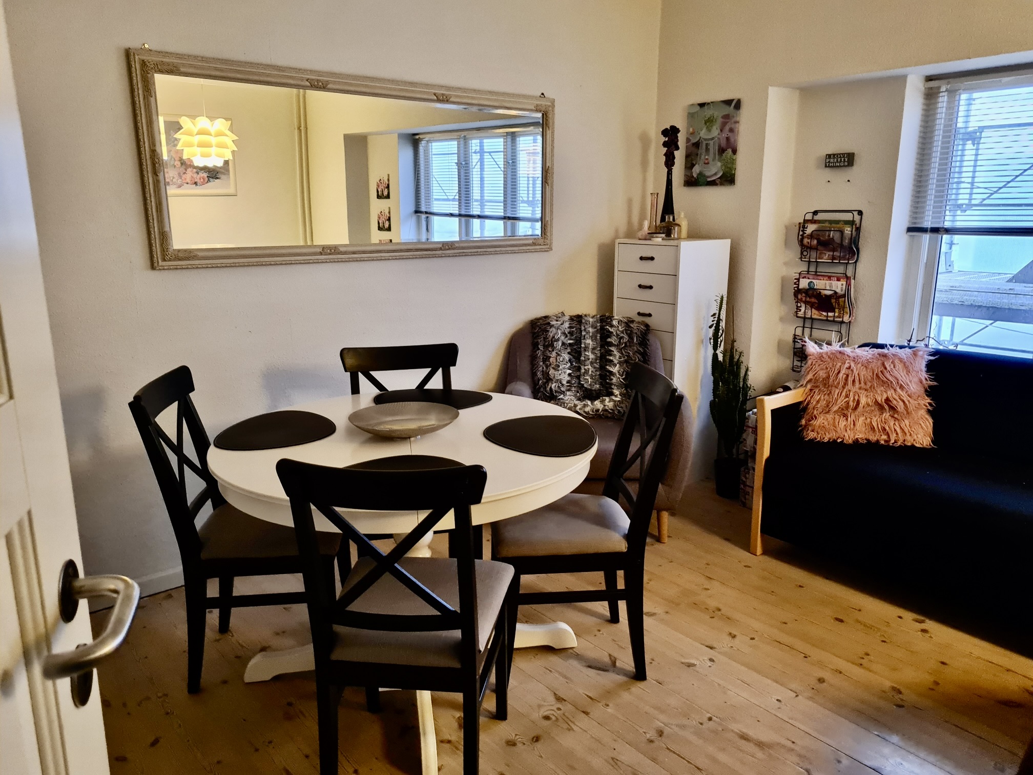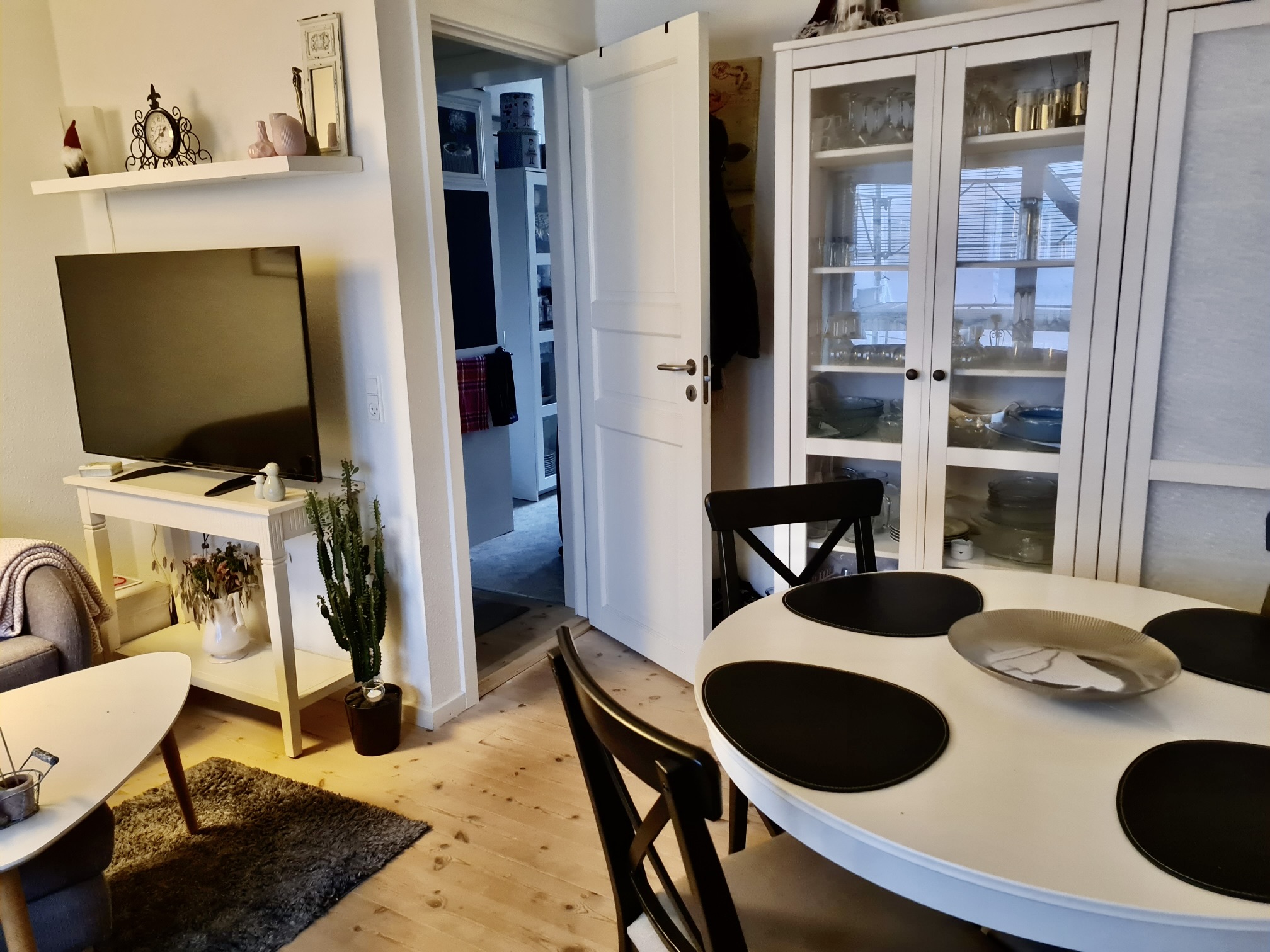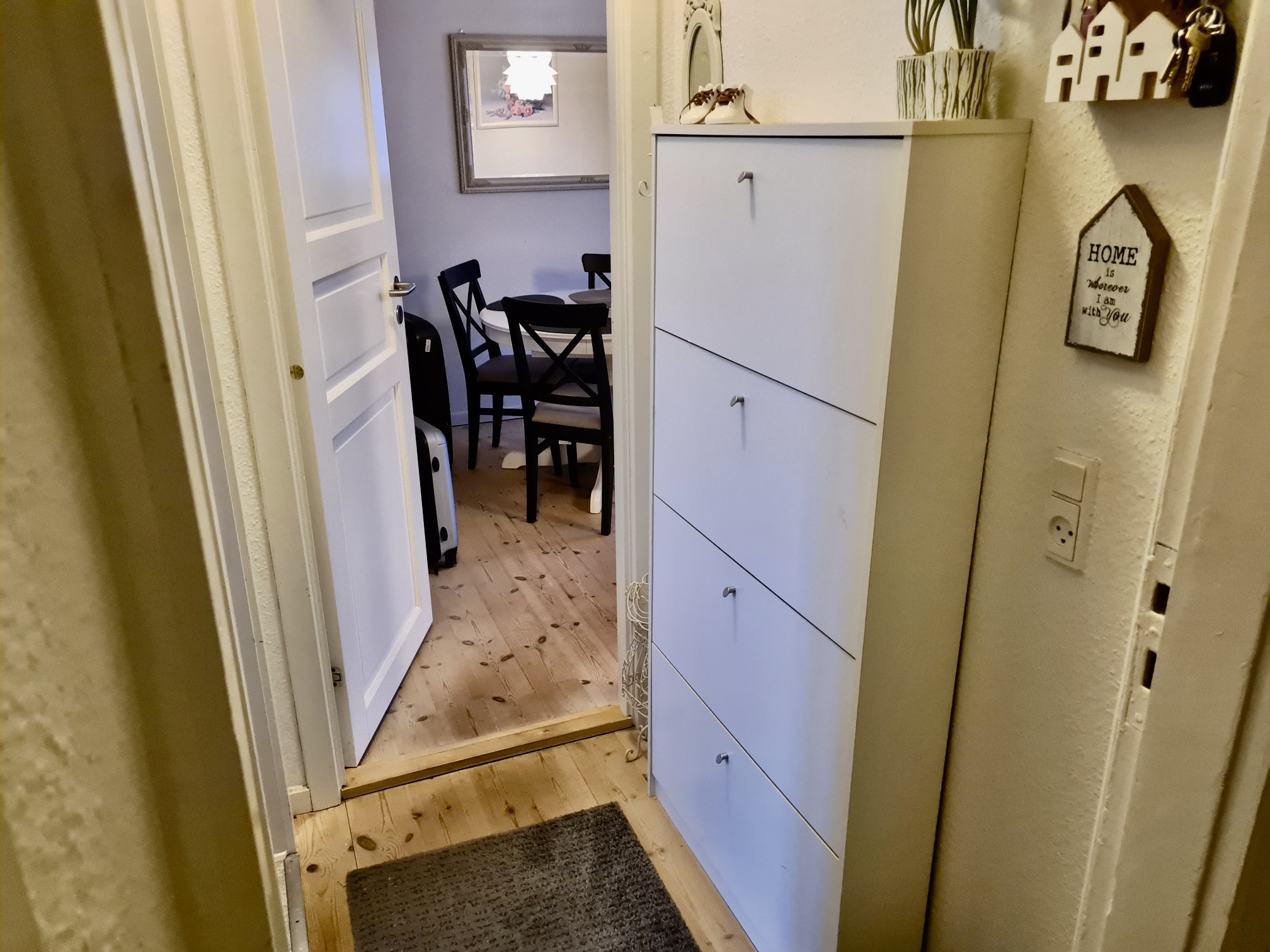 Lejligheden er bestående af en entré med god plads til overtøj. Fra entreen har vi adgang til alle lejlighedens rum. Vi har køkkenet, som er separat og har masser af skabsplads og bordplads. Så er der et badeværelse, hvor man kan købe noget ekstra opbevaring og sætte under håndvasken. I stuen kan man på billederne se, hvad der er plads til og det er alligevel en del. Dog vil det være mest optimalt med et rundt spisebord, som ses på billederne.