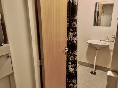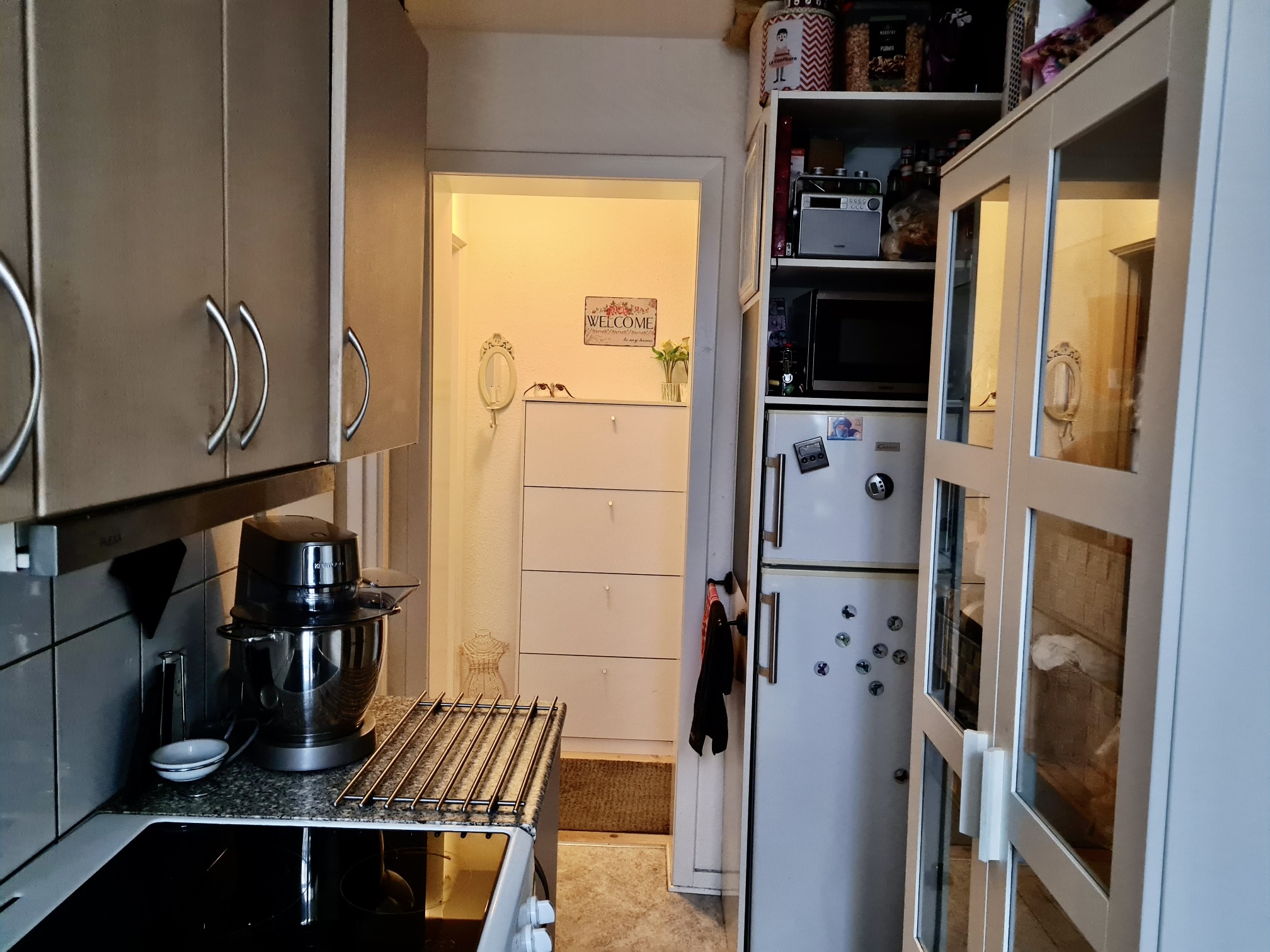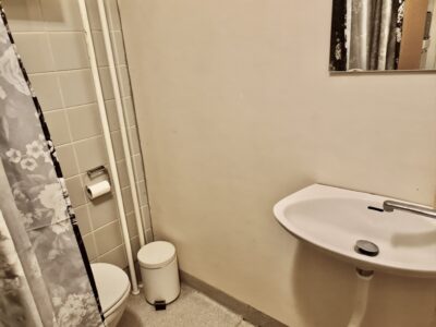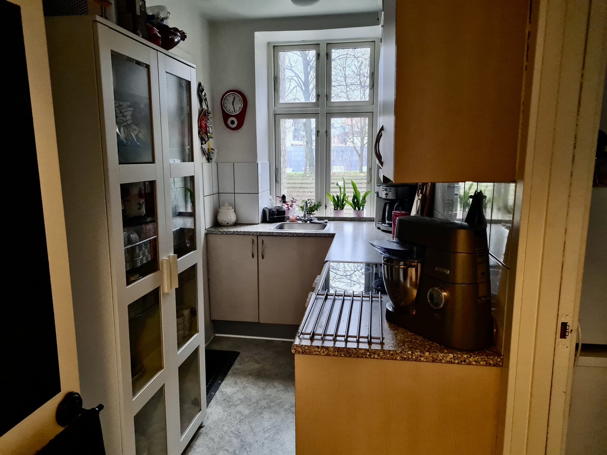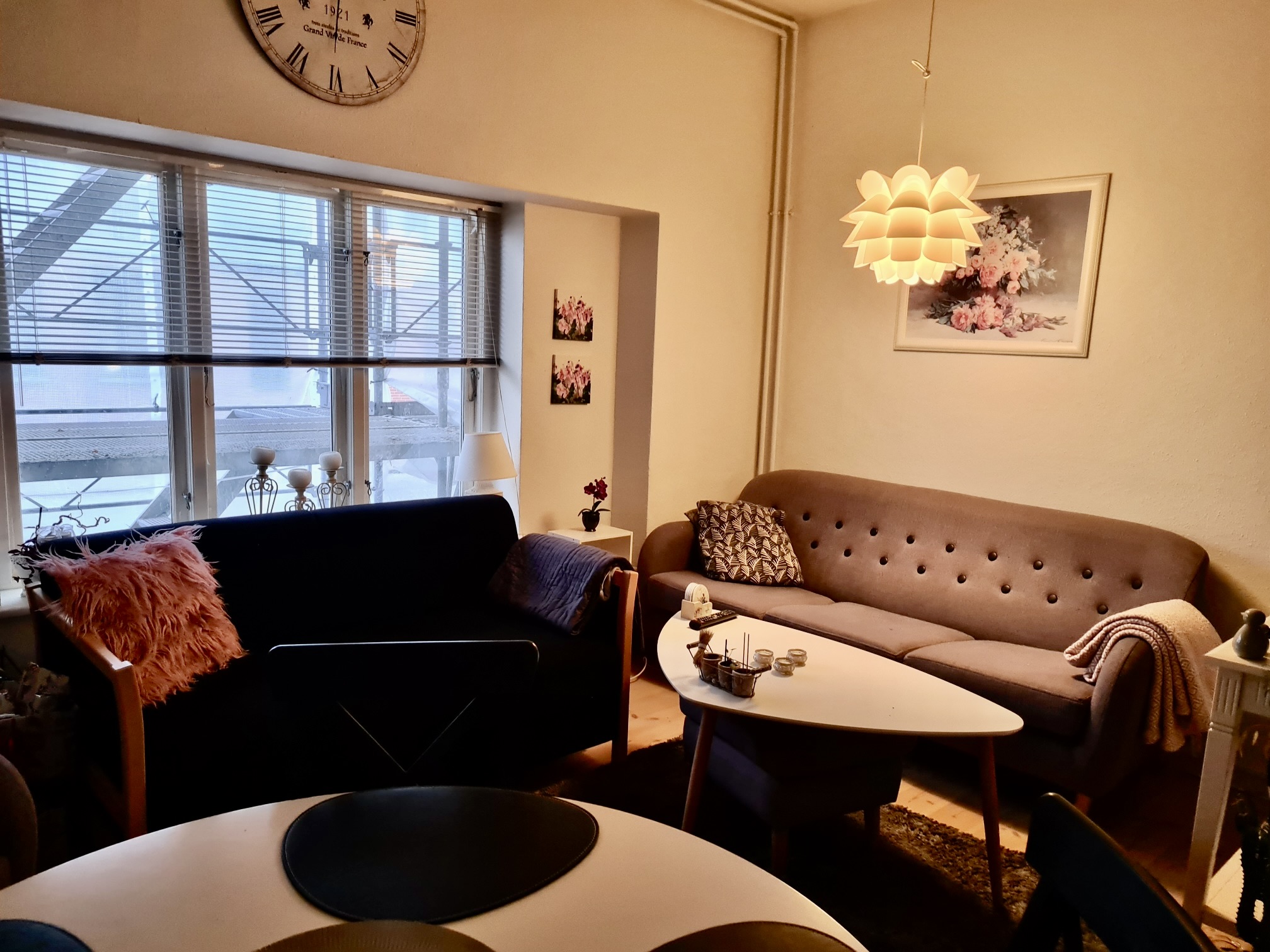 Lejligheden er bestående af en entré med god plads til overtøj. Fra entreen har vi adgang til alle lejlighedens rum. Vi har køkkenet, som er separat og har masser af skabsplads og bordplads. Så er der et badeværelse, hvor man kan købe noget ekstra opbevaring og sætte under håndvasken. I stuen kan man på billederne se, hvad der er plads til og det er alligevel en del. Dog vil det være mest optimalt med et rundt spisebord, som ses på billederne.