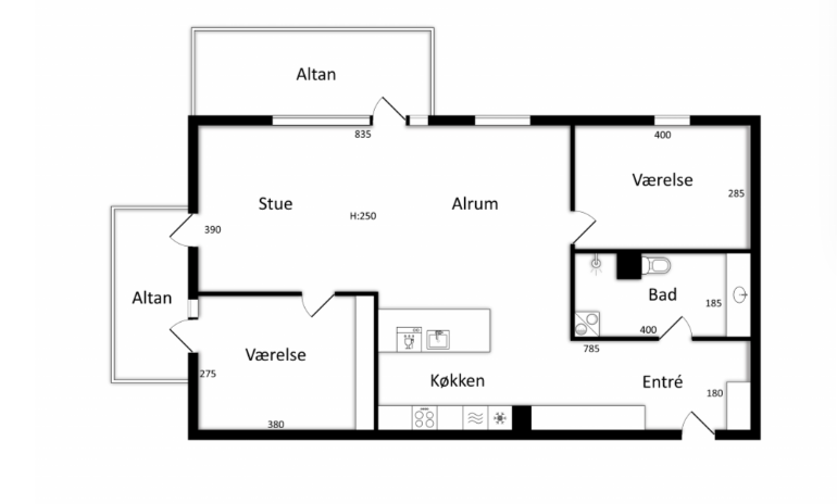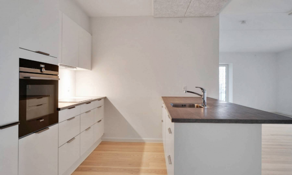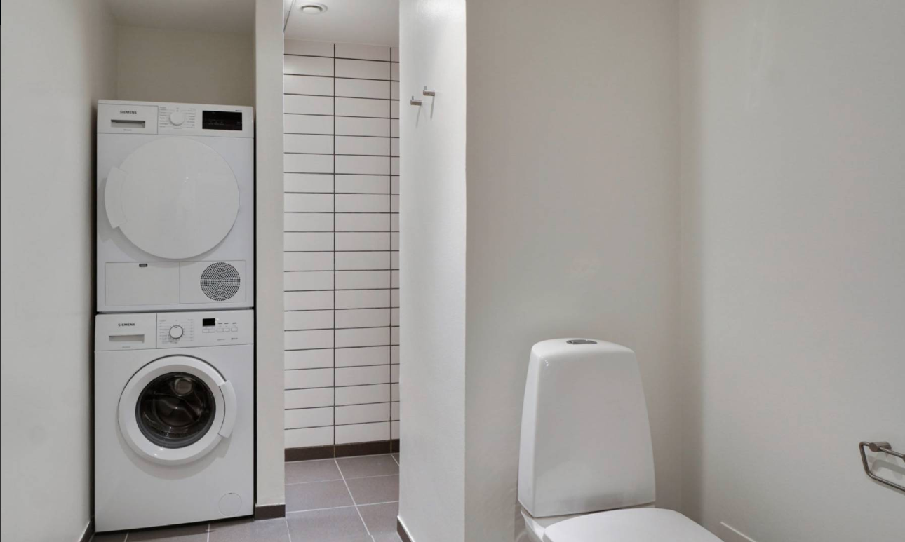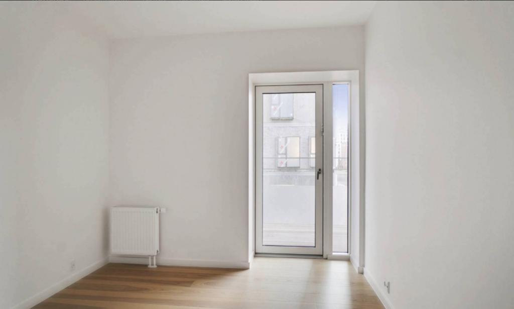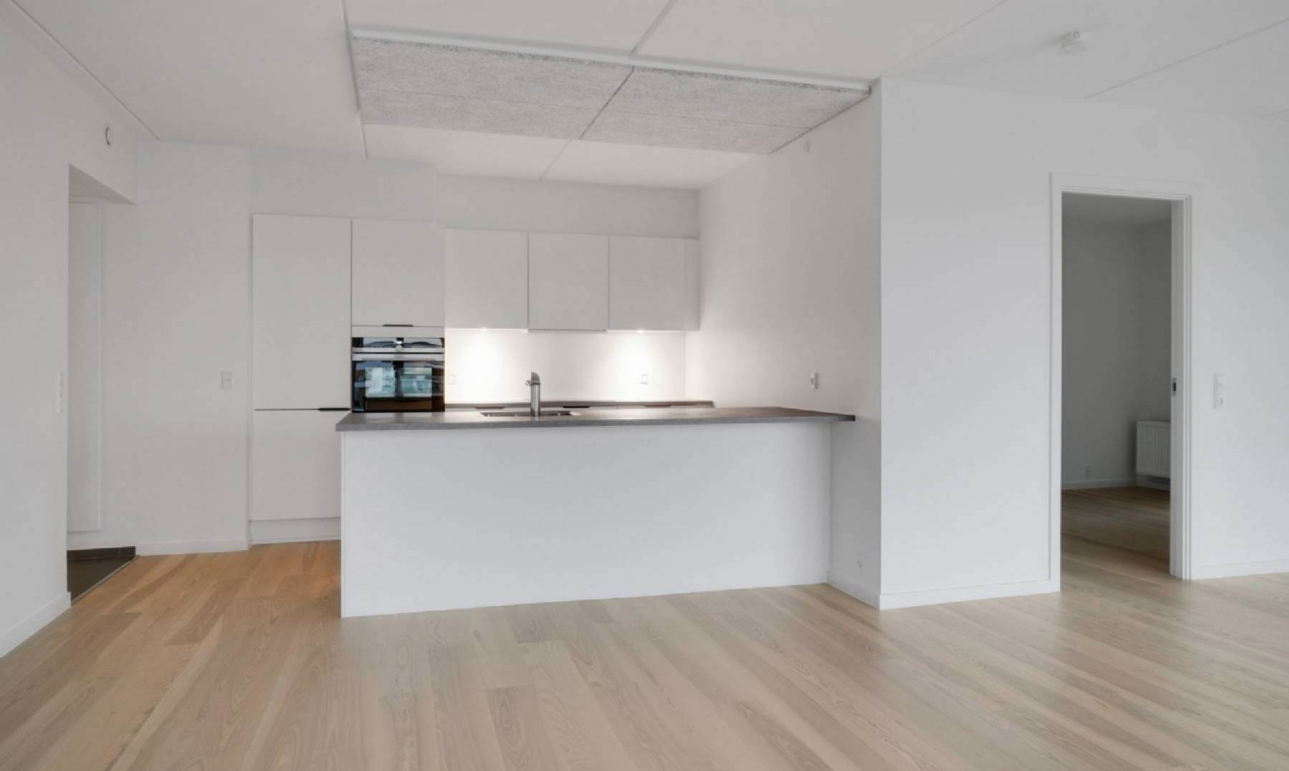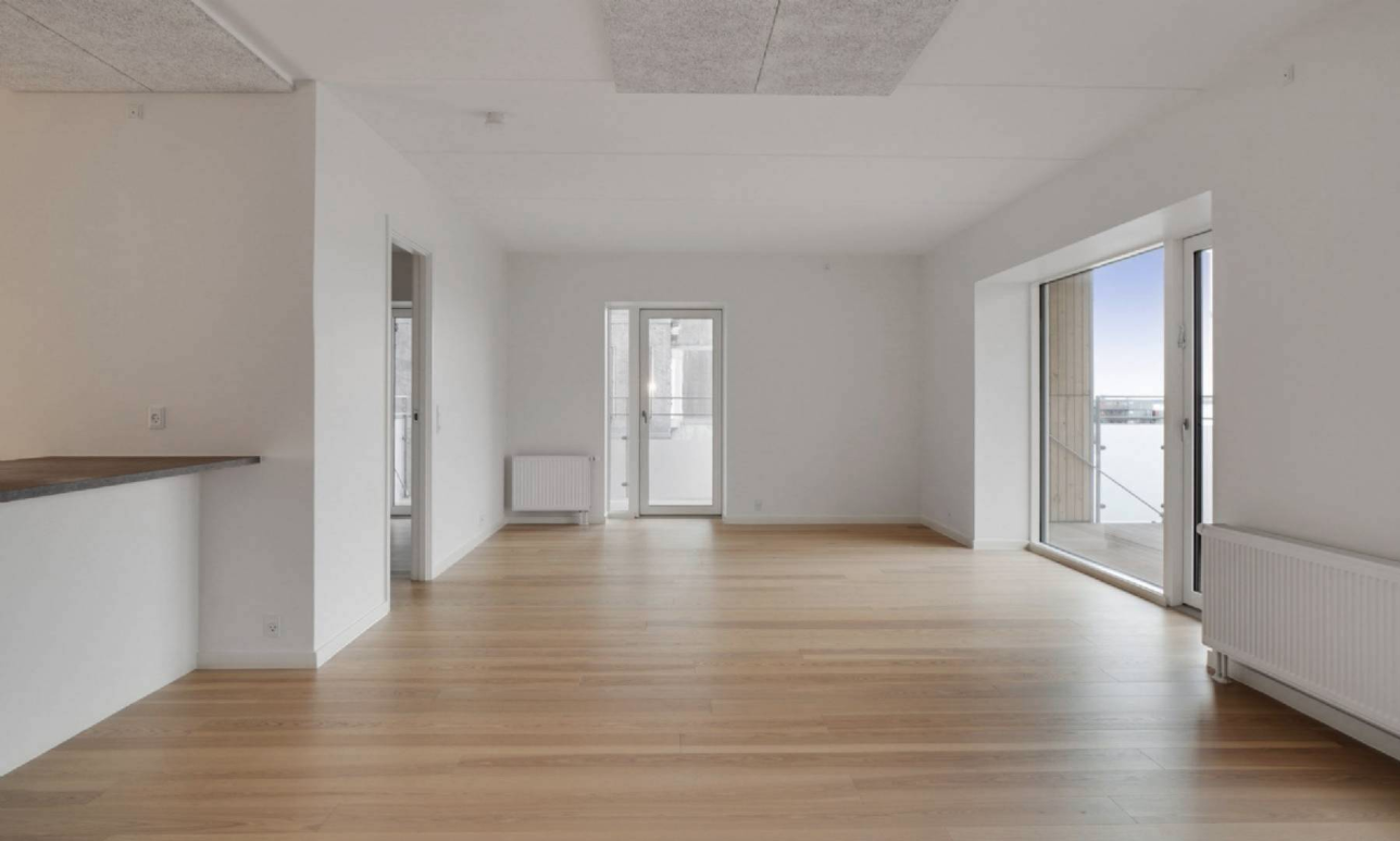 Lejligheden består af 1 stor stue, 2 soveværelser, et badeværelse med vaskesøjle, et køkken med køkken ø. Desuden består lejligheden af store vinduespartier fra gulv til loft og denne har hele 2 altaner.