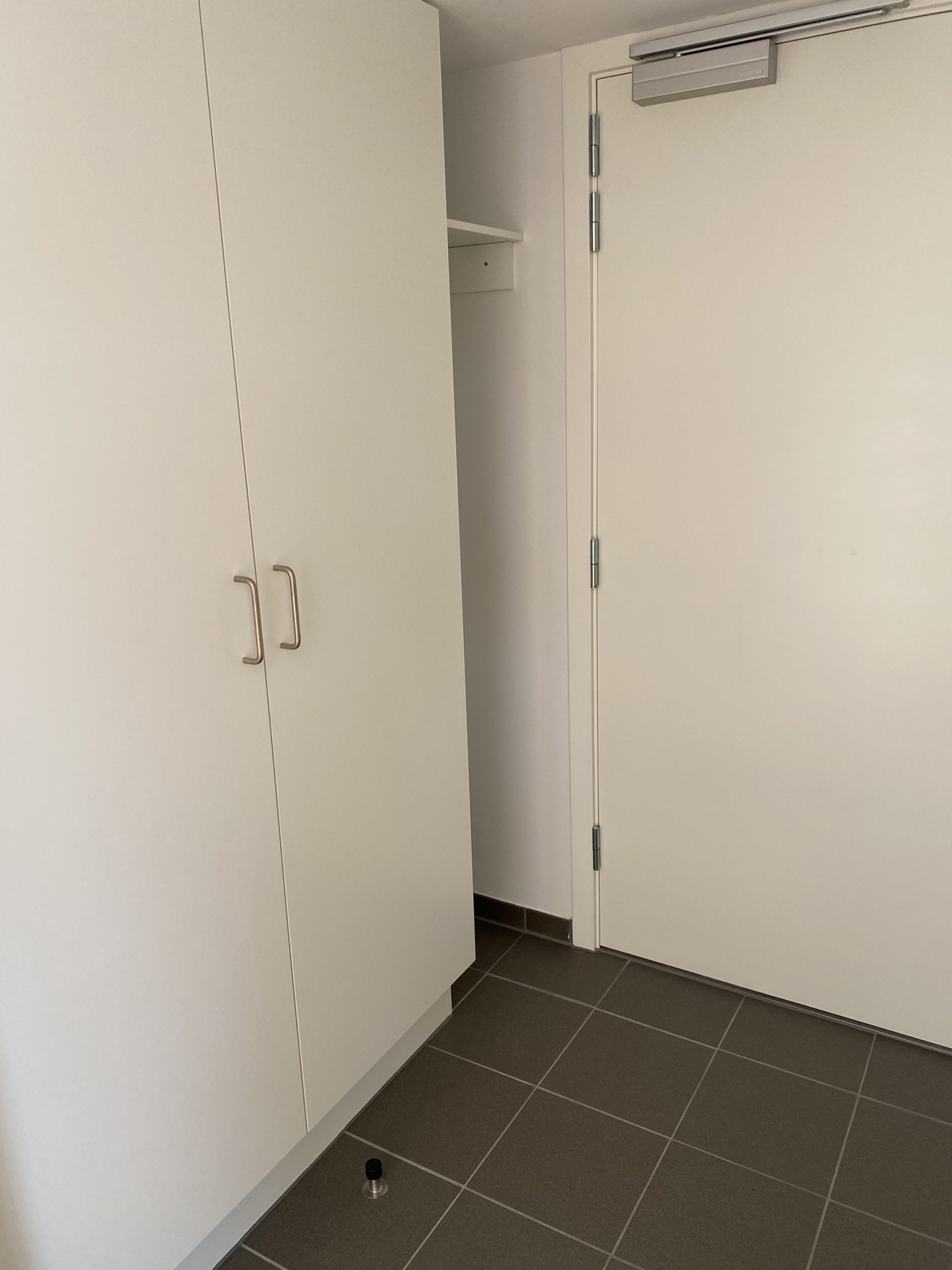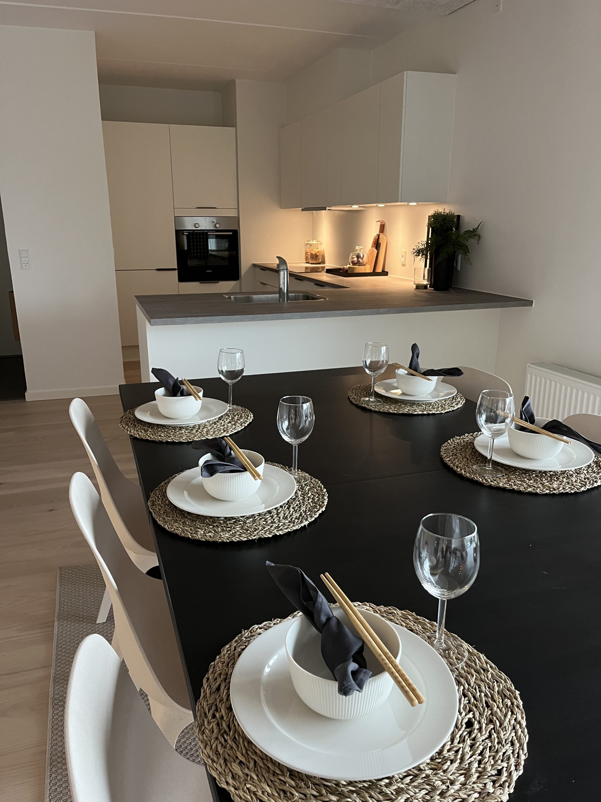 Køkkenet er udstyret med moderne hårde hvidevarer og smukke, funktionelle materialer, som gør madlavningen til en fornøjelse. Badeværelset er stilrent indrettet og tilbyder god plads til både opbevaring og komfort.