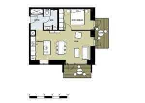 OBS: Billeder fra badeværelse og værelse er fra en lignende lejlighed og er udelukkende for at illustrere materialevalget. Se plantegning for korrekt indretning.