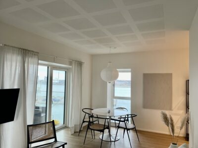 Denne skønne og moderne lejlighed er 98 kvm, og fordeler sig over et entréområde, et dejligt opholdsrum bestående af kombineret køkken-alrum med stue, 2 gode værelser med masser af lys, og et moderne og lyst badeværelse med vaskesøjle. Man træder ind i entreen, hvor man på højre hånd har de to værelser. Fortsætter man lige ud kommer man til badeværelset. Derfra kan man gå til venstre ud i det dejlige køkken-alrum med udgang til den dejlige store altan.