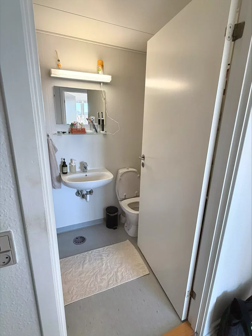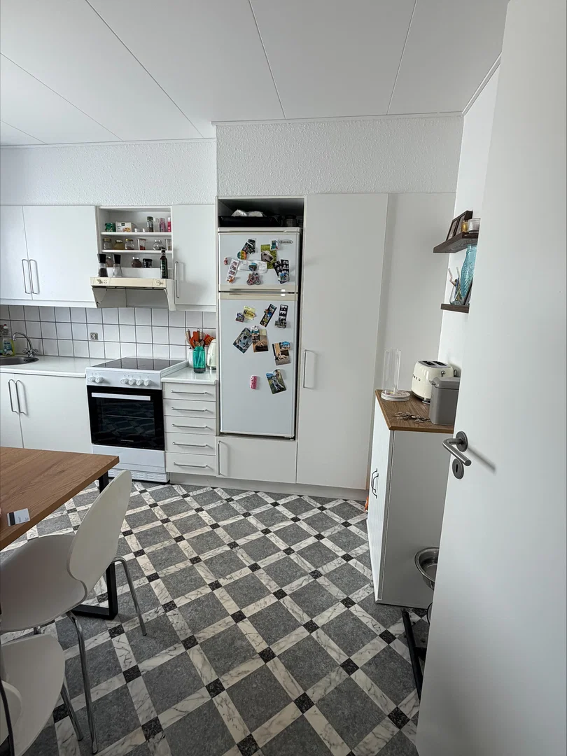 Lejligheden er på 55 m2 og byder på en klassisk 2-værelses planløsning. Entréen er praktisk indrettet med væghængte skoskabe og knagerække, hvilket giver et ryddeligt udtryk. Det lyse opholdsrum har store vinduer, der skaber et dejligt lysindfald, perfekt til indretning med sofa og tv-møbel. Fra vinduet kan du nyde et fint kig over kvarterets tage. Køkkenet er tidløst og funktionelt med hvide elementer, god skabsplads samt komfur/ovn og køle/frys. Her er også plads til et spisebord, ideelt til både hverdag og gæster. Badeværelset er enkelt med toilet, håndvask og bruseniche, og de lyse materialer gør det nemt at holde.