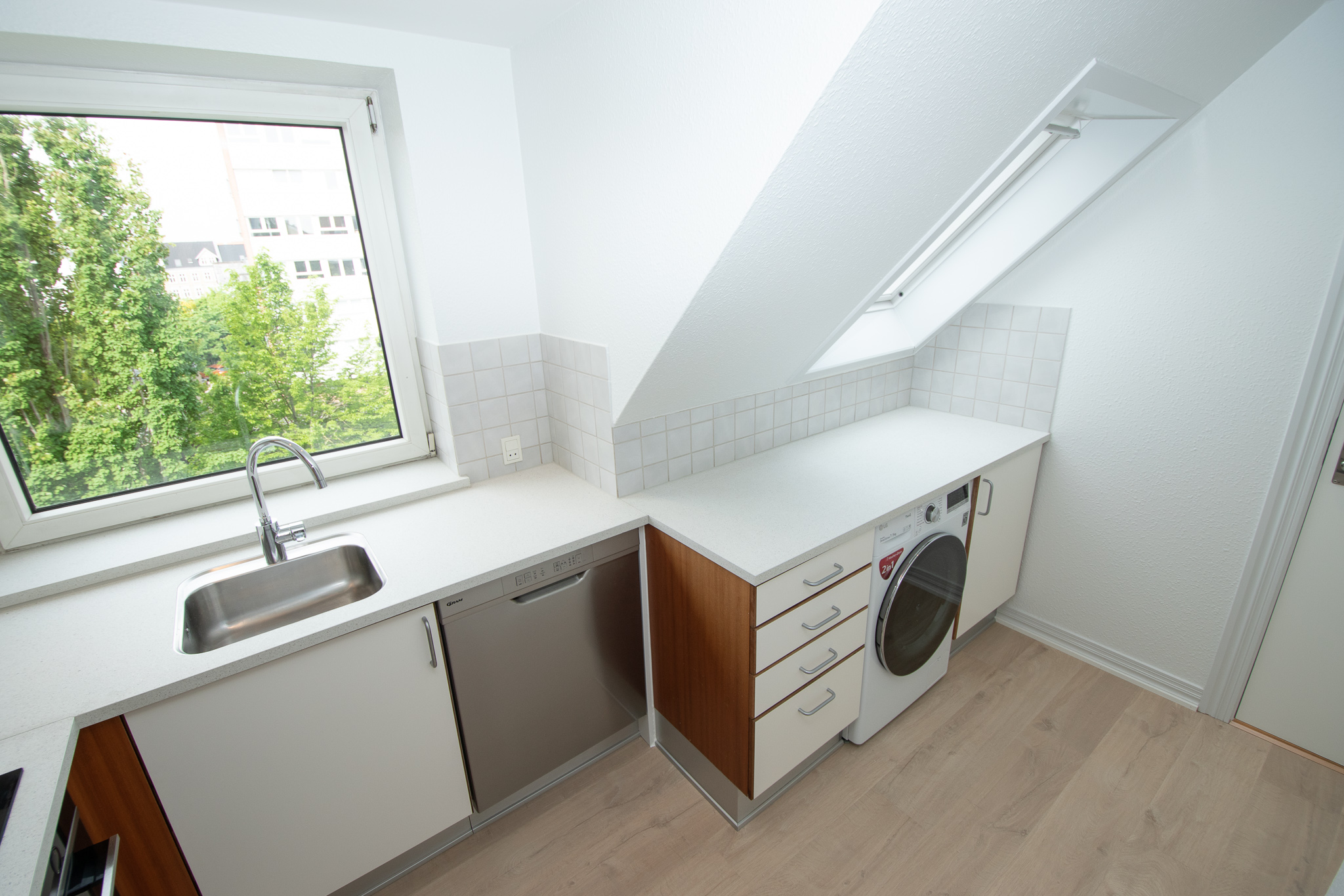 Lejligheden byder på en rummelig og lys entré, der giver et godt førstehåndsindtryk. Det store køkken er udstyret med moderne køkkenelementer, herunder greb i stål og rustfri hårde hvidevarer som opvaskemaskine, kombi vaskemaskine/tørretumbler samt køle-/fryseskab. Stuen er hyggelig og let at indrette, hvilket skaber en indbydende ramme for afslapning. De to store soveværelser har plads til dobbeltseng og skab, hvilket gør dem ideelle til både hvile og arbejde. Badeværelset er elegant indrettet med hvide fliser, muret bruseniche og gulvvarme, der sikrer komforten hele året rundt.