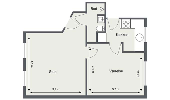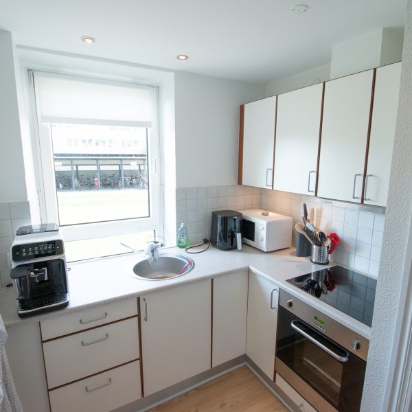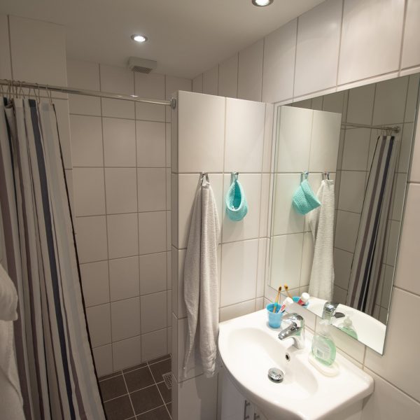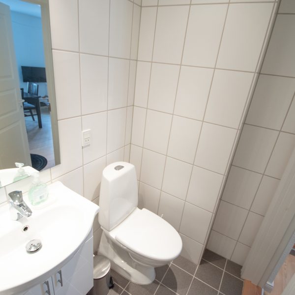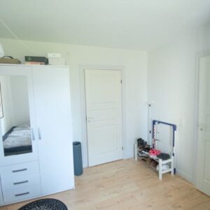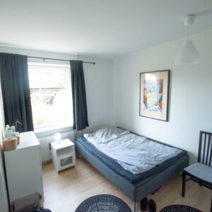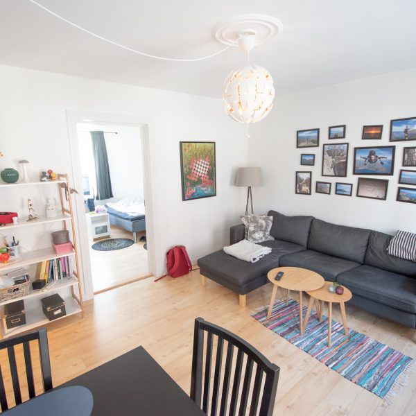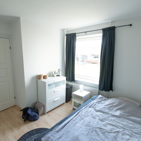 Stuen er lys og let at indrette, med et behageligt lysindfald, mens soveværelset har plads til både dobbeltseng og klædeskab.