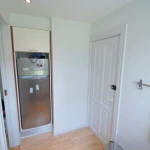 Du træder ind i en åben entré med plads til overtøj og videre ind i det elegante køkken, som er indrettet med moderne elementer i tidløst design. Her får du greb i stål, stålsokkel og alt i hårde hvidevarer – alle i rustfrit stål: køle-/fryseskab, indbygningsovn med varmluft, glaskeramisk kogeplade, frithængende emhætte samt halogenspot i loft og under overskabe.