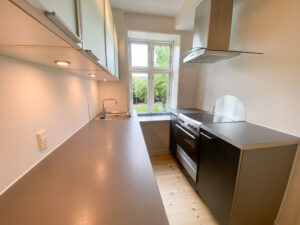 Køkkenet er pænt og praktisk indrettet i en moderne koksgrå farve og byder på alt i hårde hvidevarer, herunder opvaskemaskine. Her er både god skabsplads og plads til madlavning i hverdagen – perfekt til dig, der sætter pris på funktionalitet og æstetik i ét.
