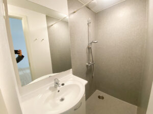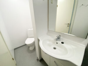 Badeværelset er rummeligt og velholdt med en stor bruseniche, som giver en komfortabel og afslappende oplevelse i det daglige. Her er der god plads til opbevaring, og det hele fremstår lyst og indbydende.