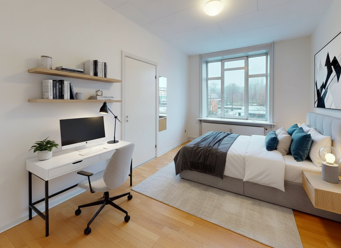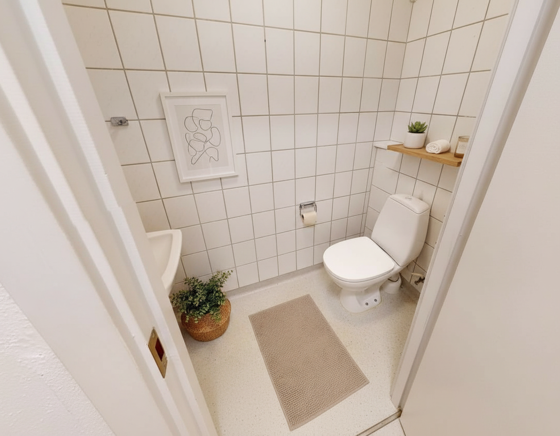 Lejligheden byder på fire gode og lyse værelser, alle udstyret med store vinduespartier, der skaber et dejligt lysindfald. Det funktionelle køkken er praktisk indrettet, hvilket gør det nemt at tilberede måltider, mens badeværelset er smart opdelt i bad og toilet, hvilket er ideelt i en delebolig. Selvom standens er enkel og præget af almindeligt slid, tilbyder lejligheden en stor og delevenlig plads til en attraktiv pris.