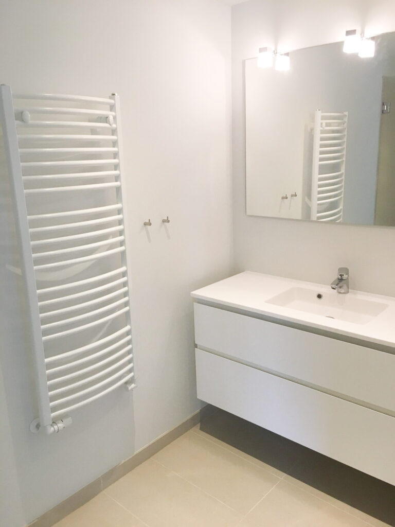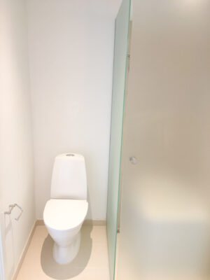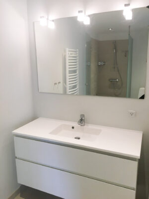 Lejlighedens badeværelse er udstyret med bruseniche med glasvæg samt vaskeskab. Der er installeret følgende: