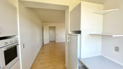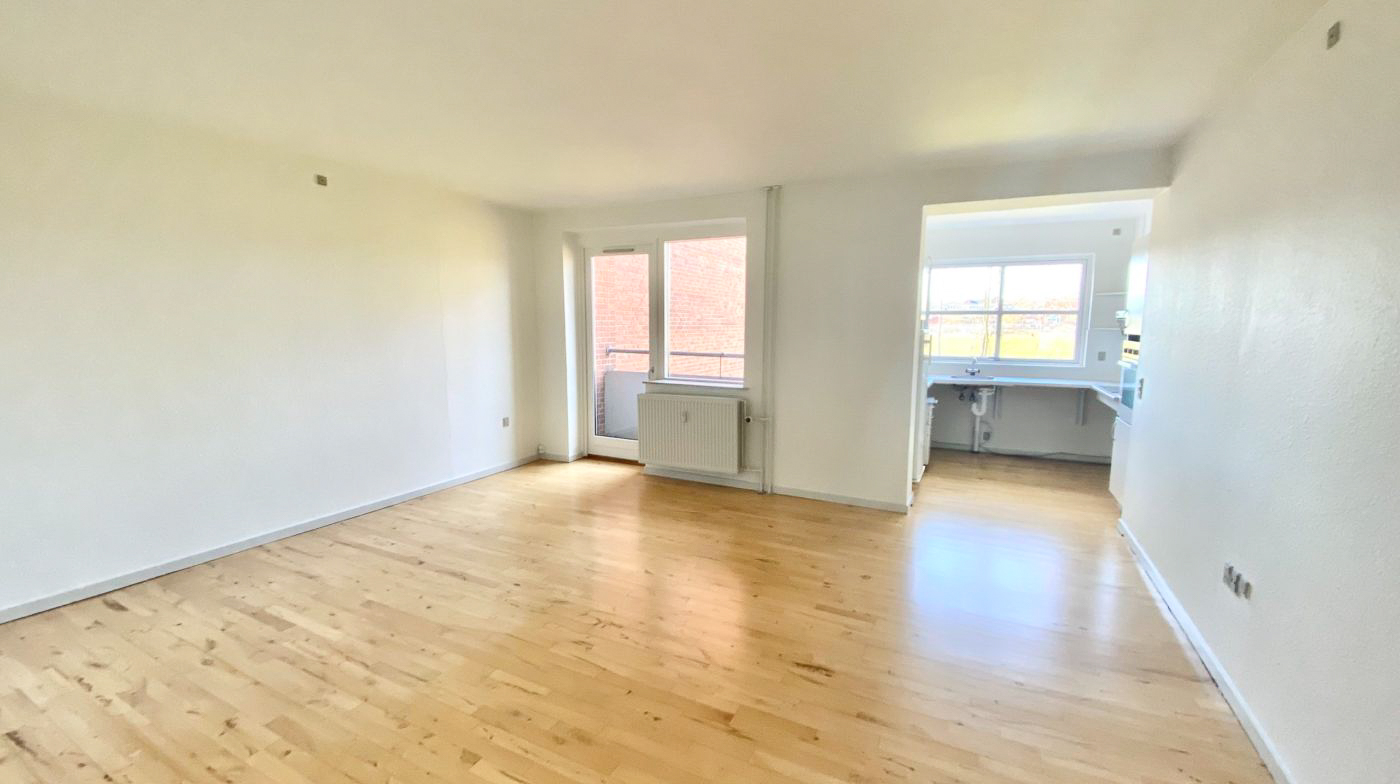 Køkkenet er veludstyret med hvidevarer og ligger i åben forbindelse med stuen, hvilket skaber et åbent og indbydende miljø. Lejligheden er gennemført med flotte, lakerede parketgulve, der giver en varm og elegant stemning.